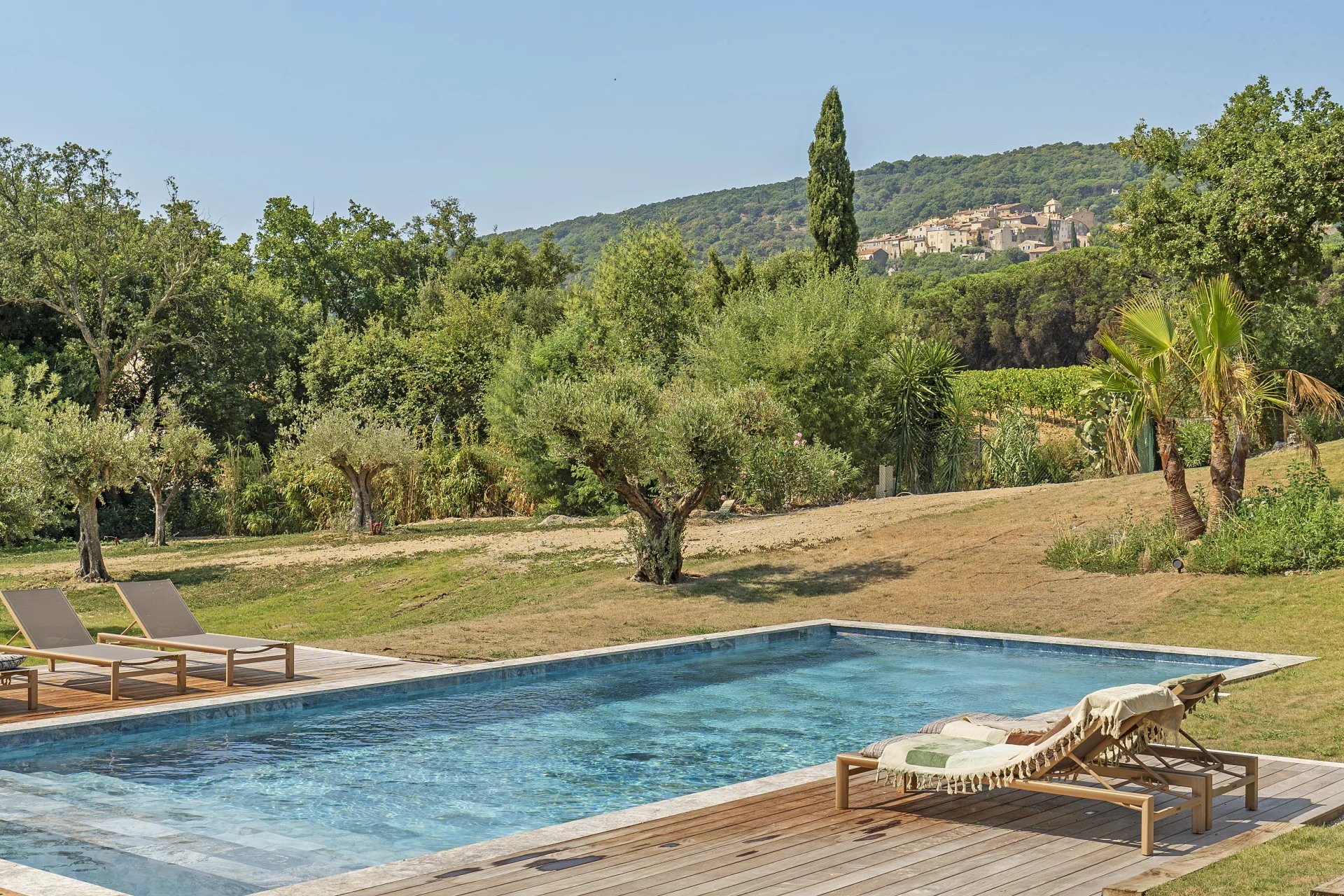 Outside, the heated Bali stone swimming pool and its pool house blend harmoniously into the Mediterranean garden.