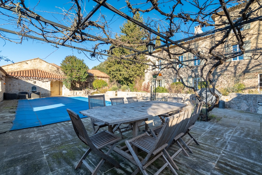 A haven of light and conviviality In front of the main house, in the shade of a vine-covered arbour, a heated swimming pool (12 x 5 m) seems to dance under the reflections of the Provencal sun. Its adjacent pool house invites you to long summer evenings, where laughter and conversation mingle with the song of the cicadas.