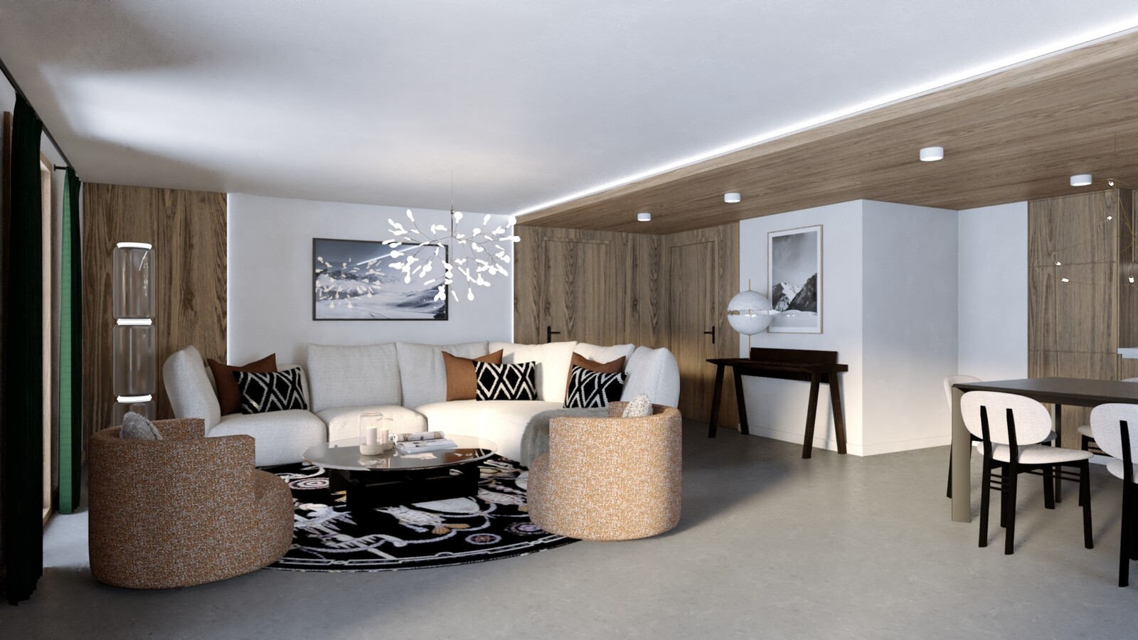 Designed to blend harmoniously with its surroundings, L’Écrin du Diamant draws inspiration from traditional Savoyard chalets. It features natural wood façades and elegant white render, while expansive glass windows flood the interiors with light. Overhanging roofs shelter balconies and terraces, adding to the authentic mountain aesthetic. The design seamlessly combines contemporary elegance with a warm, inviting atmosphere, using high-quality materials throughout.