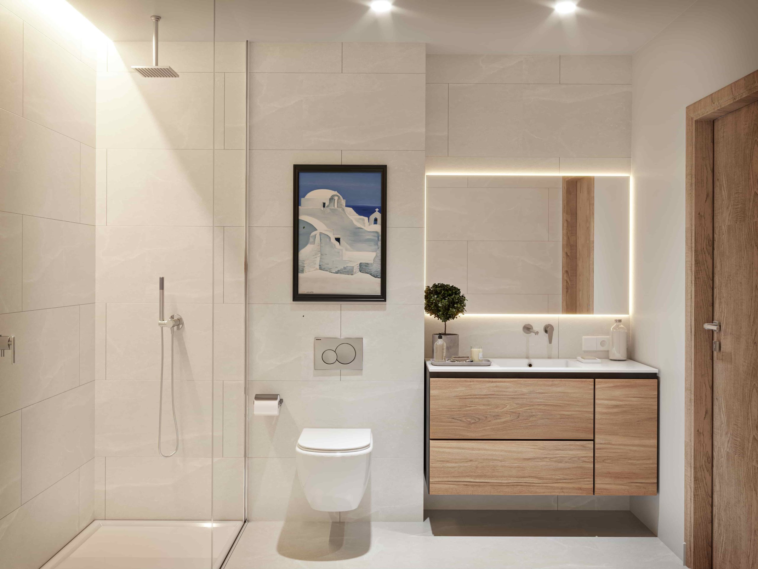 - Wooden wall-hung units in bathrooms, equipped with modern fixtures including showers with recessed taps