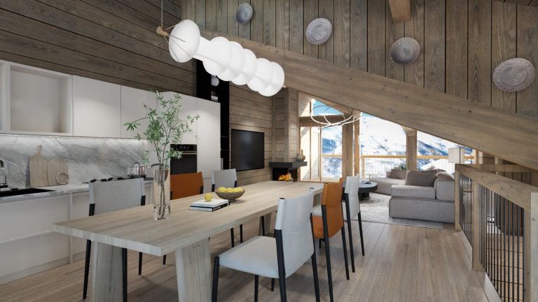 Drawing inspiration from Tignes’ architectural heritage, Isberg seamlessly blends contemporary style with traditional Alpine charm. The multi-layered facade ensures mountain views from every apartment, while the open-plan interiors are designed for spacious and light-filled living.