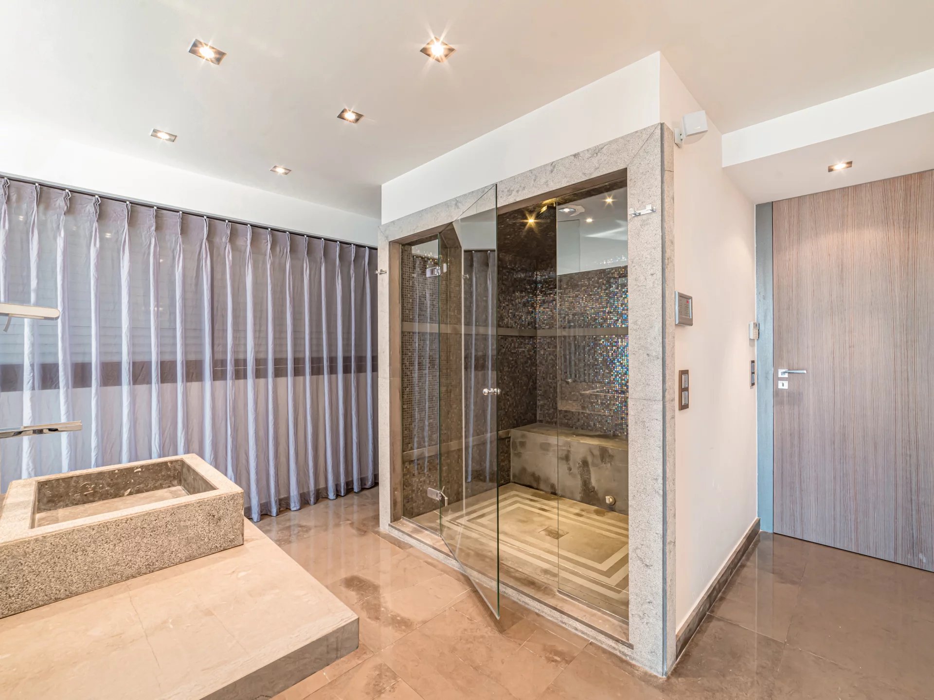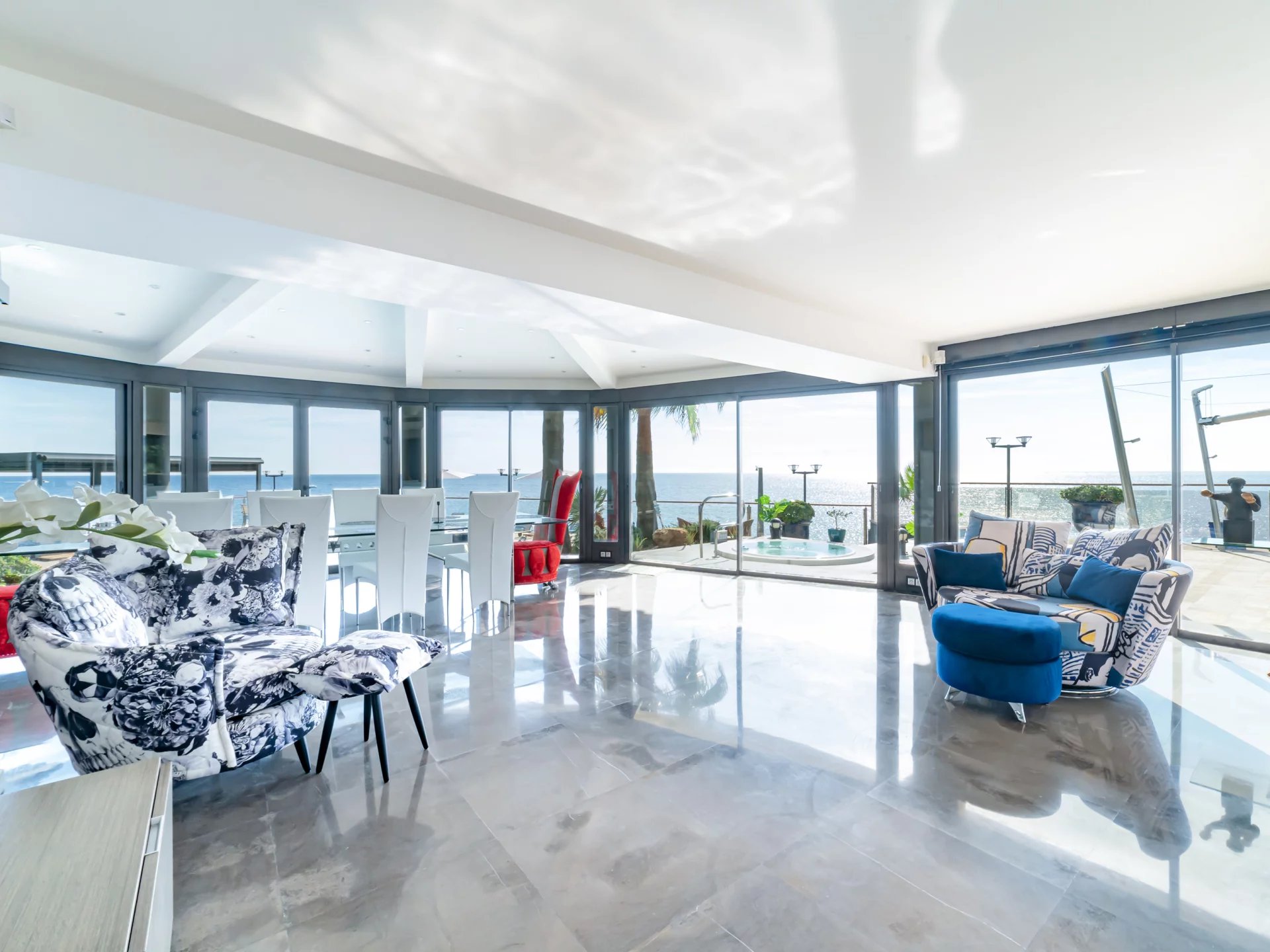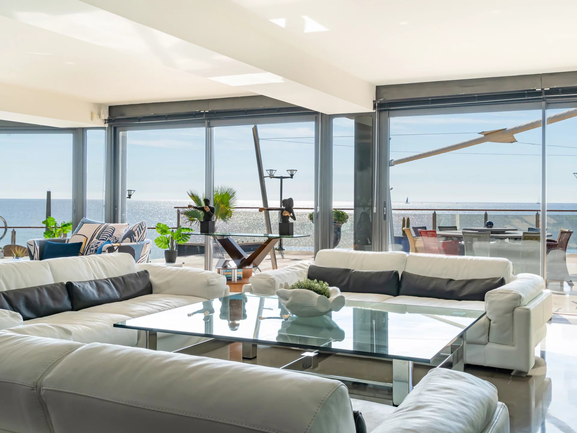 The villa has generous volumes with a living surface of 266 m2, including in particular a large reception room opening entirely onto the outside and 3 large bedroom suites. The whole set on a manicured land of a surface of 1040 m2 with heated jacuzzi and swimming pool, surrounded by the sea just like a peninsula.