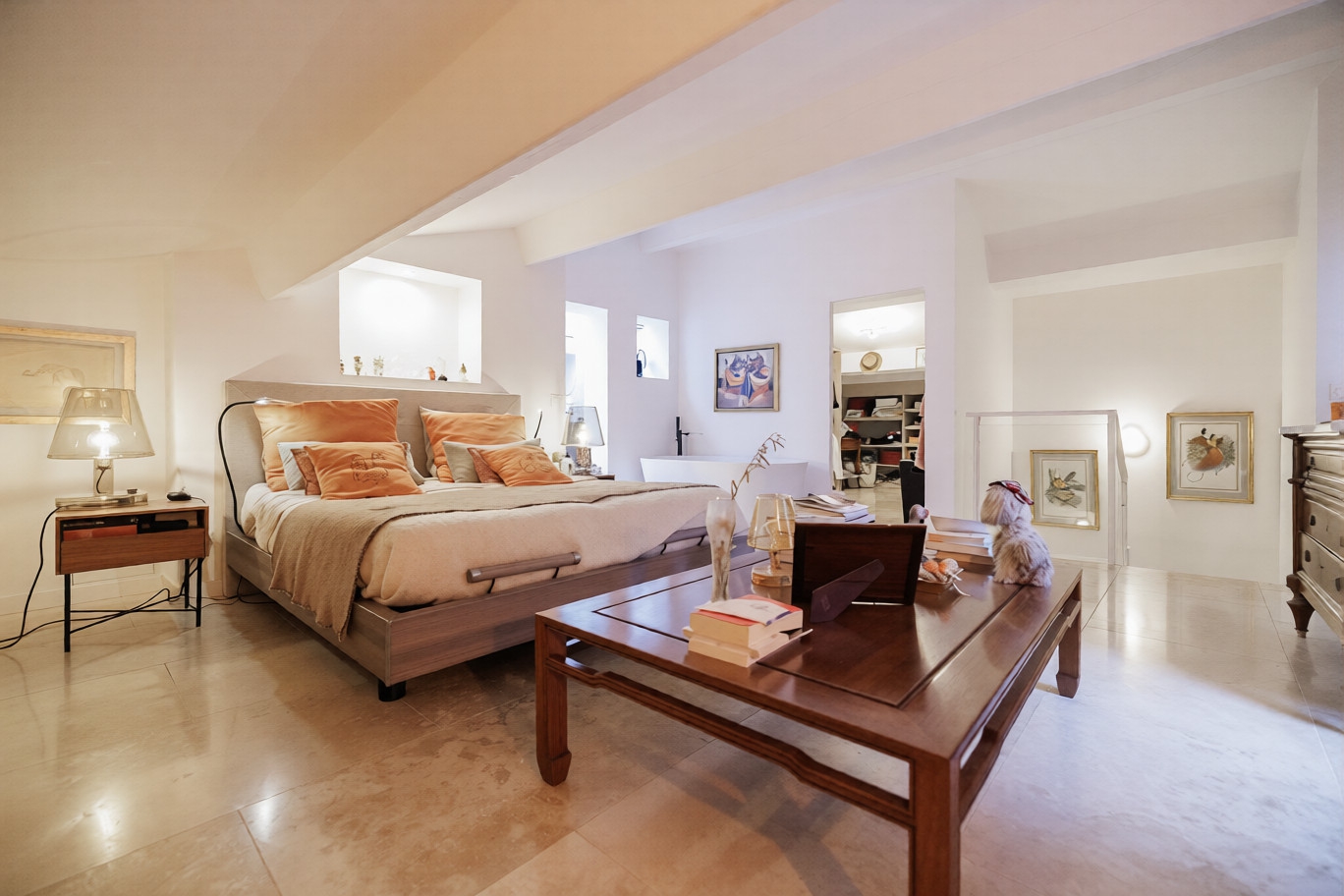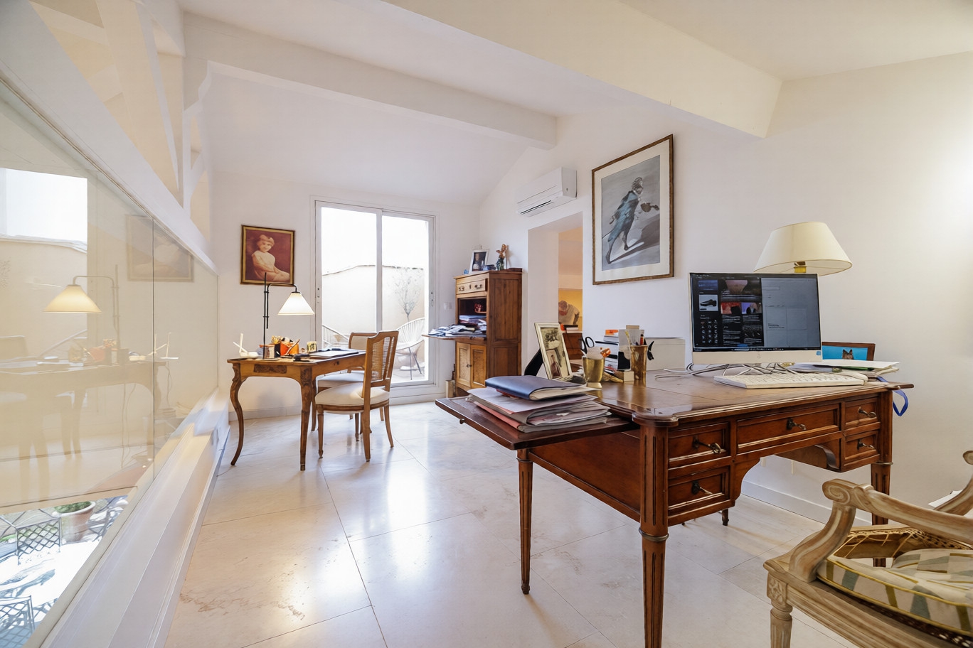 Upstairs, the atmosphere becomes even more private. The light-filled master bedroom opens onto its own private terrace, offering an unobstructed and peaceful view. It extends into a bathroom with a shower and a custom-made dressing room, a true haven for your belongings. A second guest bedroom also benefits from its own private terrace. Above, a glass-enclosed mezzanine, fitted with built-in storage, creates an inspiring space, ideal as an office, reading room, or creative studio.