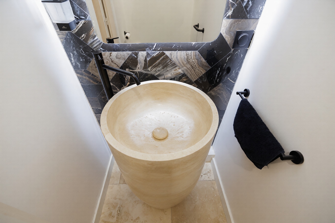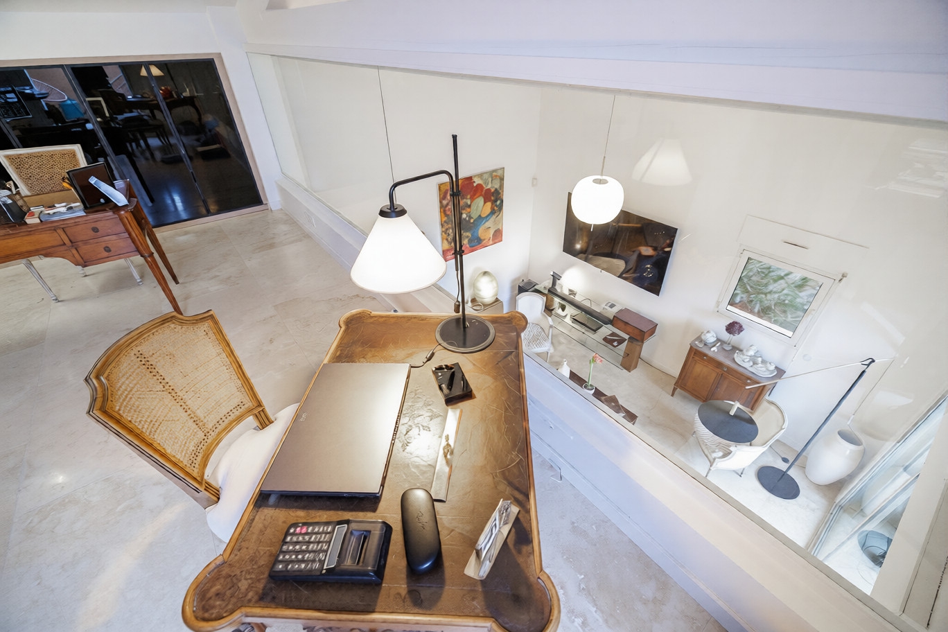 The decidedly high-end amenities underscore the exclusive character of the property: travertine floors, bespoke dressing room, kitchen with marble countertops, sculptural glass staircase, stone washbasins, reversible air conditioning, and a reinforced front door.