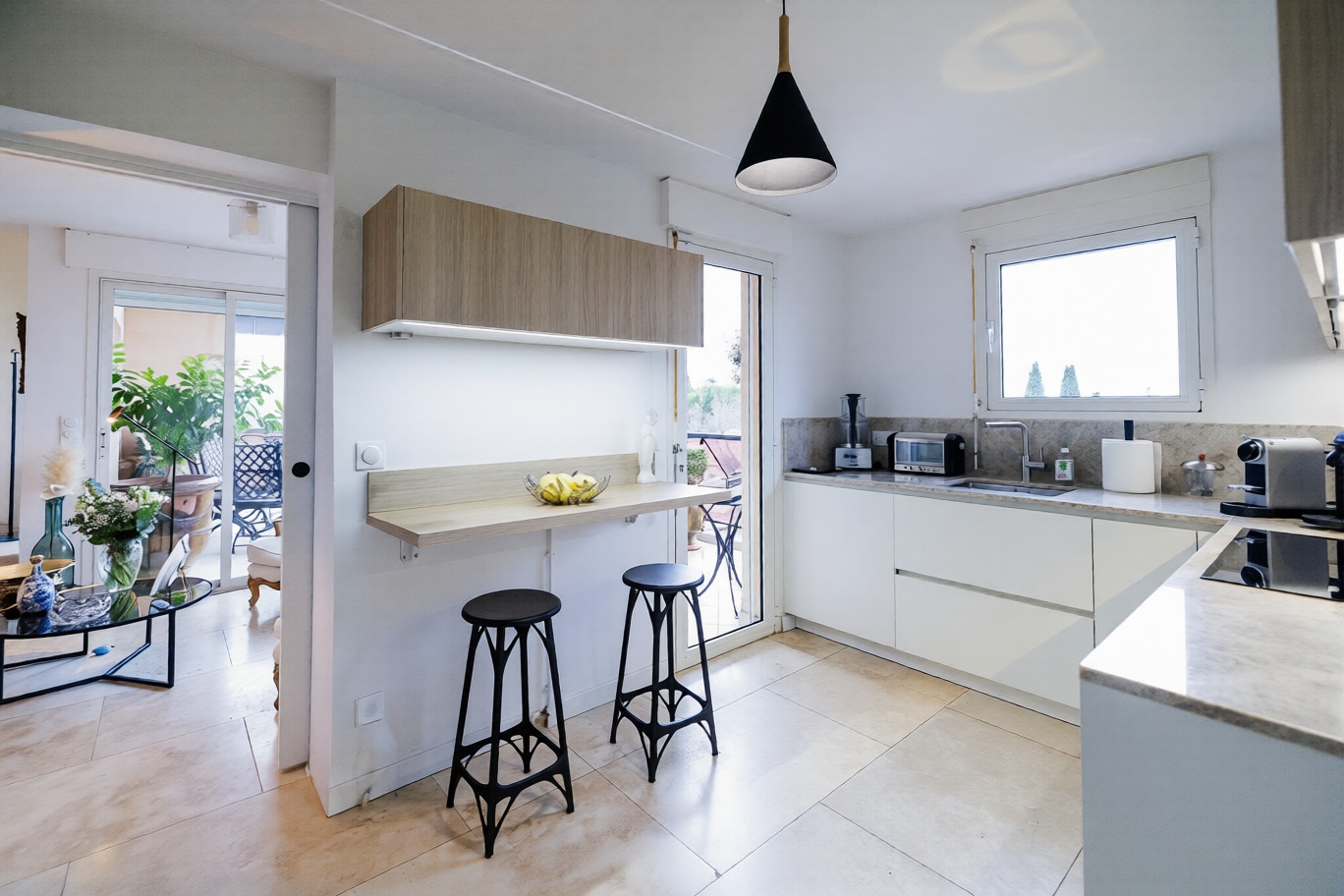 From the moment you enter, your gaze is drawn to the generous proportions. The vast living room, enhanced by a remarkable ceiling height, unfolds its elegant lines in an atmosphere that is both contemporary and welcoming. The French doors open onto a 30 m2 terrace, a veritable balcony overlooking the horizon, where the unobstructed view invites you to contemplate the sunsets. The separate kitchen combines refinement and functionality, extending into a back kitchen that includes a discreet laundry room. A guest bedroom with its own bathroom and private rooftop terrace creates an intimate space, designed as a self-contained suite.