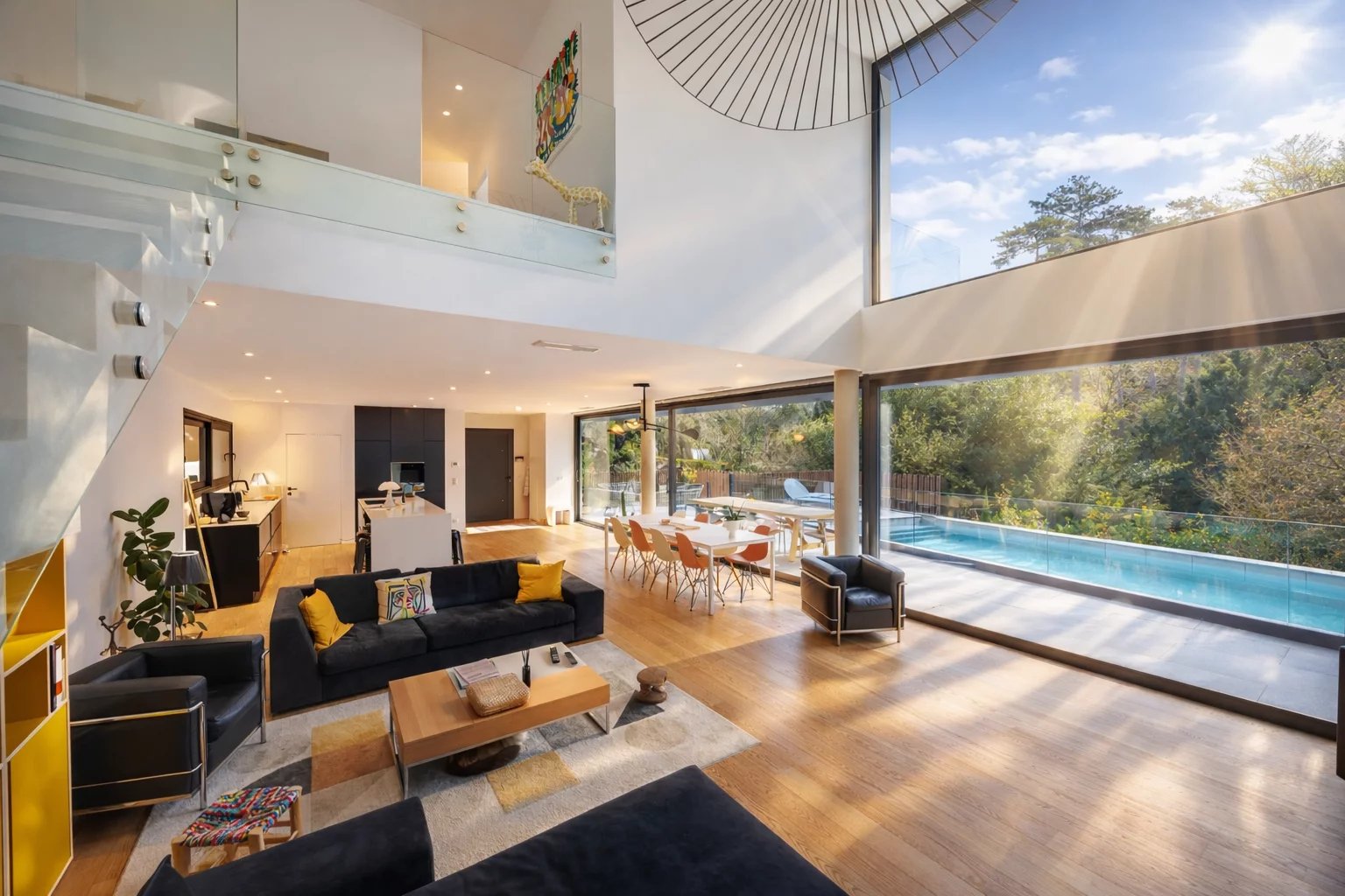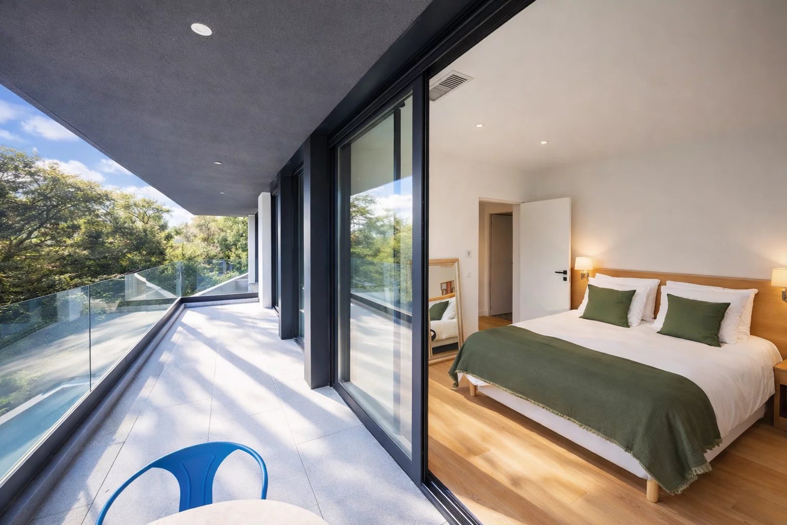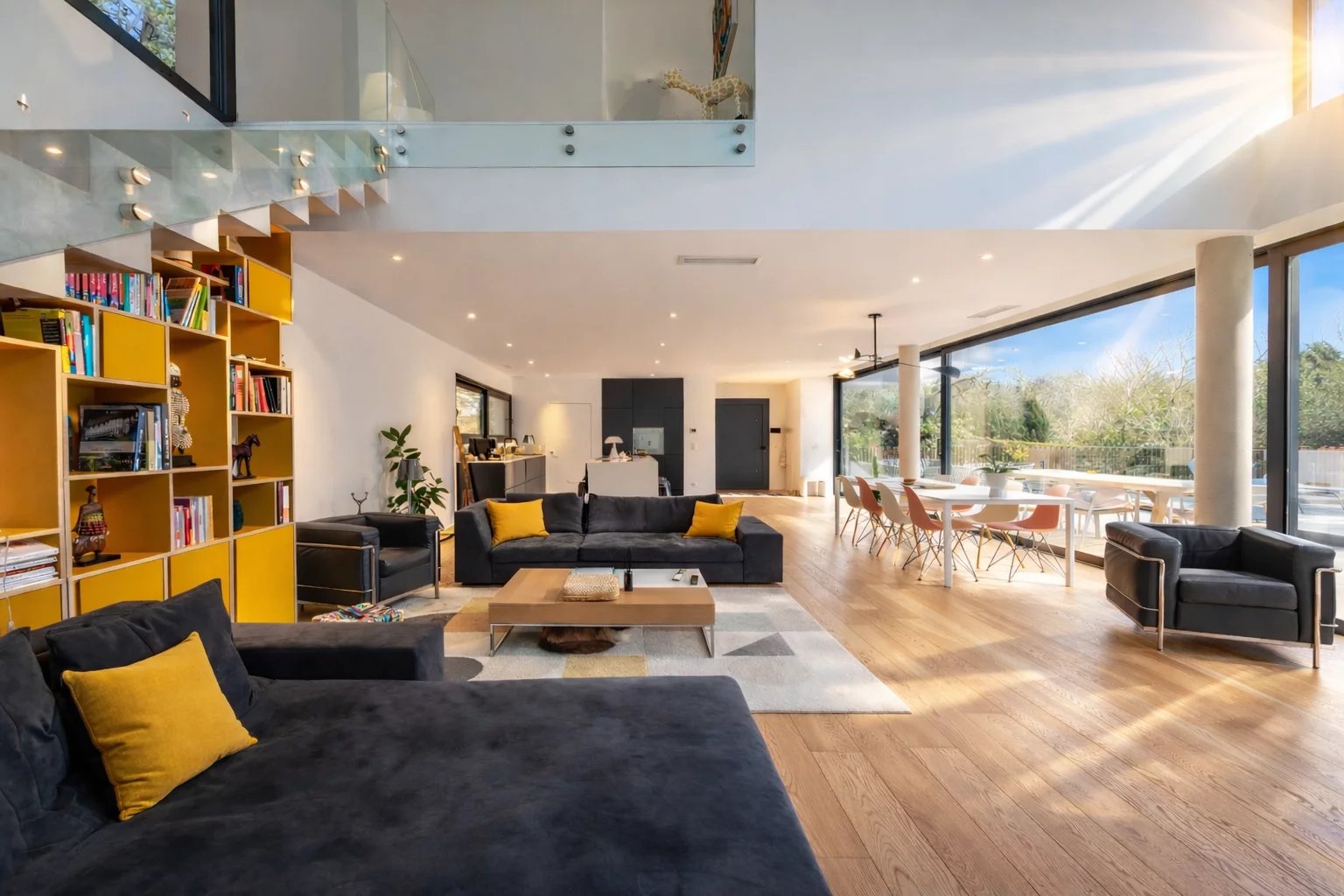 Full-length glazed openings across the facade, flooding the interiors with natural light