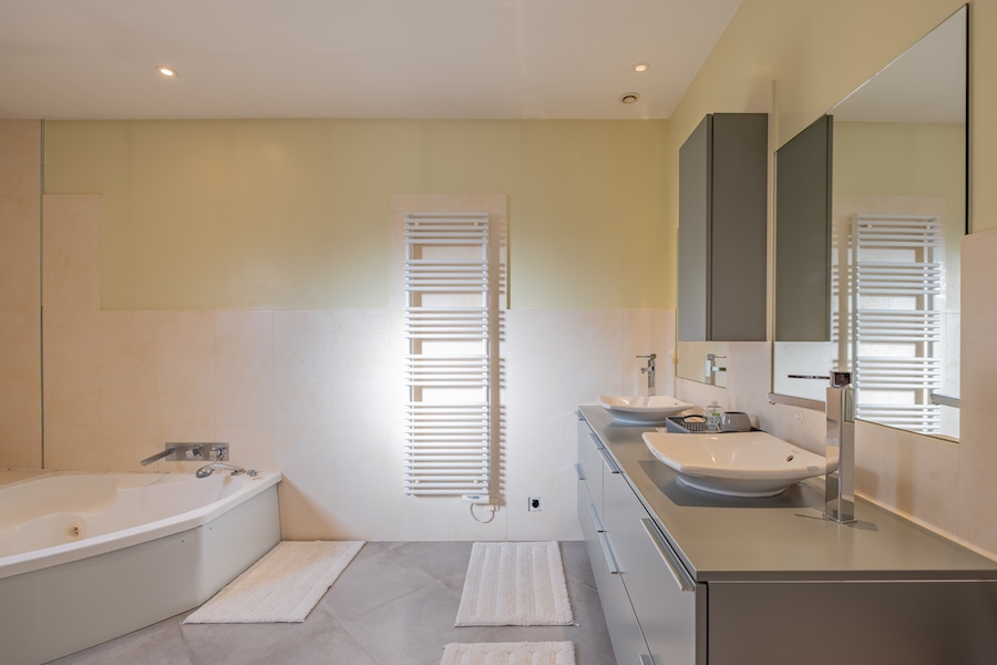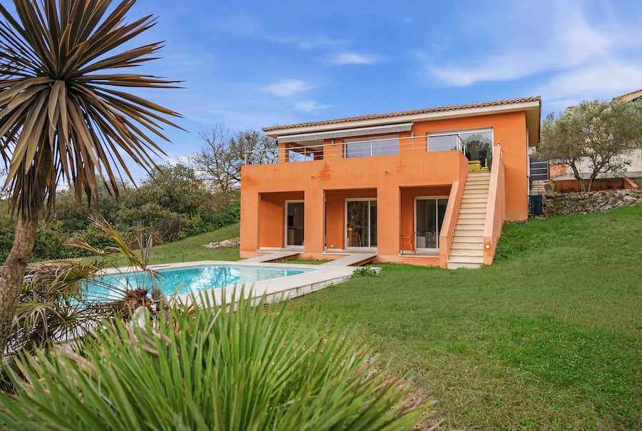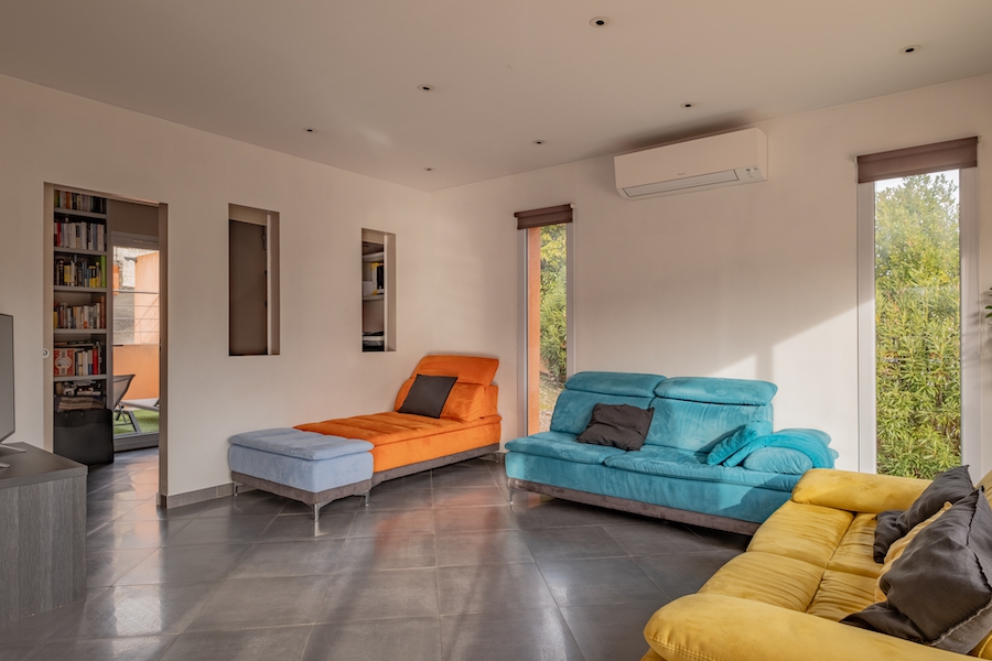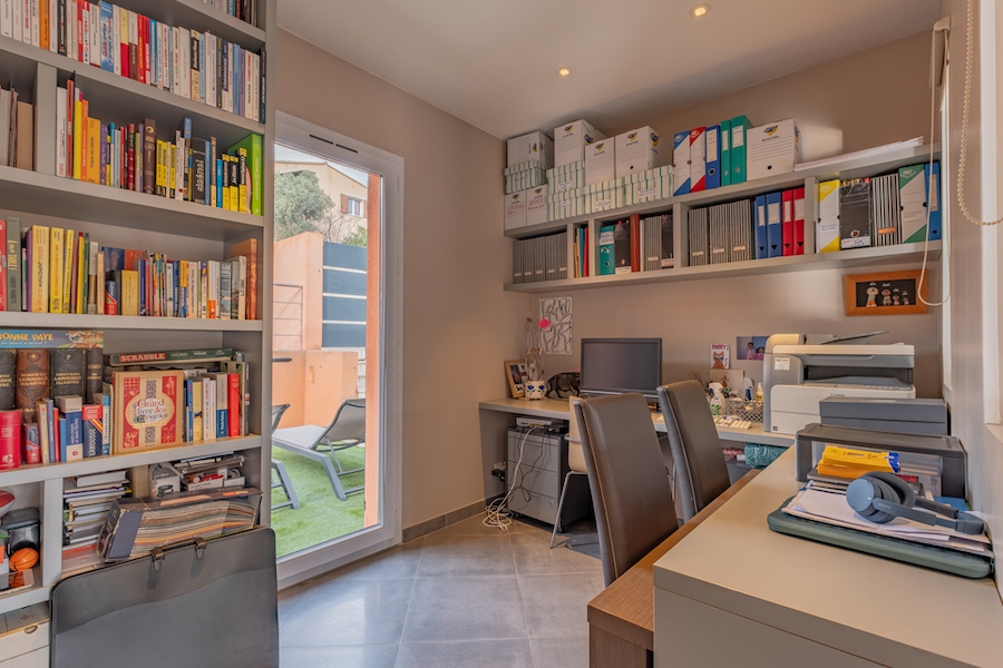 The villa is distinguished by its generous volumes and exceptional natural light. The spacious living room, bathed in sunlight thanks to its impressive ceiling height, opens onto a superb terrace of approximately 80 sqm with open views. The fully equipped open-plan kitchen is complemented by a utility room, while a dedicated office space enhances the living area, making it ideal for remote working.