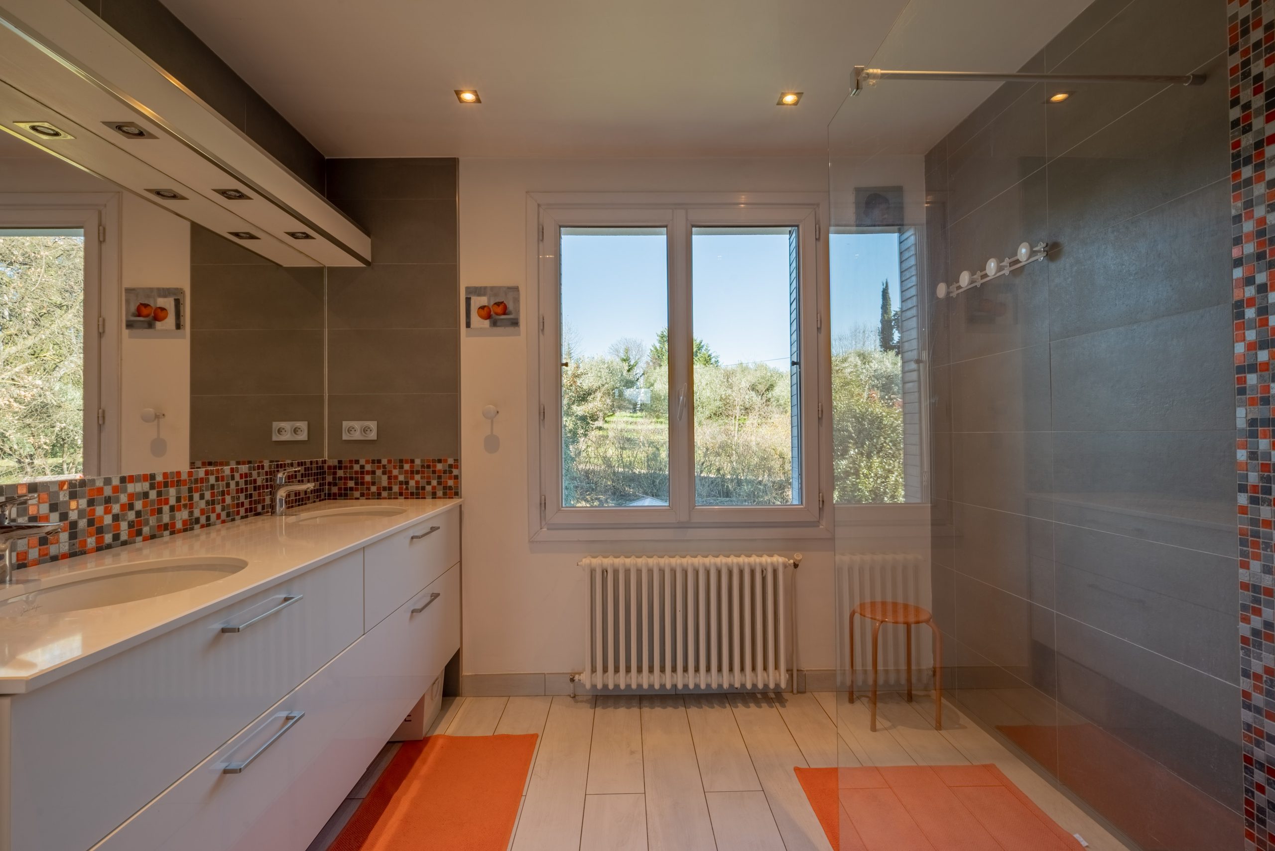 Built in the 1960’s and fully renovated in 2015, the property spans two levels and impresses with its generous proportions, abundant natural light, and high-quality finishes. The ground floor opens onto a spacious and inviting living area, bathed in light thanks to numerous windows overlooking the garden. This space includes a living room, a dining room, and a functional kitchen. A ground-floor bedroom with an en-suite shower room provides added flexibility.