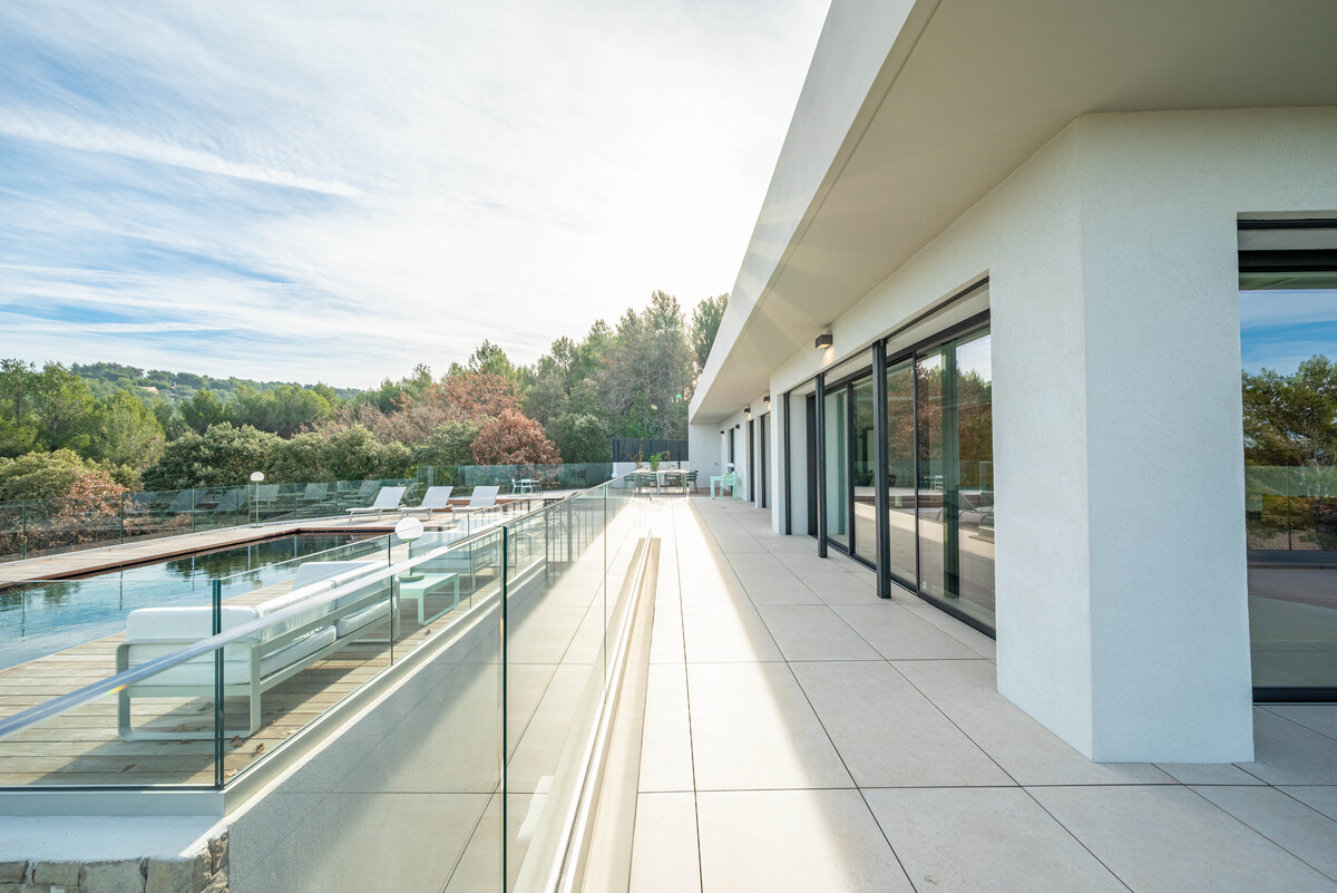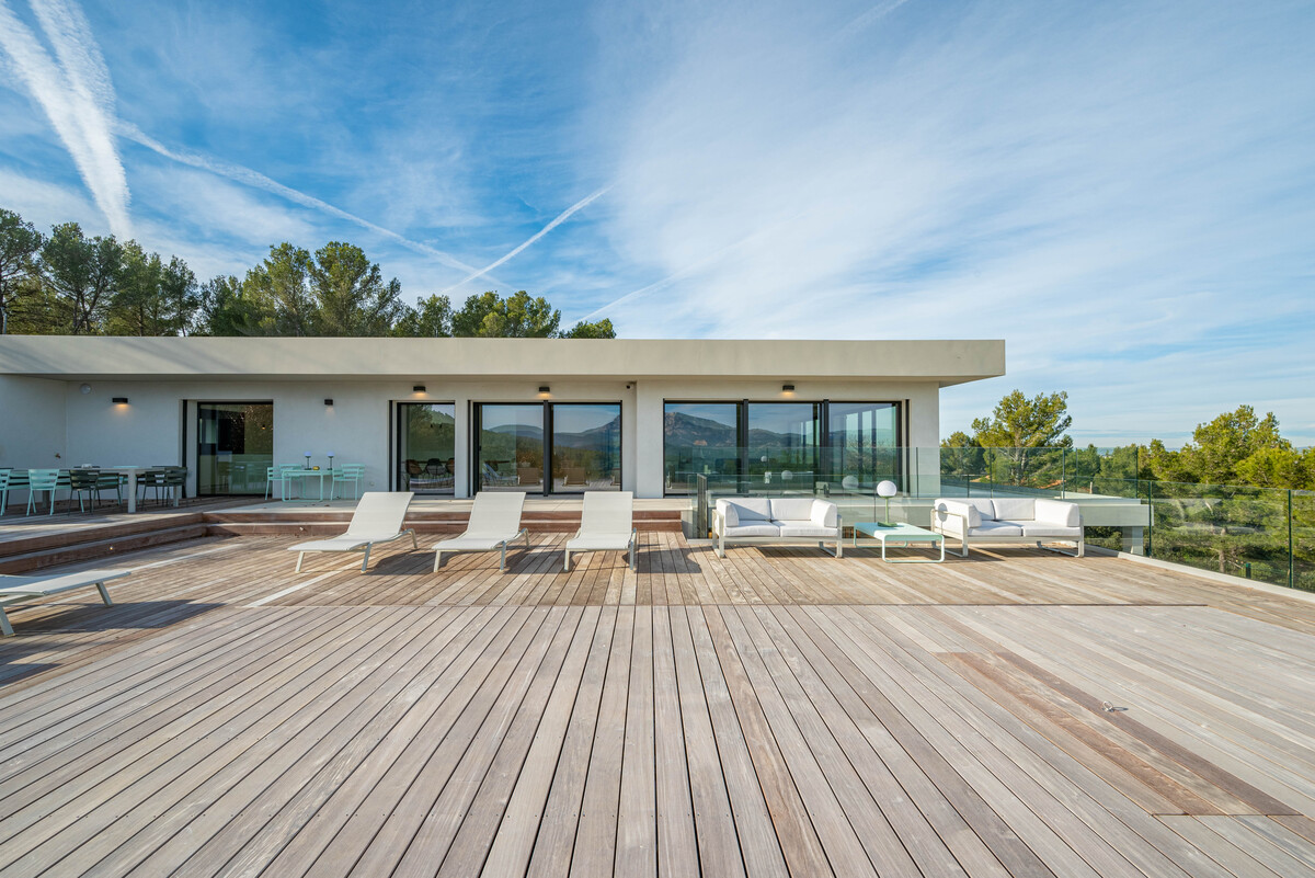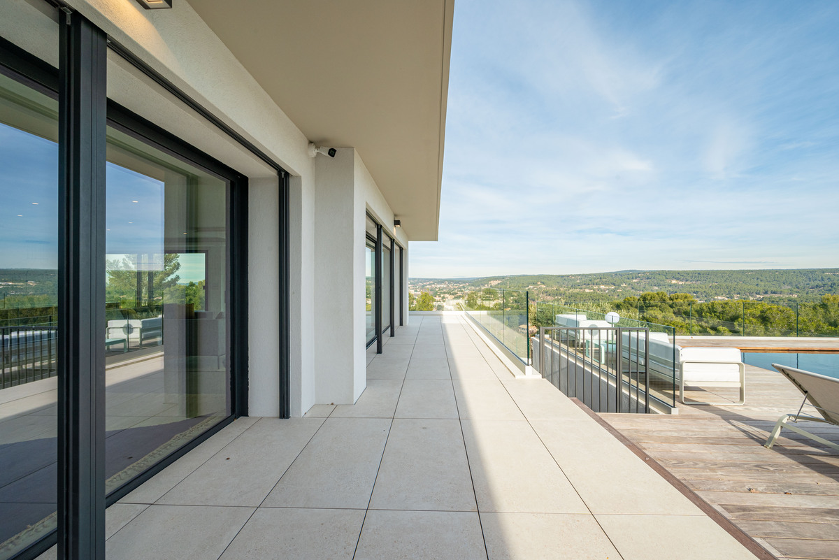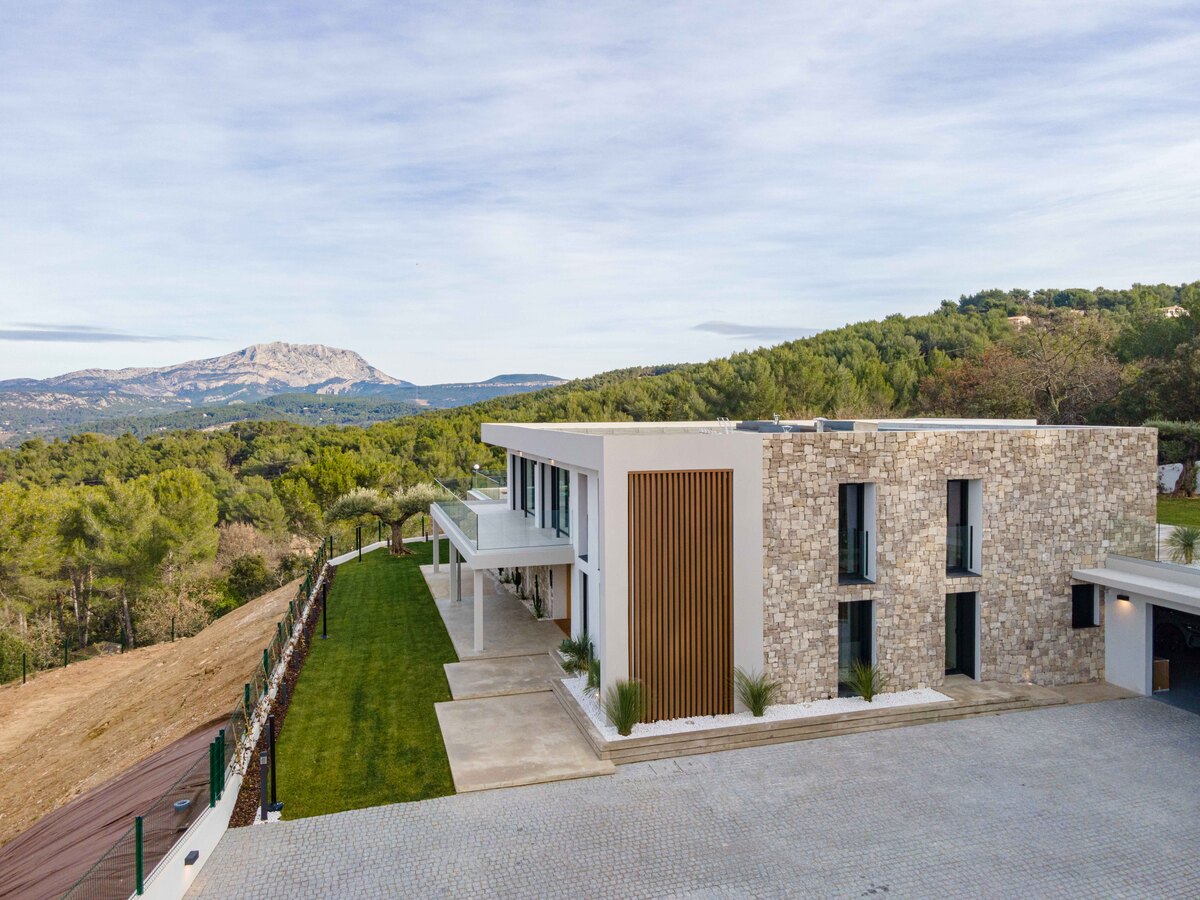 In a sought-after, peaceful setting, this superb, contemporary, secure villa is located 2 km from Aix-en-Provence town centre, on a hillside in a green setting with tall pine trees and spectacular views of the Sainte Victoire, immortalised by Cezanne.