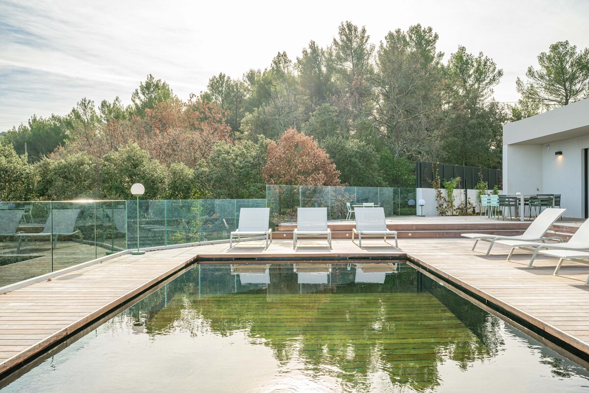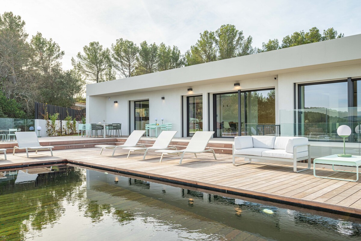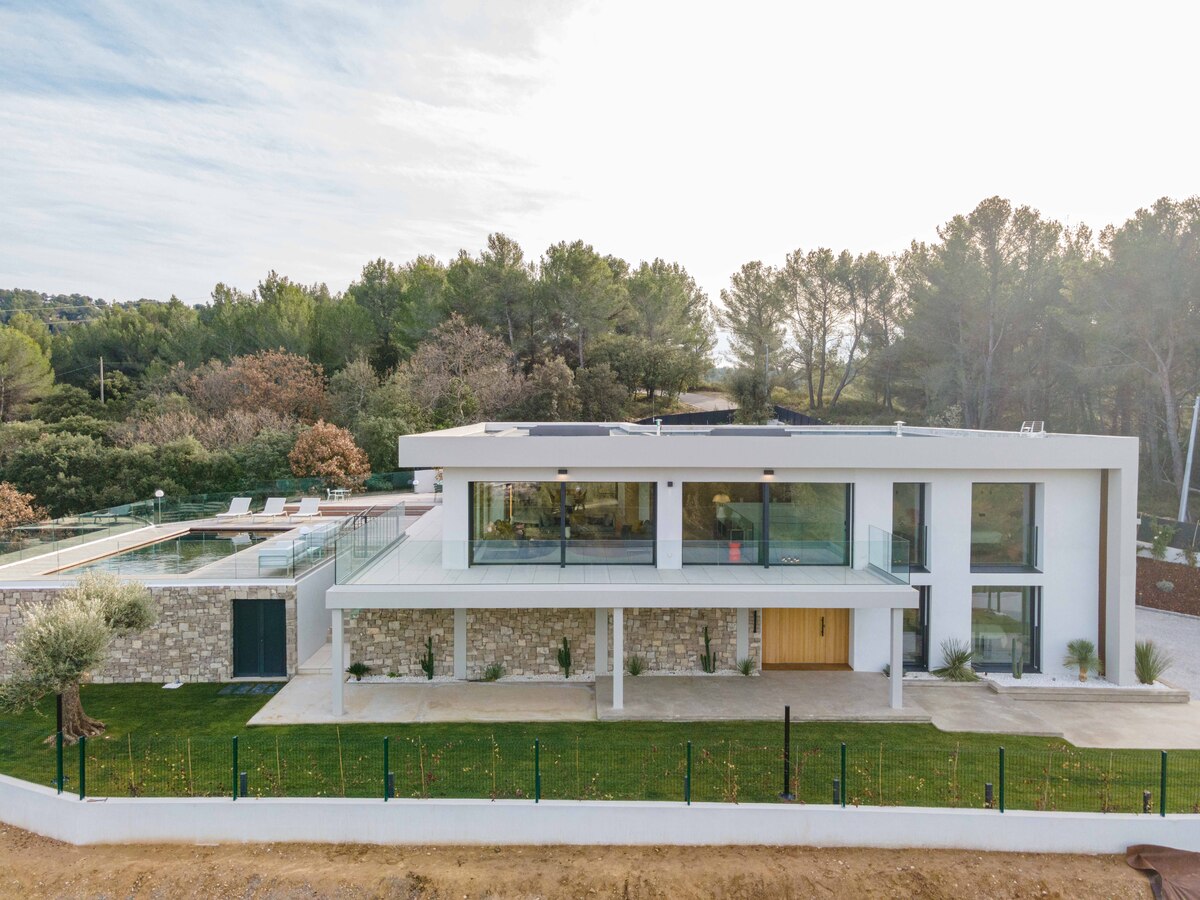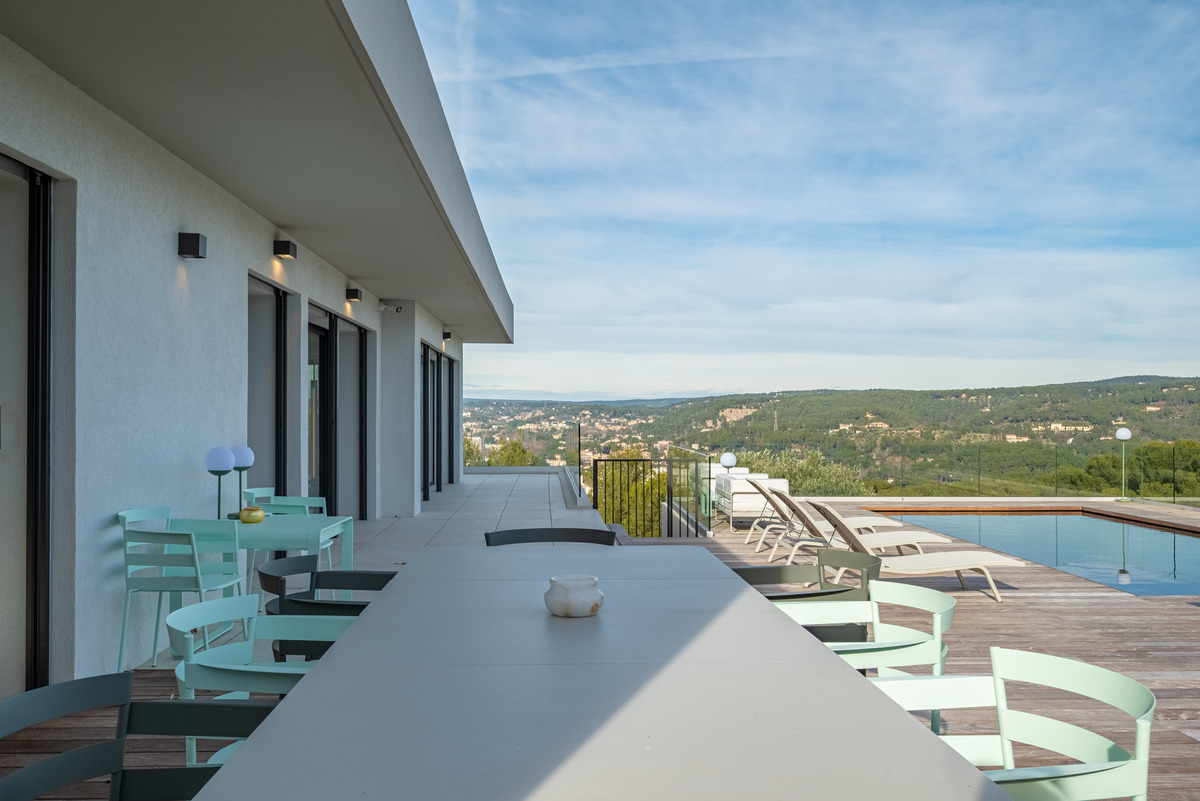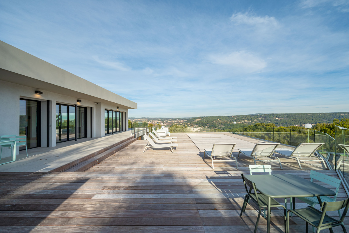 In a sought-after, peaceful setting, this superb, contemporary, secure villa is located 2 km from Aix-en-Provence town centre, on a hillside in a green setting with tall pine trees and spectacular views of the Sainte Victoire, immortalised by Cezanne.