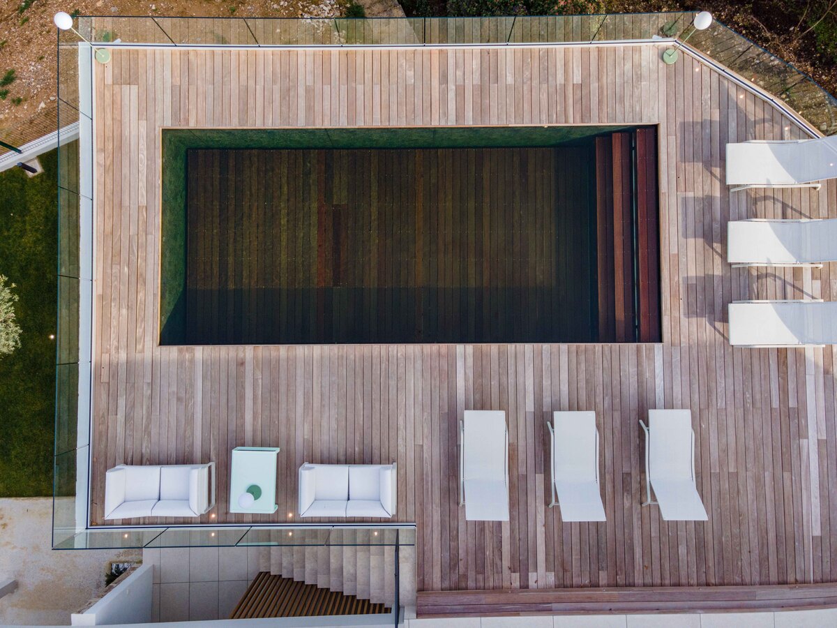 It offers a complete home automation system, all for comfortable, easy living. Light-coloured woods, teak terraces, a white facade, exposed stonework, glass railings and wide windows are just some of the noble materials that add warmth and aesthetic appeal to the property. A 6-car garage completes the property.