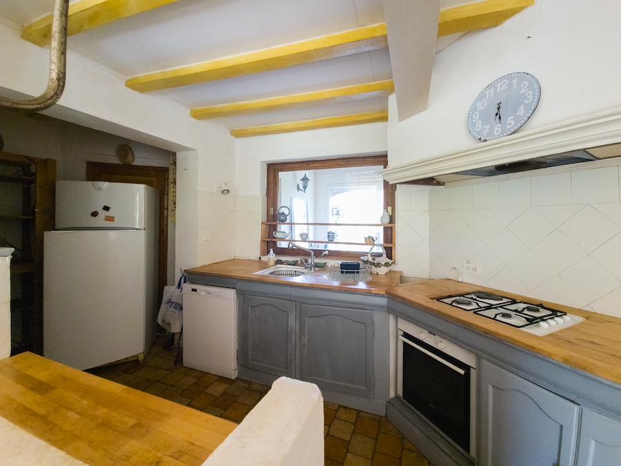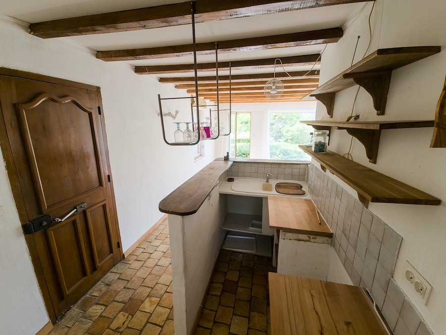 Upstairs, a large one-bedroom apartment reveals a cosy living room, where the crackling of the stove warms the atmosphere, while the original floor tiles tell the story of the place under a beautiful high ceiling. A spacious kitchen and a soothing bedroom complete the picture.