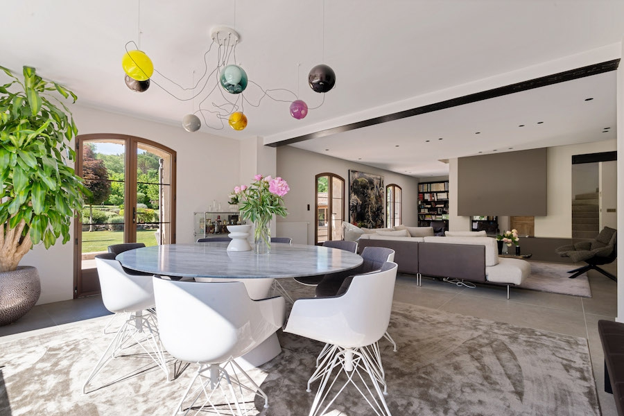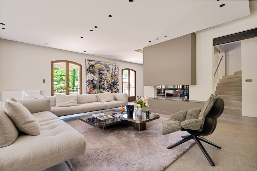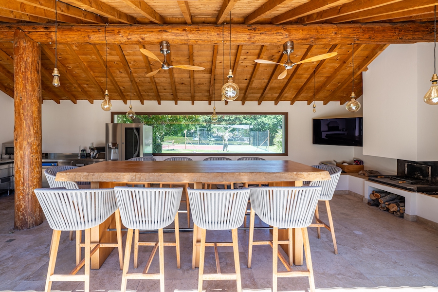 The 75 m2 pool house is an entertainment dream. With a modern kitchen, fireplace, and pizza oven, plus a guest suite with en suite shower room, it opens via floor-to-ceiling glass to the garden—offering an immersive indoor-outdoor lifestyle.