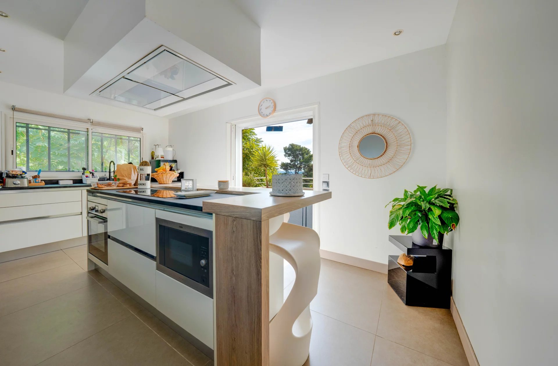 The fully equipped kitchen also benefits from direct access to a terrace overlooking the greenery and the summer kitchen, ideal for entertaining and enjoying the warm weather.