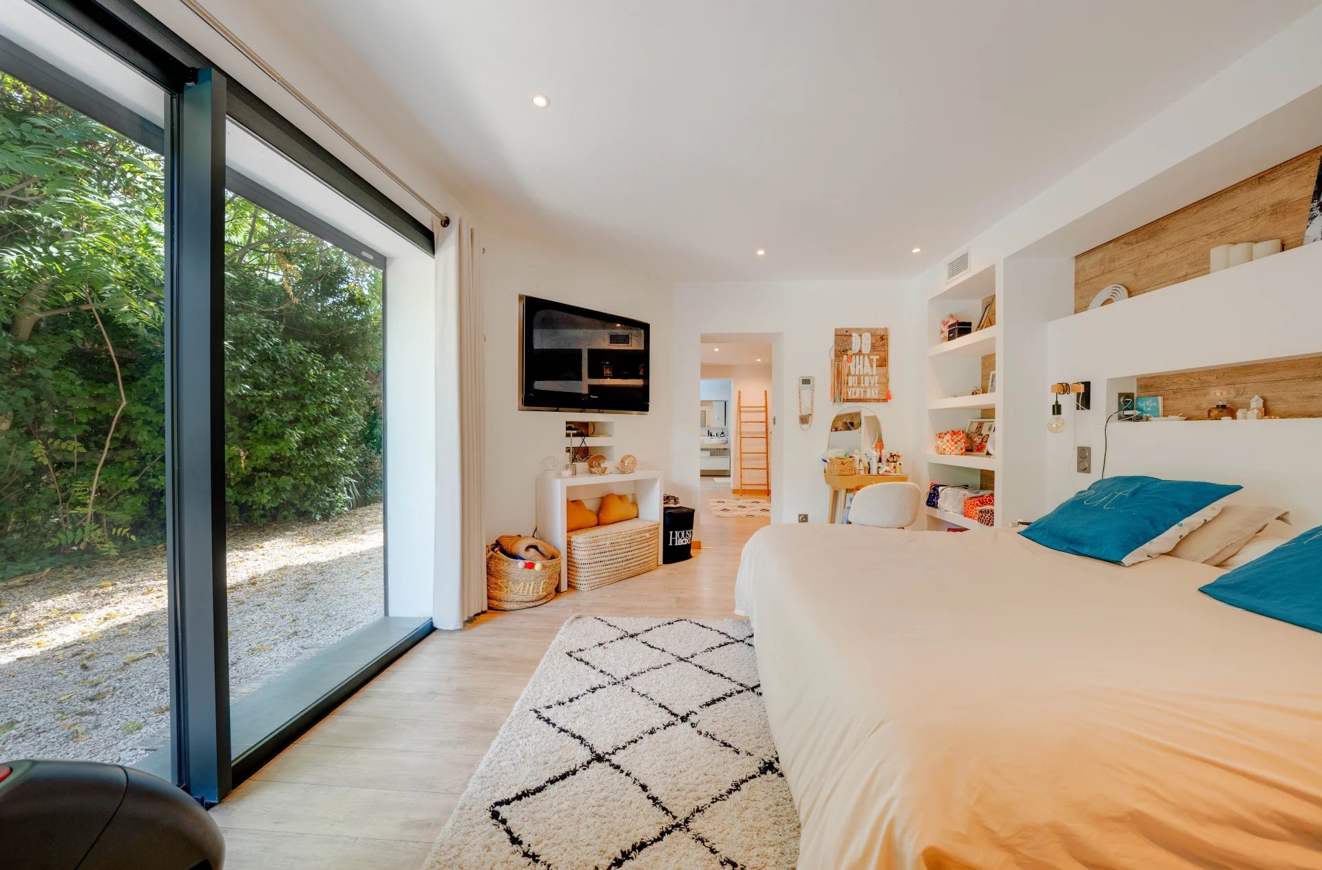The sleeping area consists of two bedrooms on the main floor, sharing an elegant bathroom, as well as two additional bedrooms on the garden level, including a master suite with dressing room, bathroom, shower and toilet, opening directly onto the garden.