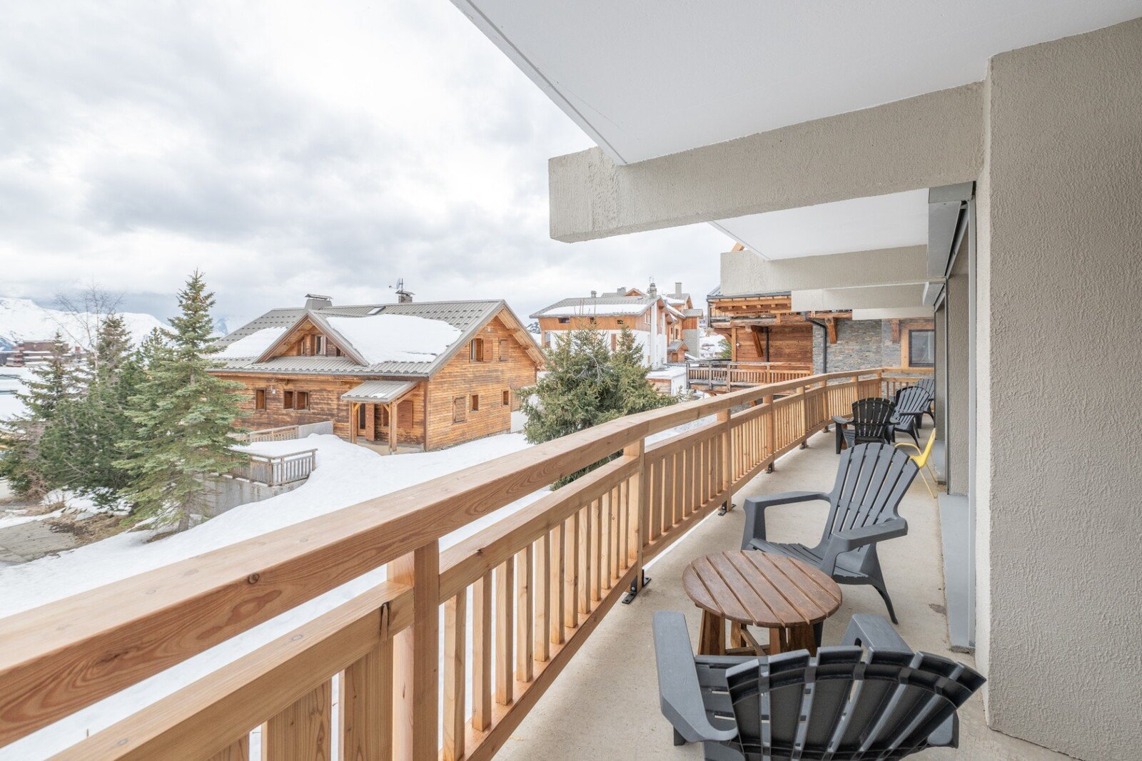The four comfortable bedrooms, each styled with Alpine charm, and the three modern bathrooms ensure maximum comfort for everyone. Step outside onto the large south-facing wraparound balcony to enjoy fresh mountain air and take in the breathtaking views of snow-capped peaks in the distance.