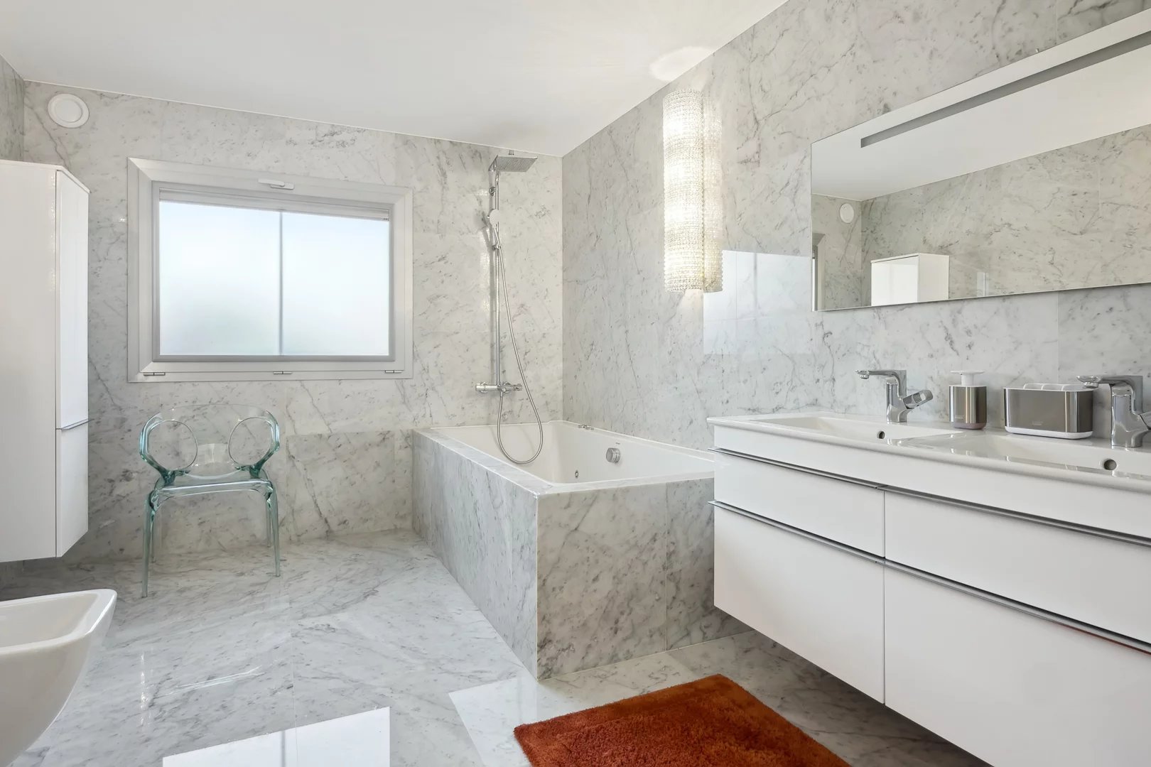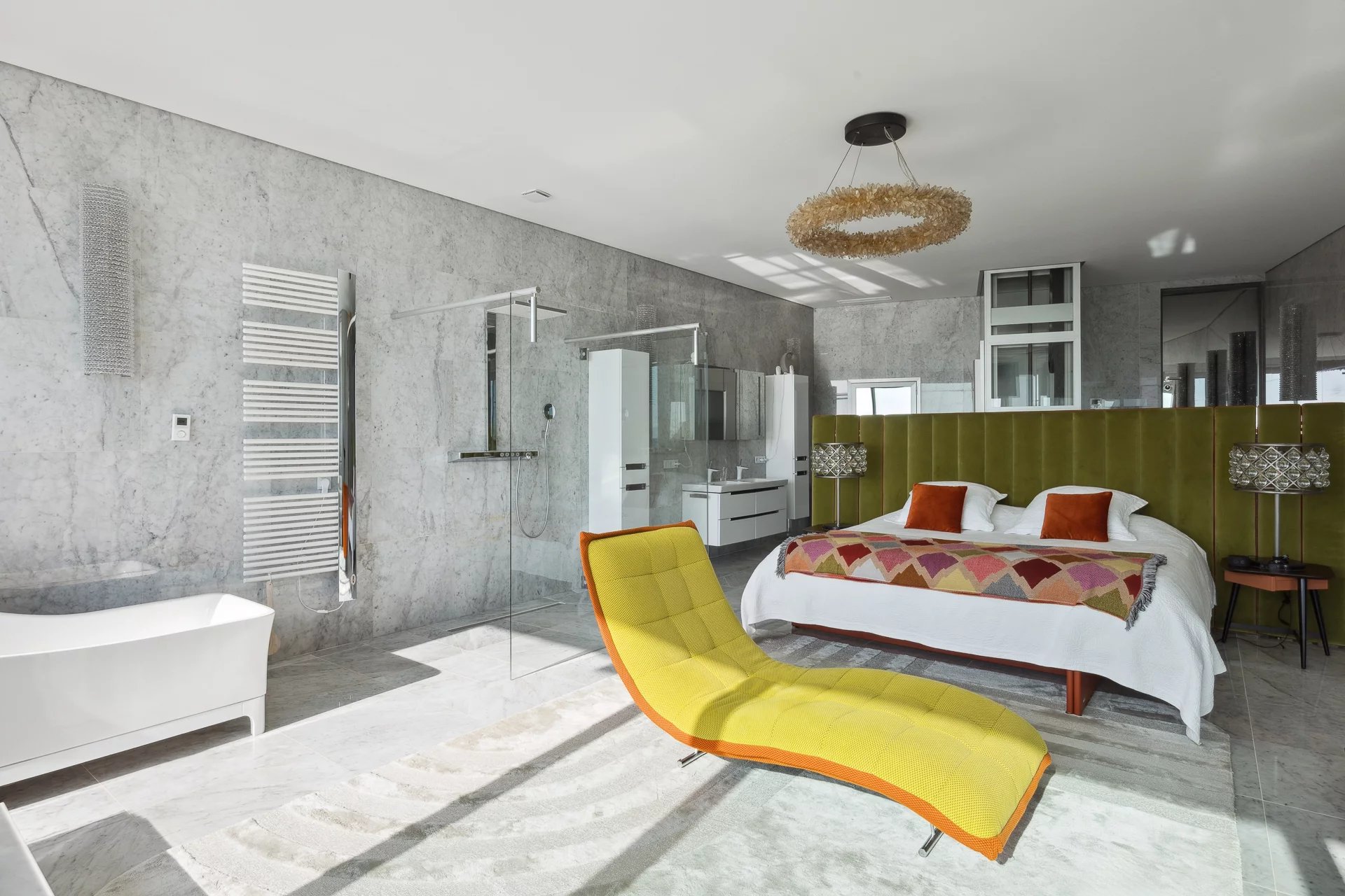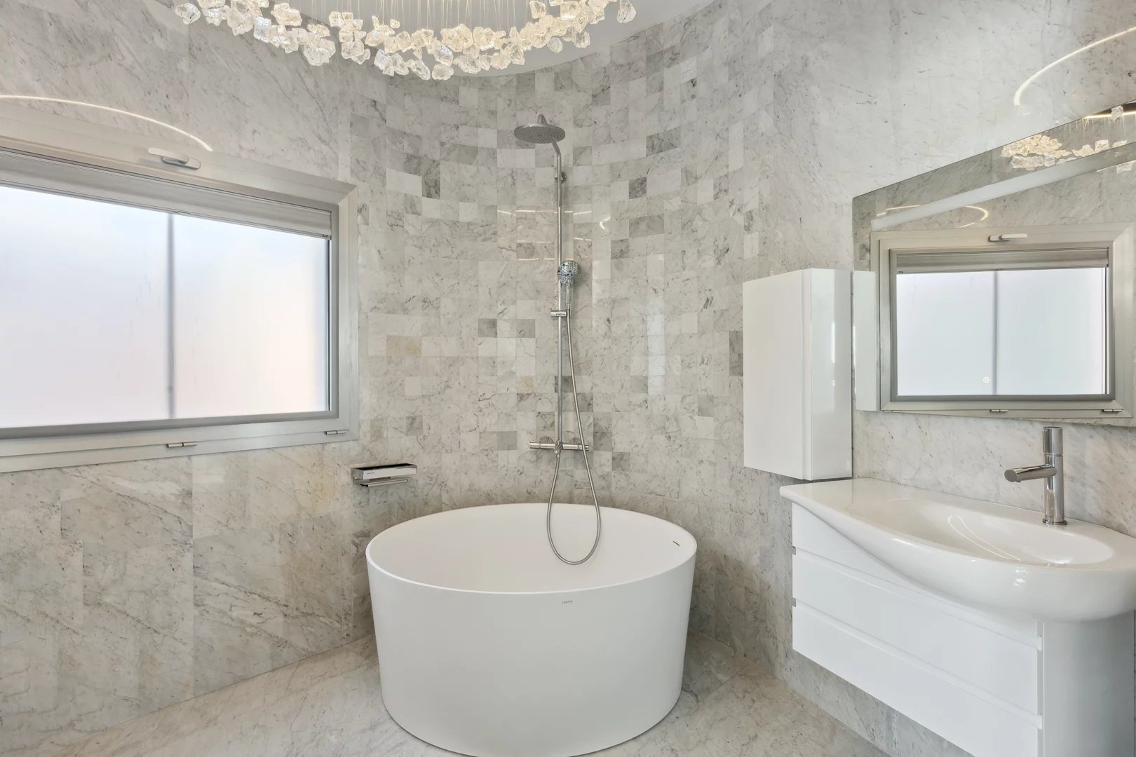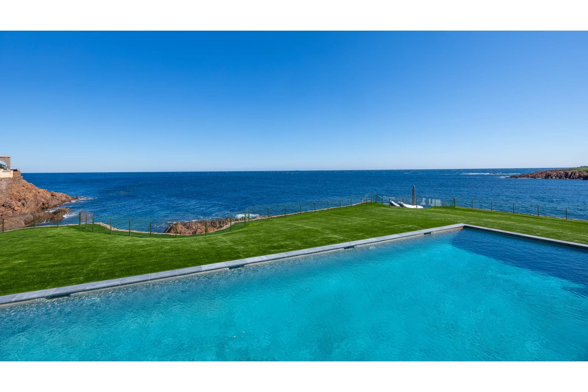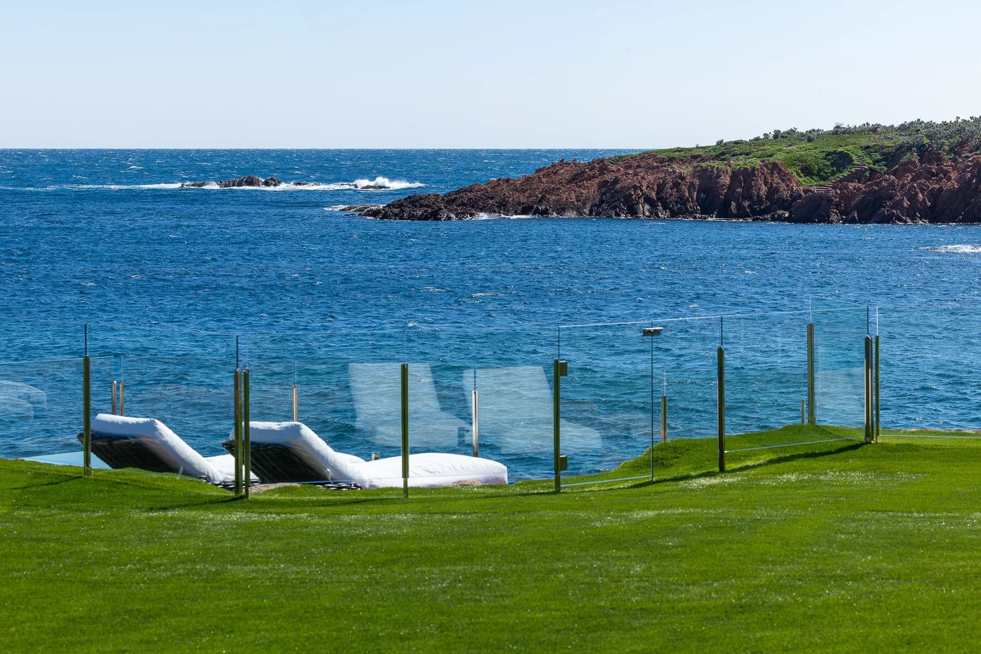 Superb very recent contemporary villa of 240 m2 of living space approx approx (320 m2 approx in total with interior patio and suspended terrace). Living room with 2 fireplaces, a dining room, 2 professional kitchens, 3 beautiful en-suite bedrooms and a independent apartment for staff. Superb master bedroom (100 m2 approx) facing the sea and with large double dressing room. Parking for 4/6 cars. Play area for children. Very luxurious and extraordinary services.