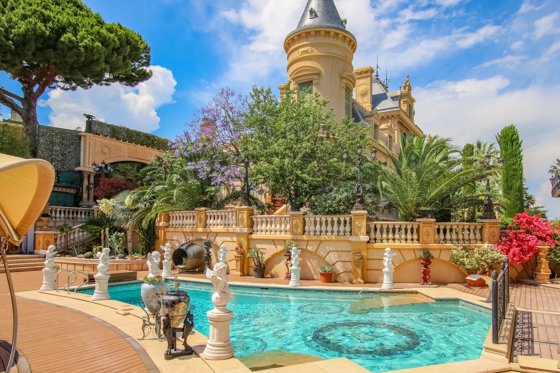 The garden is beautifully landscaped with colorful flower beds and an elegant fountain. The swimming pool is large and has a spacious terrace.