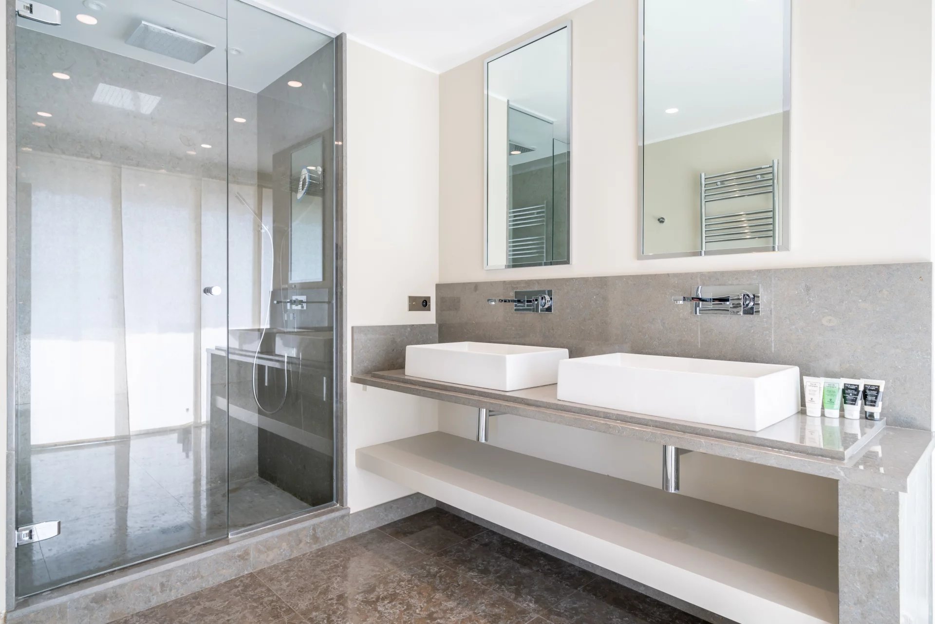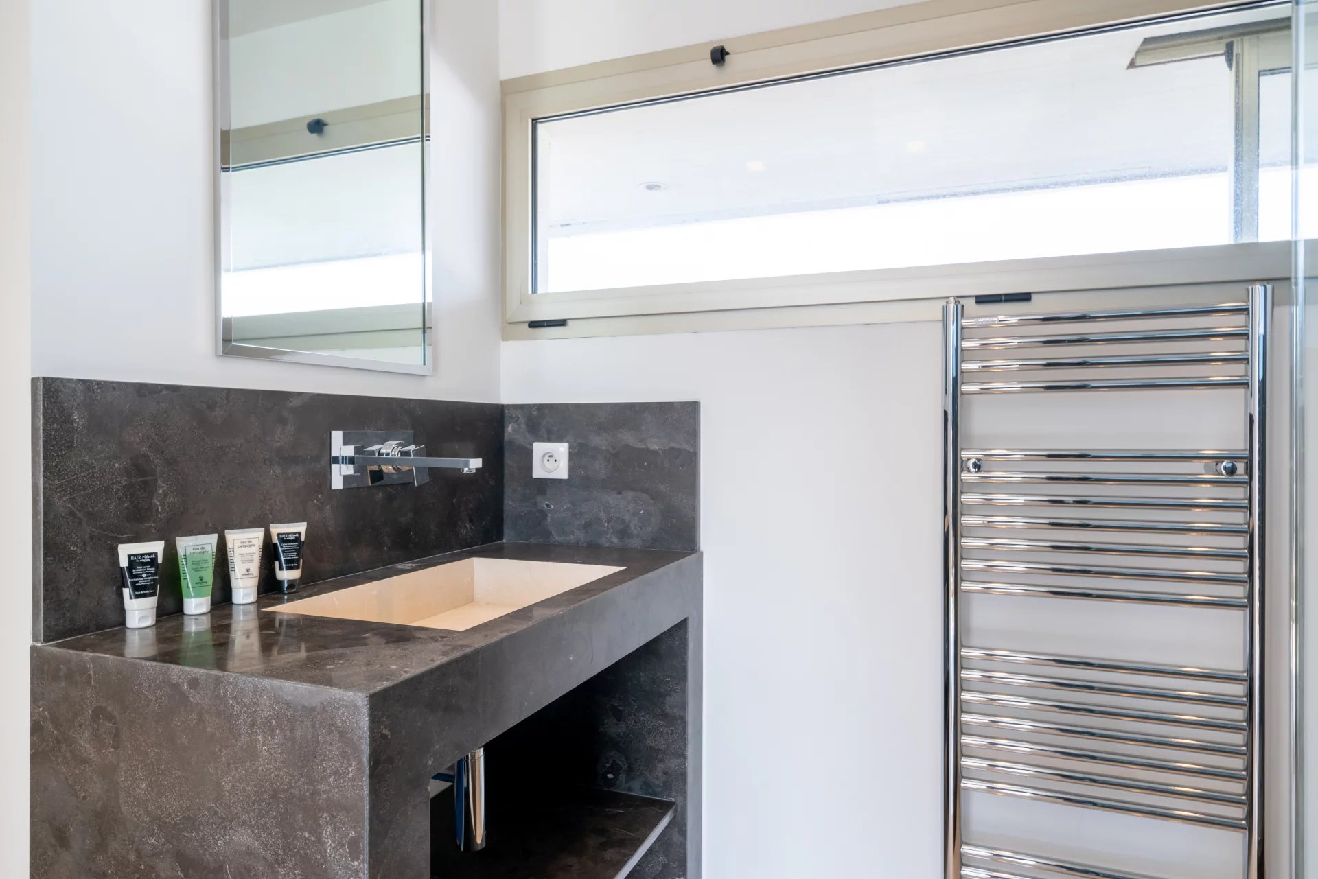 In the sleeping area, there are three en suite bedrooms with private bathrooms. The entire first level is surrounded by an 80 m2 terrace.