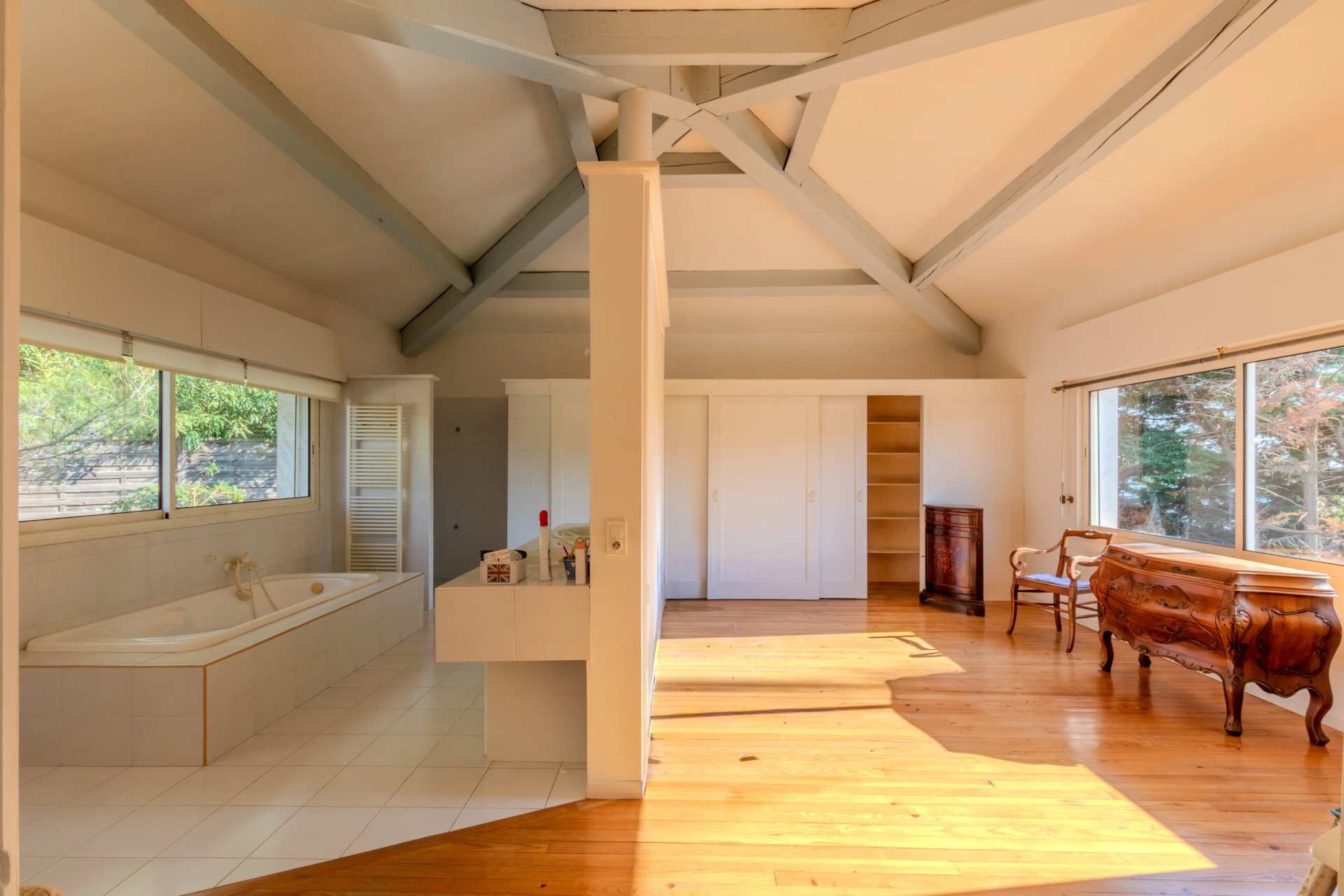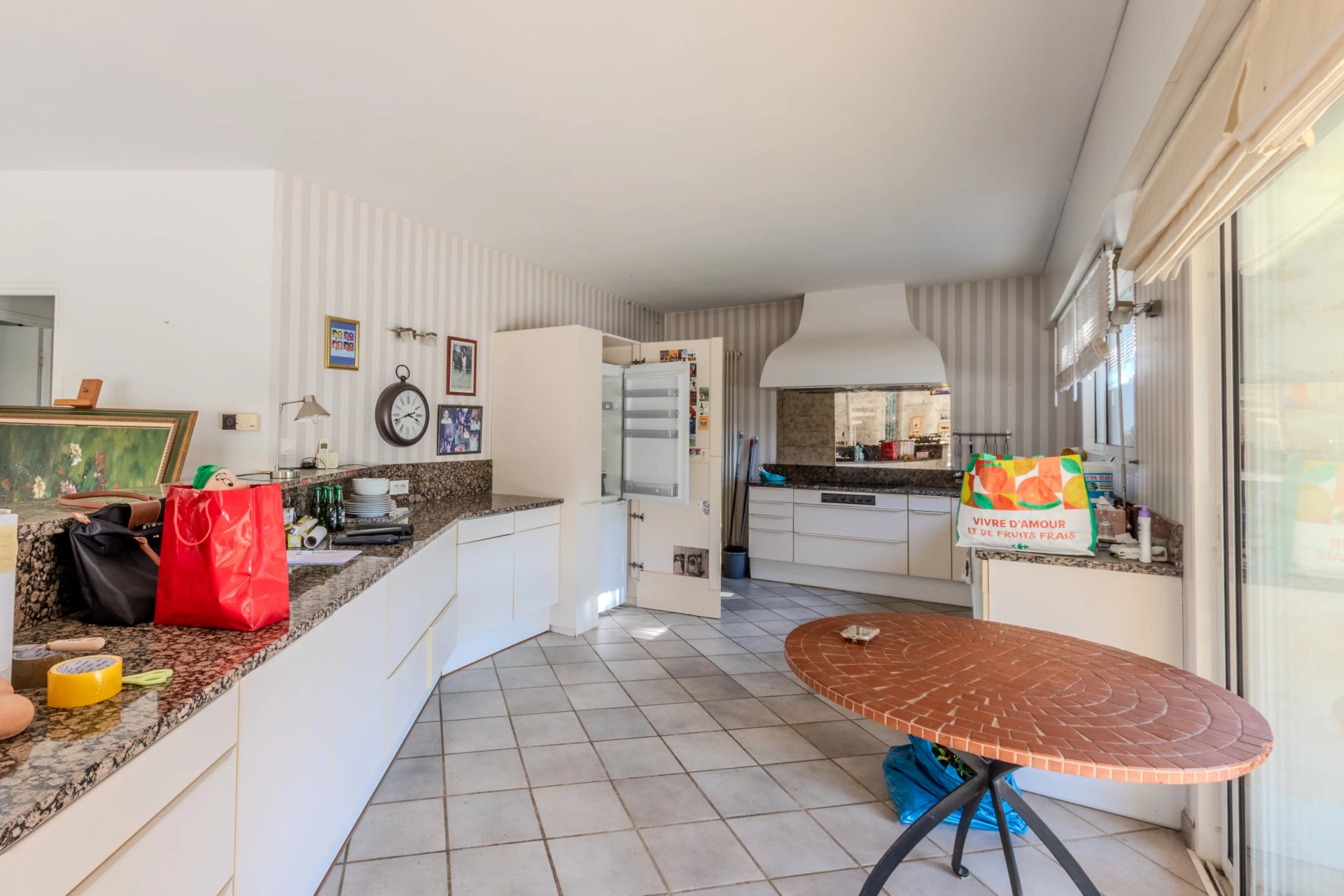 The large living room opens generously onto a functional open-plan kitchen totaling 83m2, complemented by a laundry room with a gas boiler. Large bay windows offer breathtaking views of the pool and garden, inviting you to enjoy the Mediterranean climate all year round.