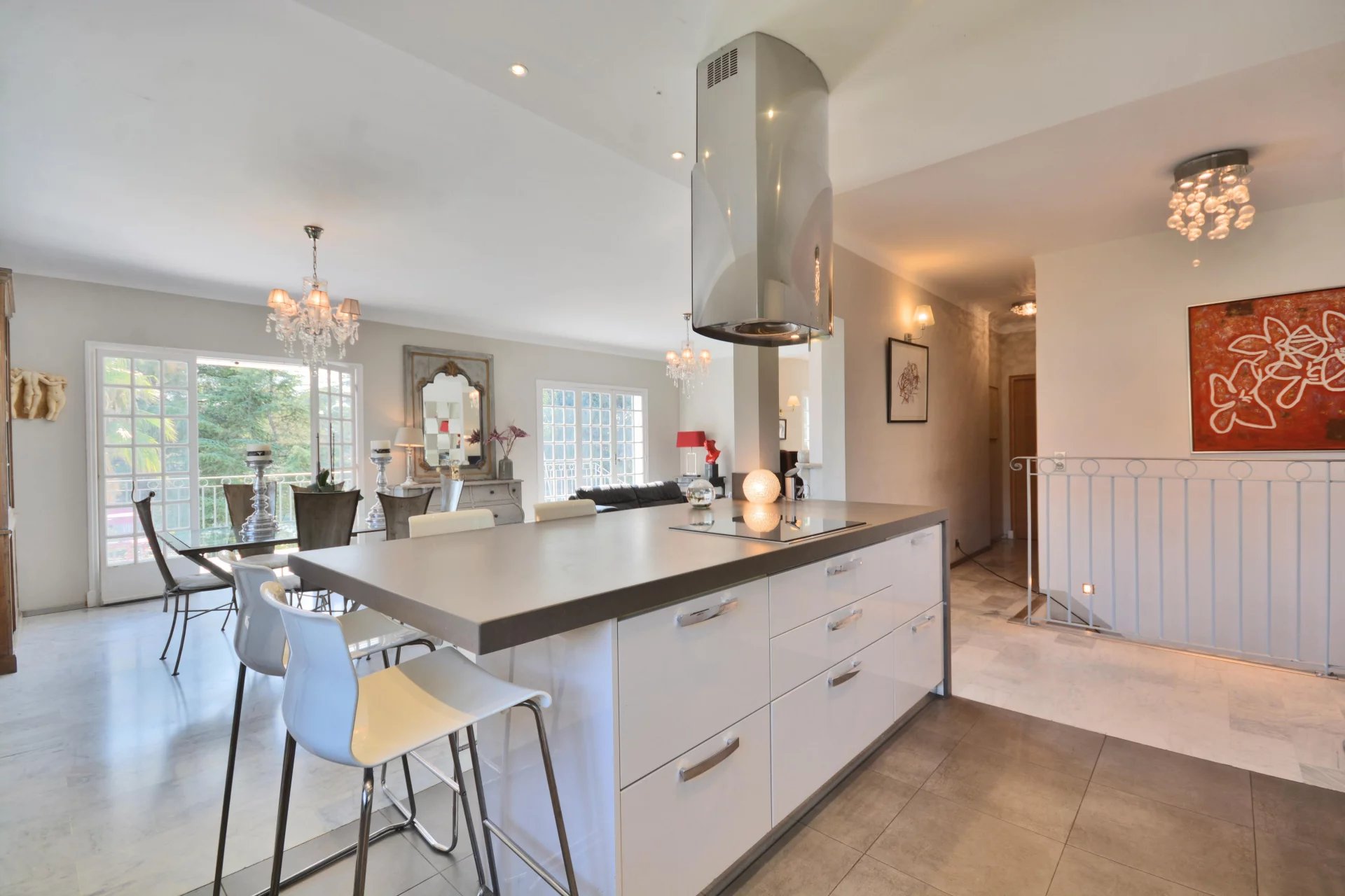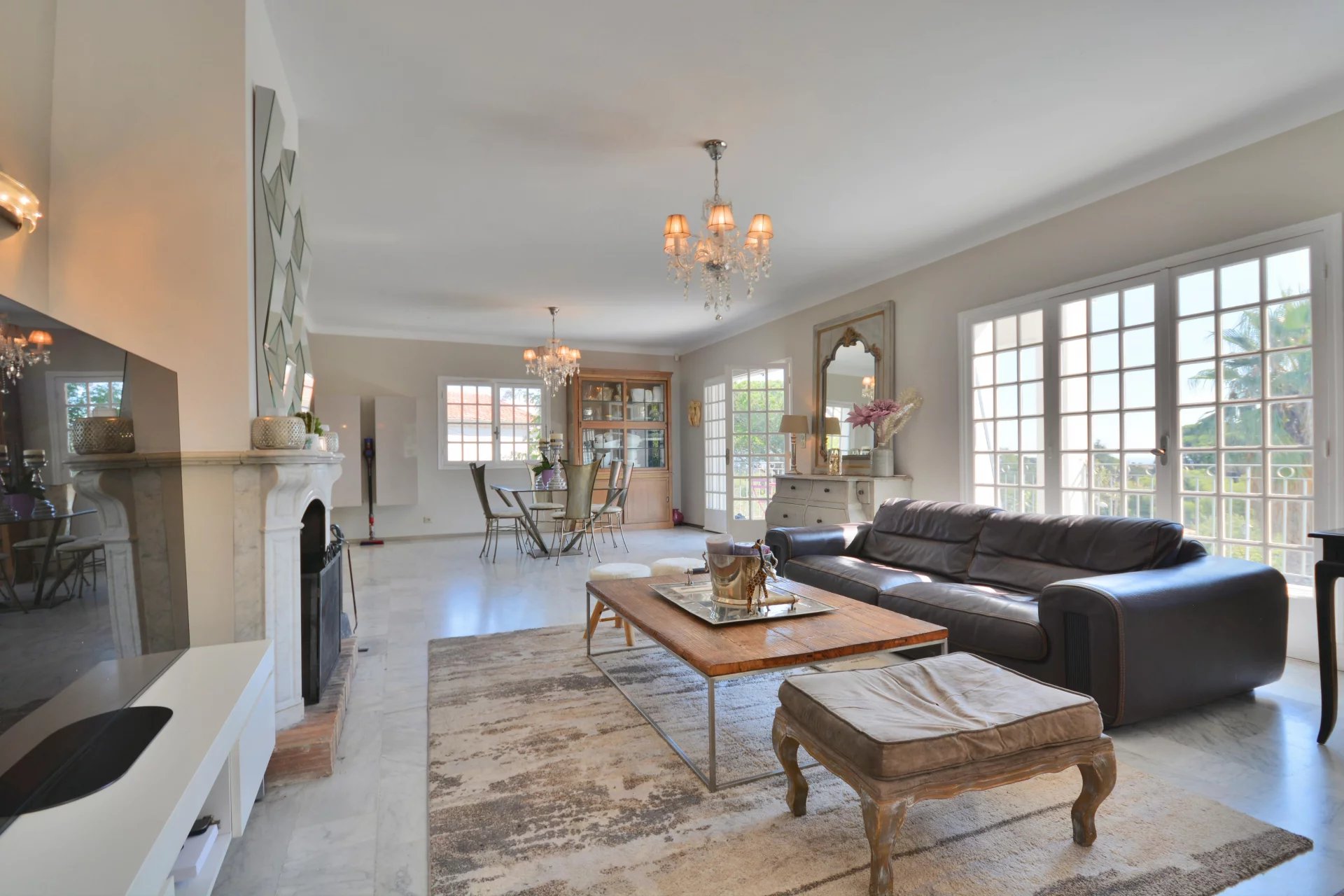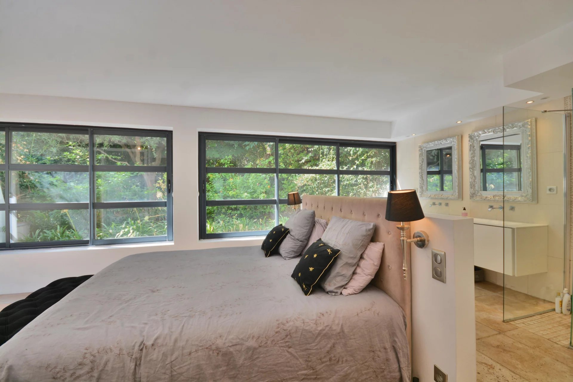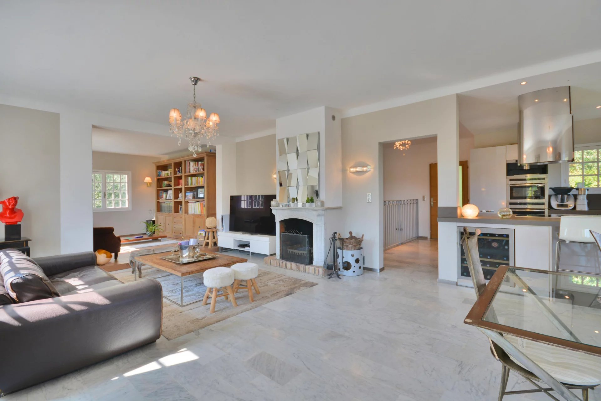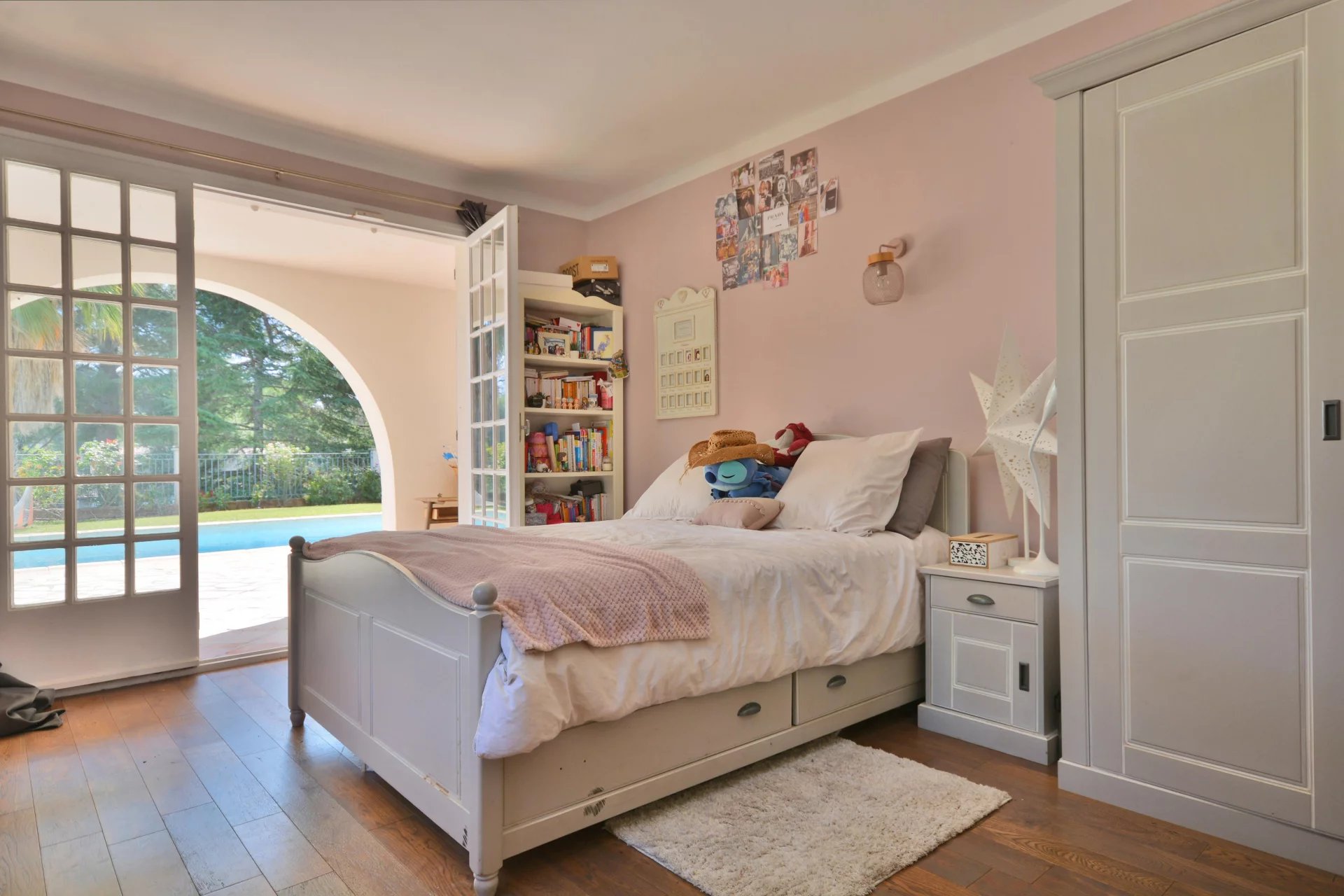 Outside the landscaped gardens wrap around the property, there’s lawns and palm trees all fully fenced and measuring 1,630 m2 you’ll find a lovely pool area for those hot summer months on the Riviera. To finish there’s a secure garage and parking spaces for guests.