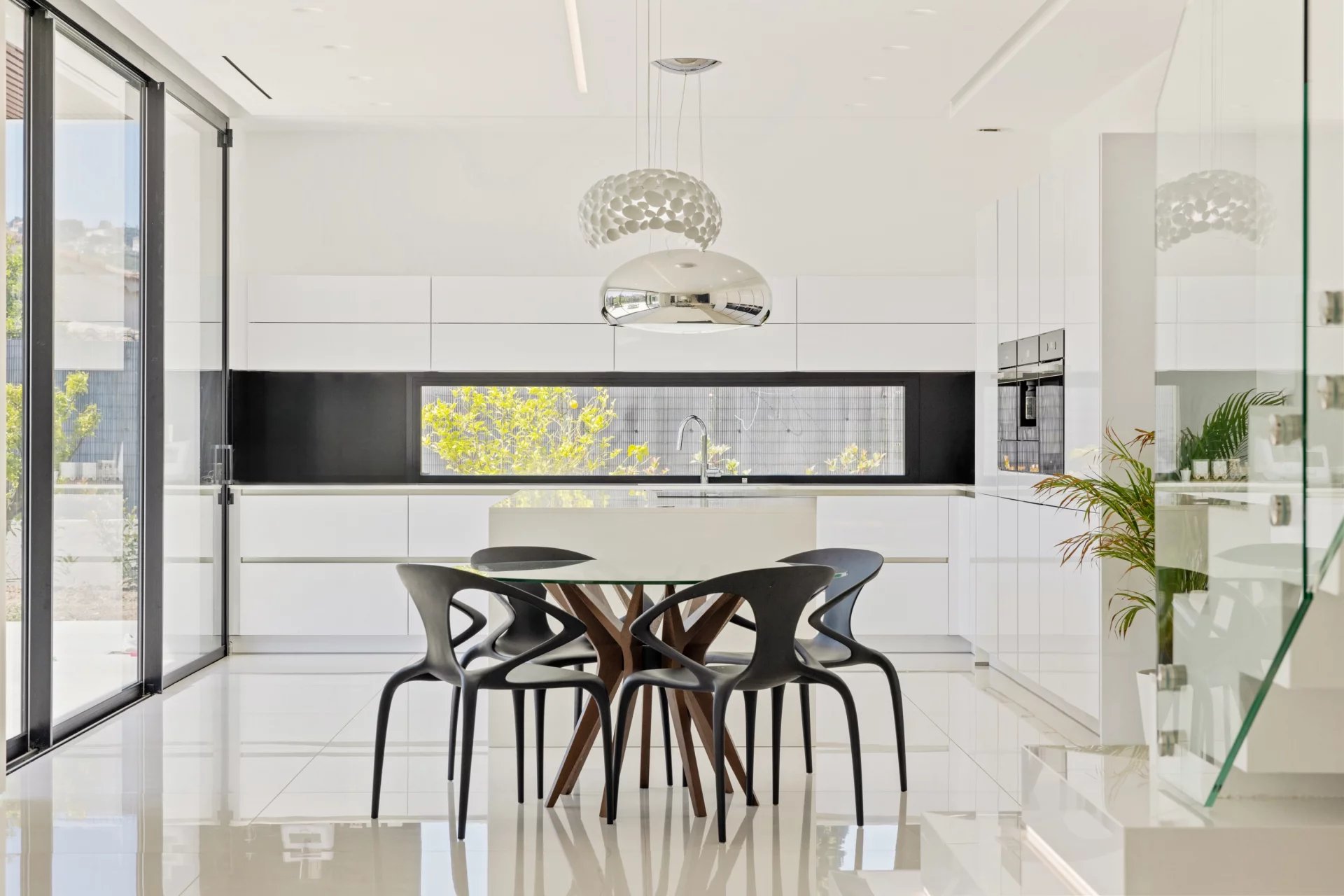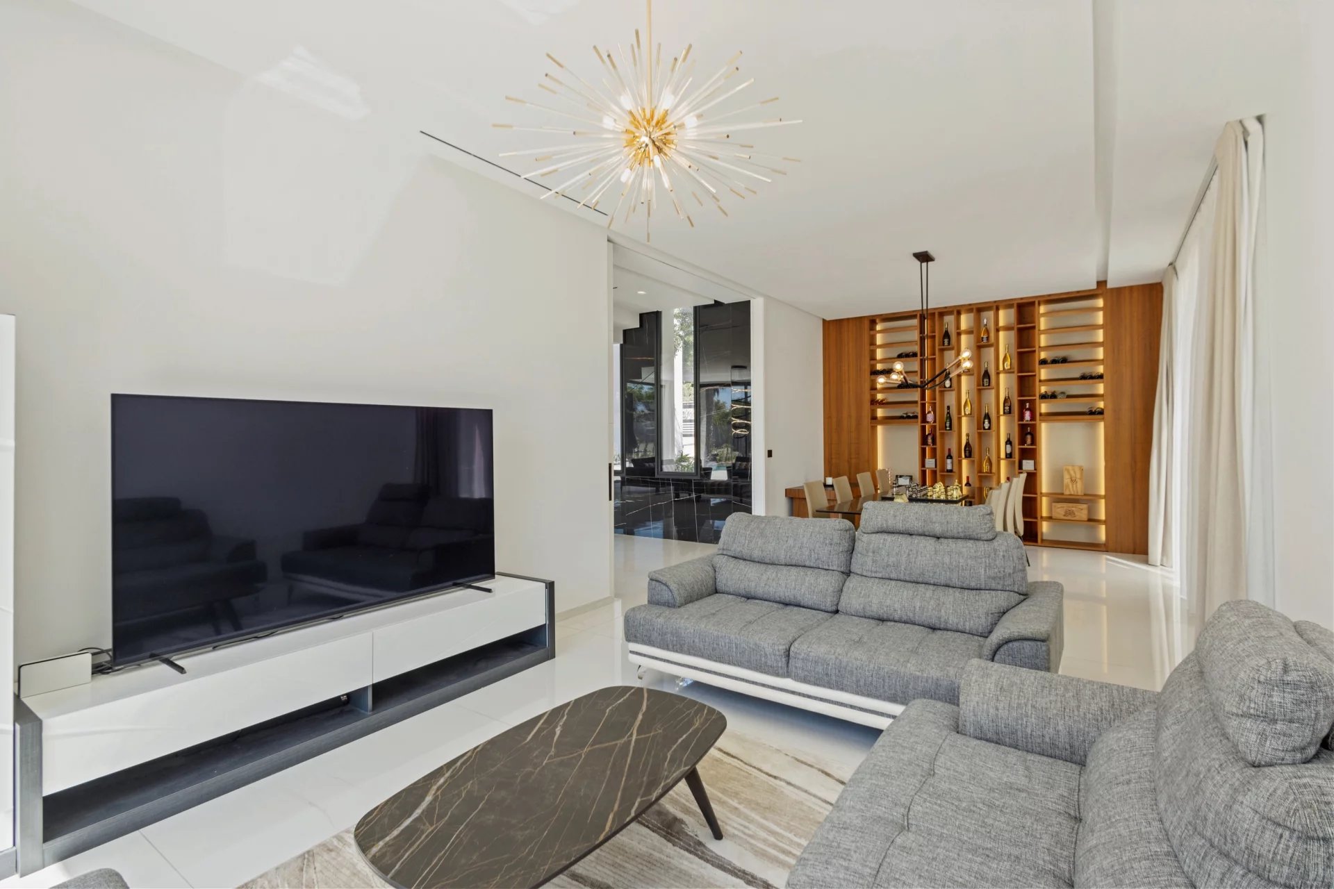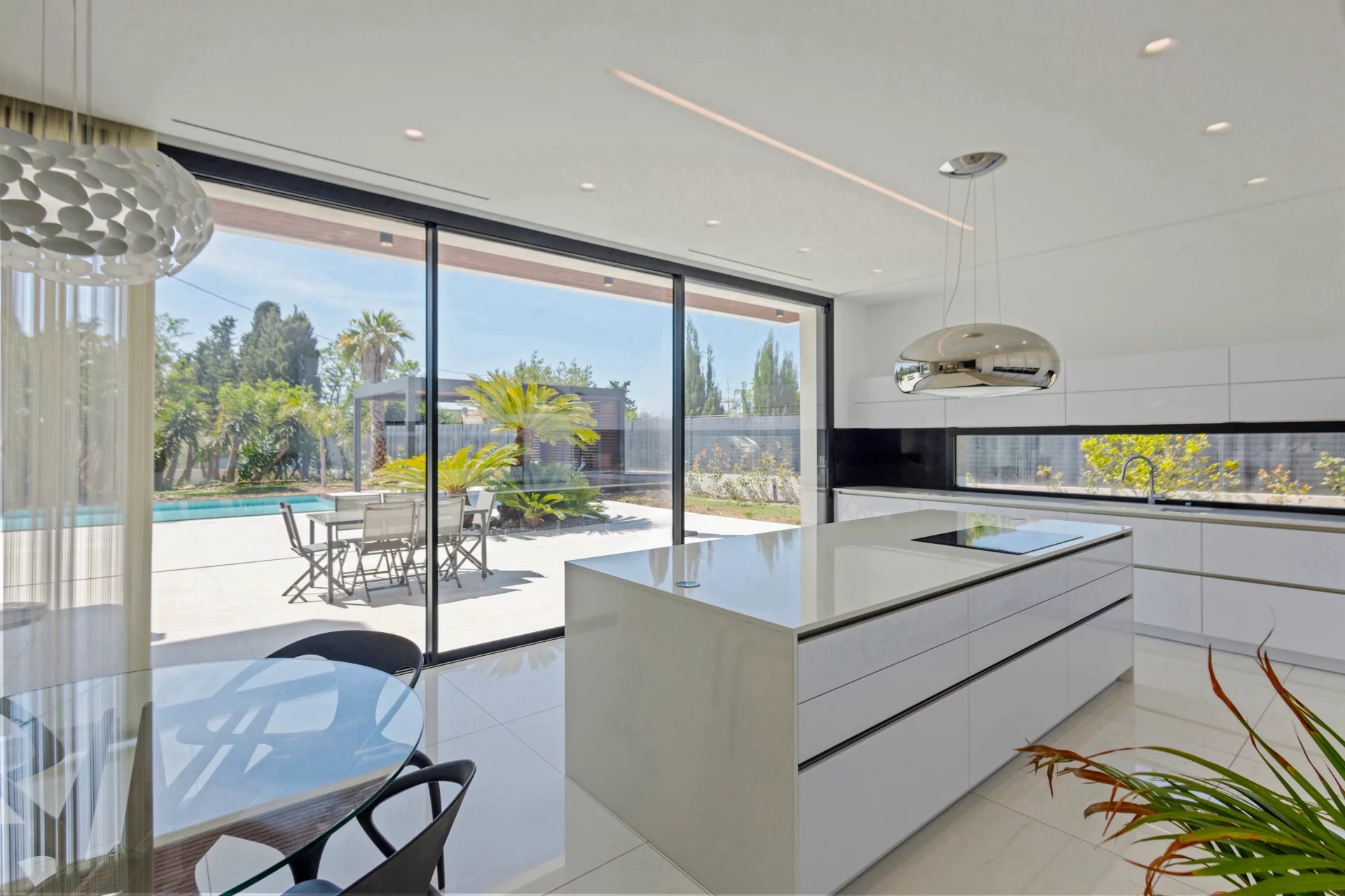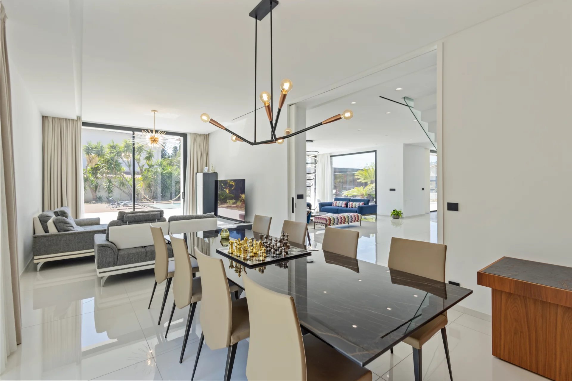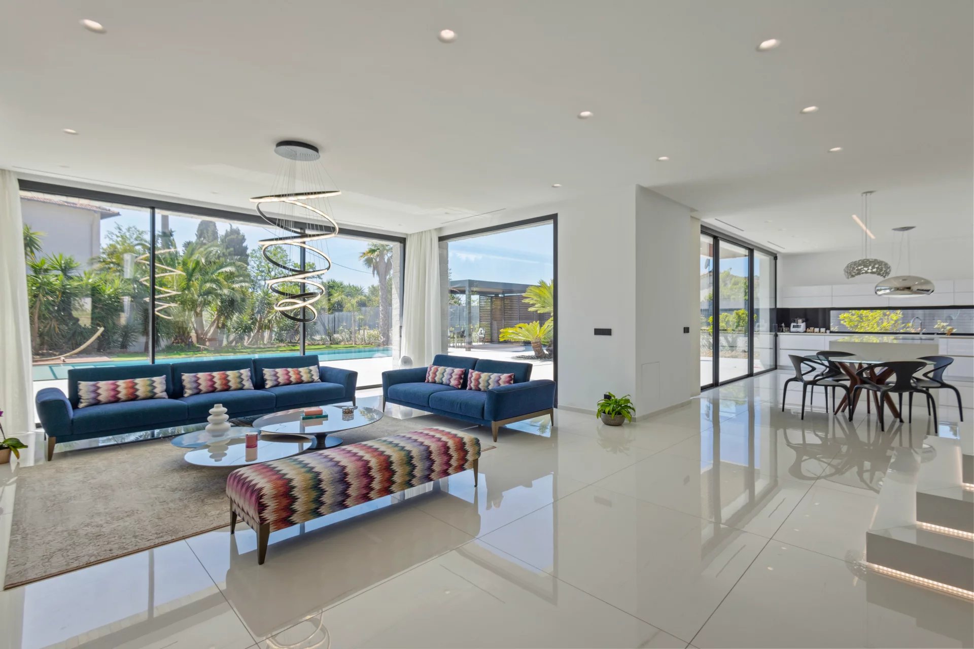 The thoughtfully designed floor plan features a luminous open-concept living area anchored by designer lighting fixtures and vibrant contemporary furnishings that provide sophisticated color accents against the immaculate white interior. The state-of-the-art kitchen with premium integrated appliances and sleek island opens directly to the poolside terrace.