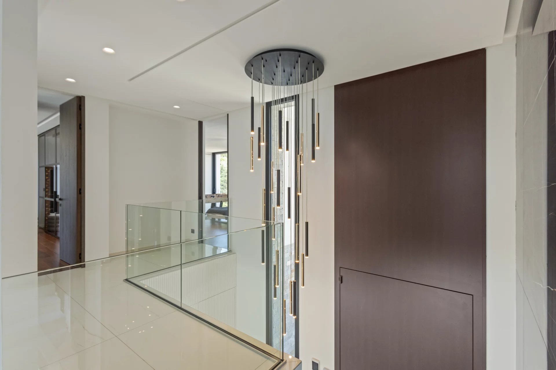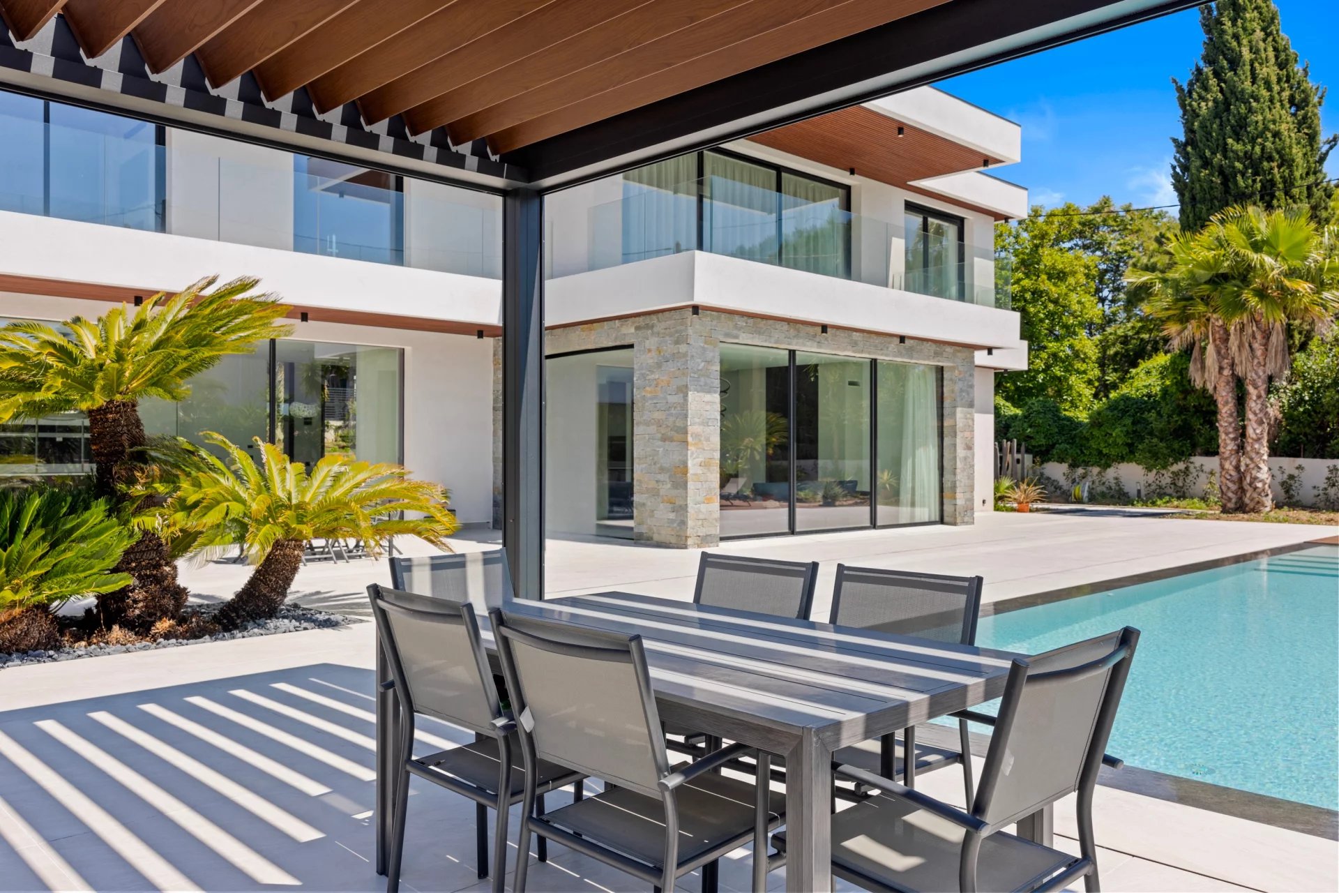 5 elegant en-suite bedrooms include a sumptuous master suite with generous dressing facilities. The meticulously landscaped grounds feature Mediterranean plantings surrounding a swimming pool that reflects the home’s architectural lines.