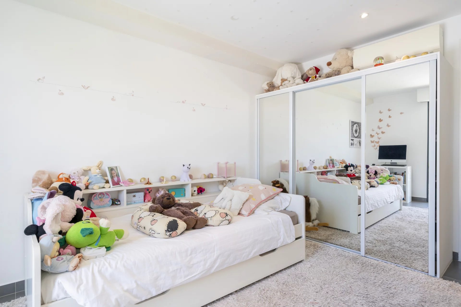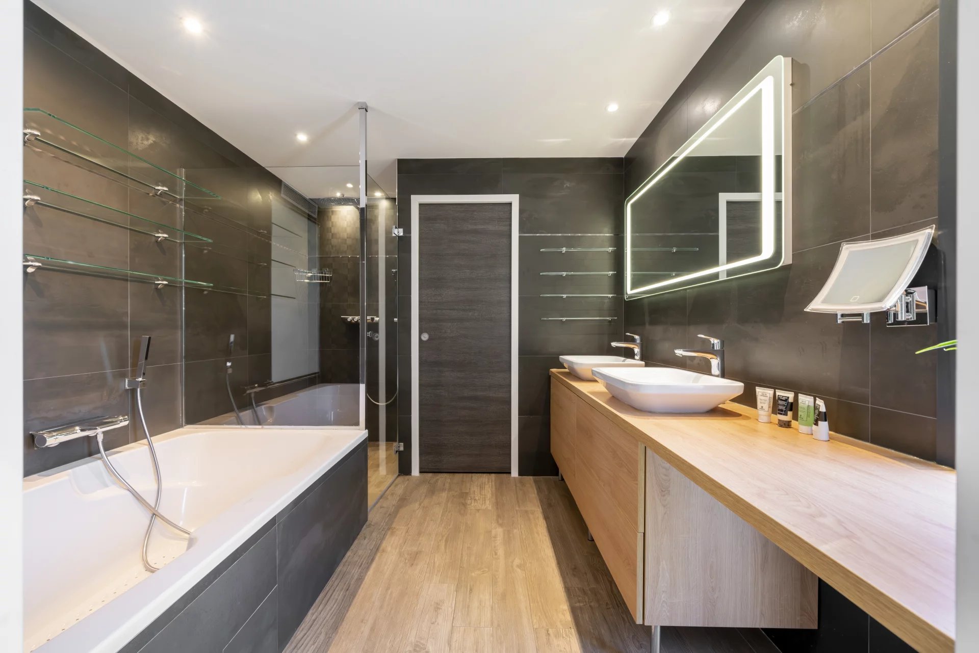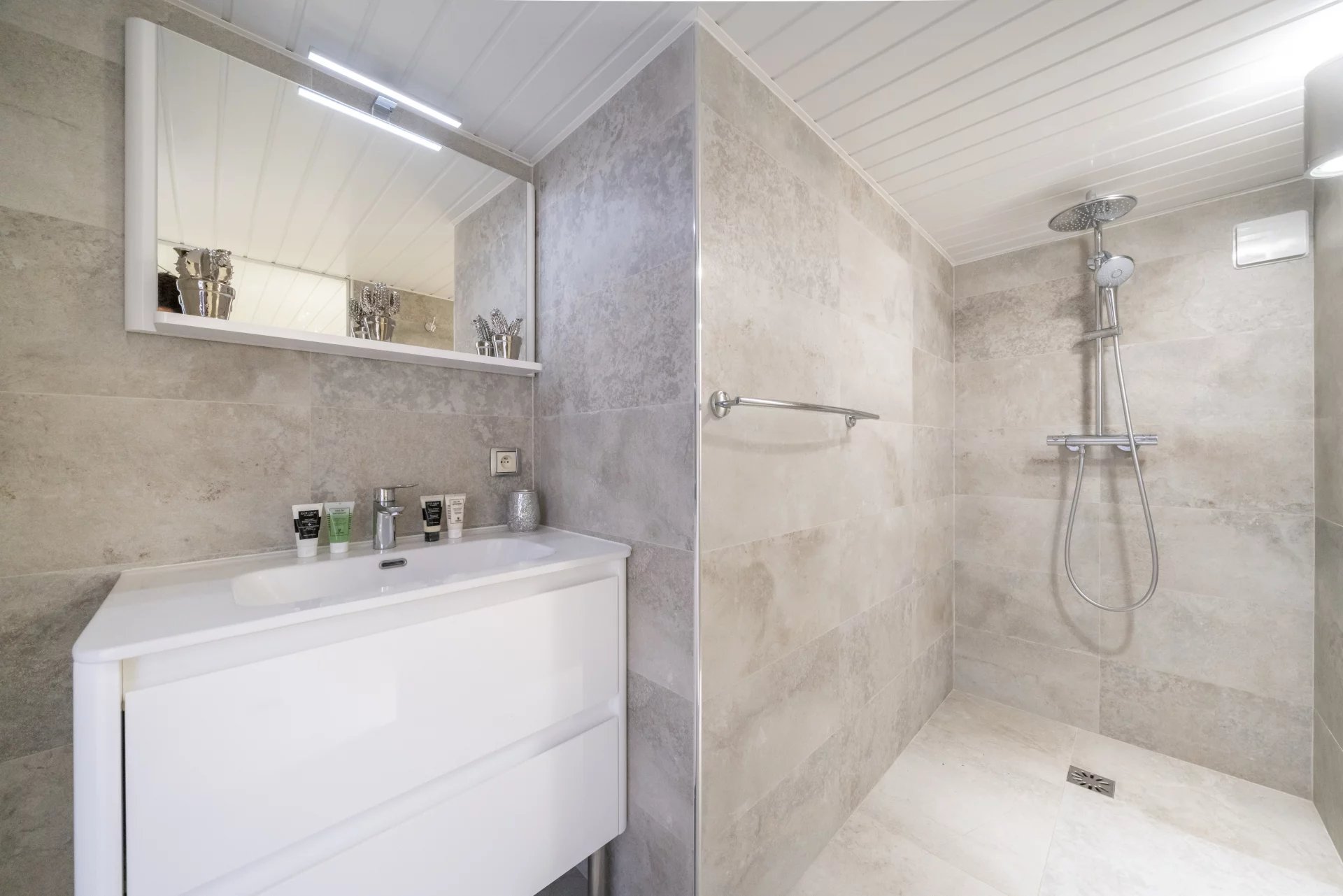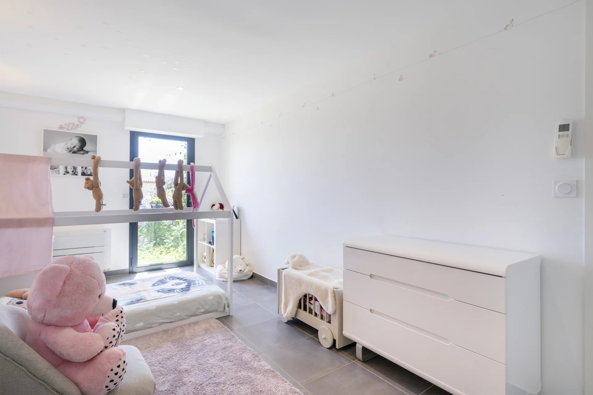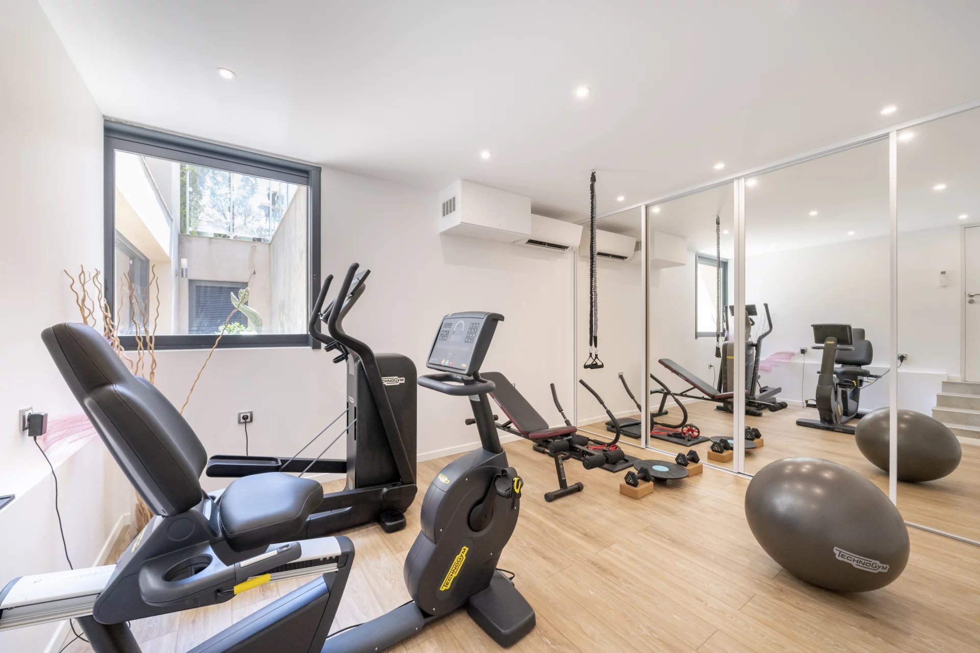 The basement includes a garage for one car, a well-equipped gym, storage spaces, a bedroom with a patio, a shower room with a hammam, a laundry room, a wine cellar, and a panic room. The first floor houses three bedrooms sharing a modern shower room.