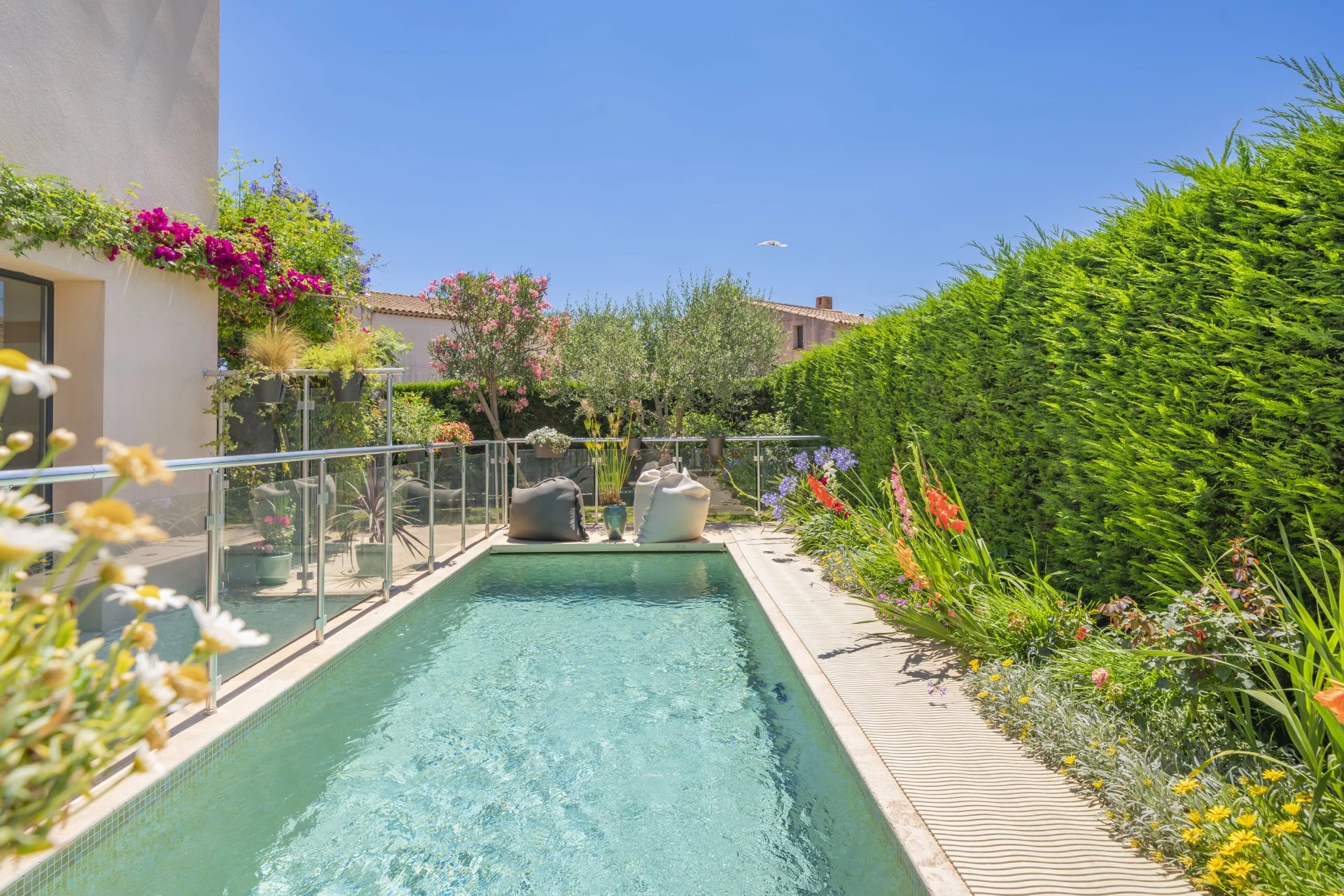The well-maintained garden of approximately 550 sqm features a heated pool and a vegetable garden, adding a touch of self-sufficiency to this lovely home.