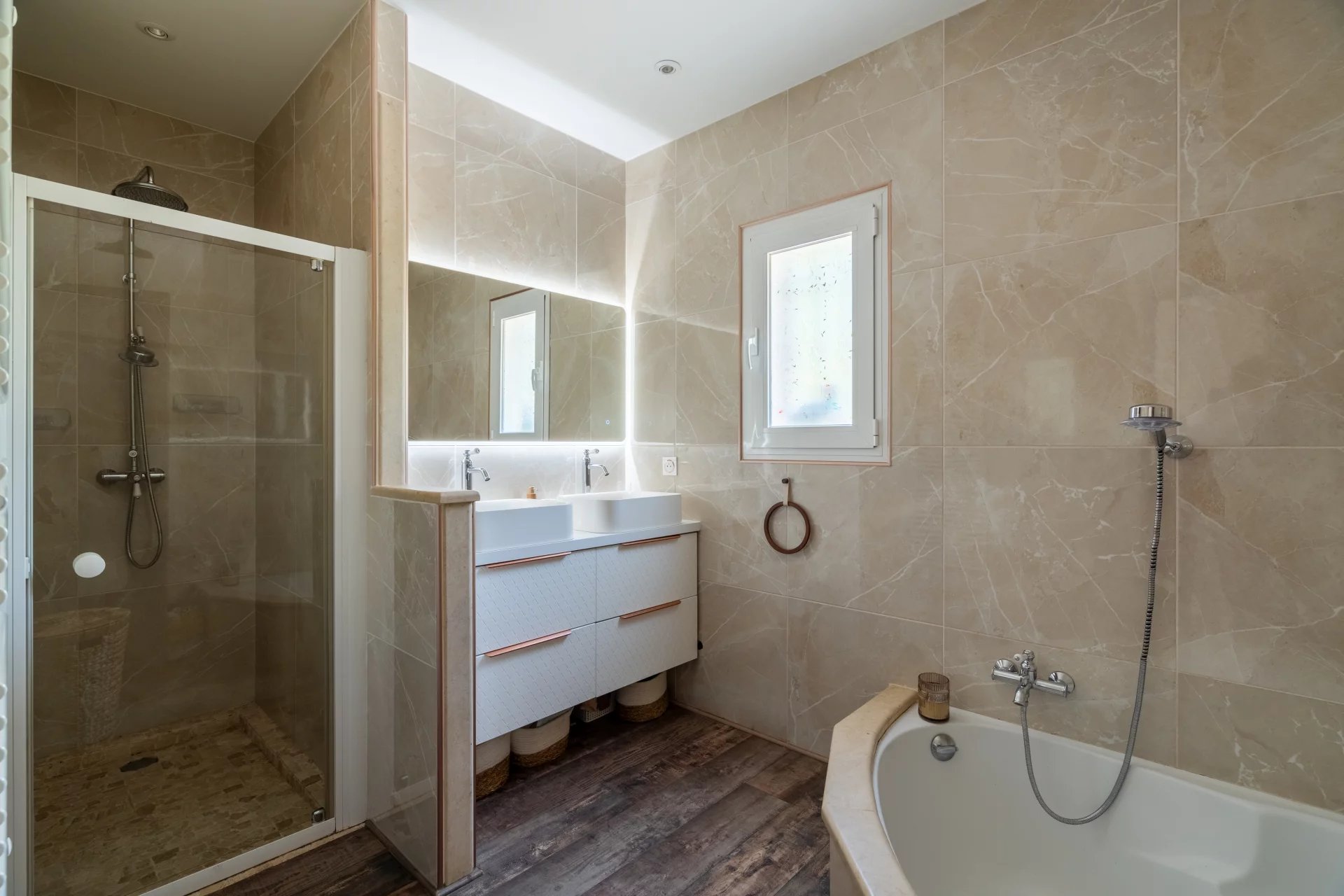 The night quarters include three bedrooms, a family bathroom (double vanity, corner bathtub, shower), and a master suite with private shower room. All living areas open directly onto a south-facing terrace, ideal for embracing Provence’s indoor–outdoor lifestyle.
