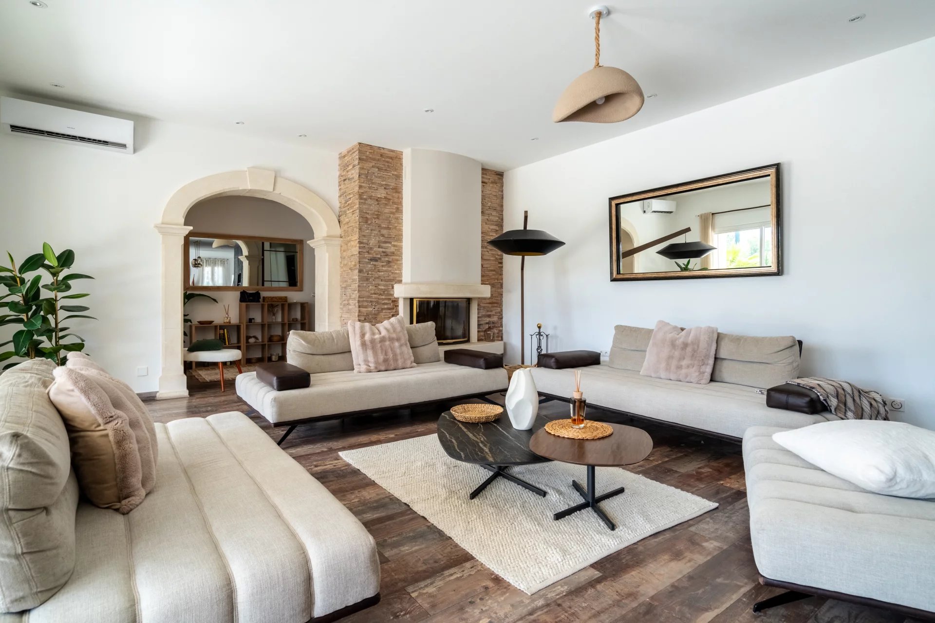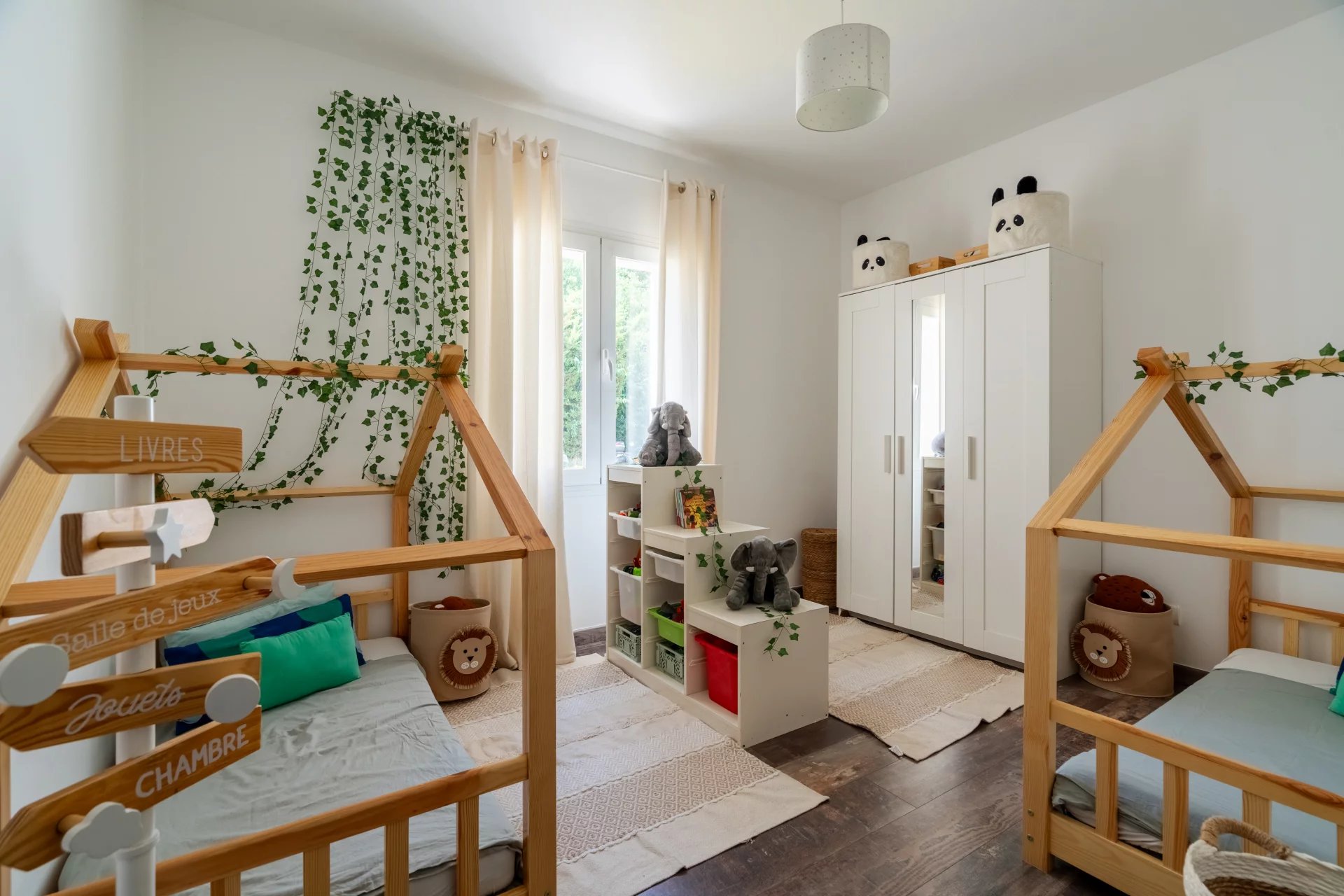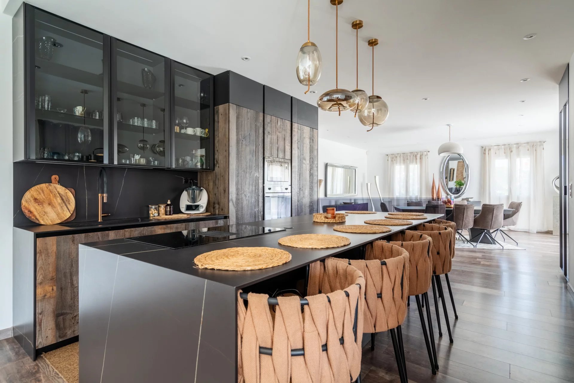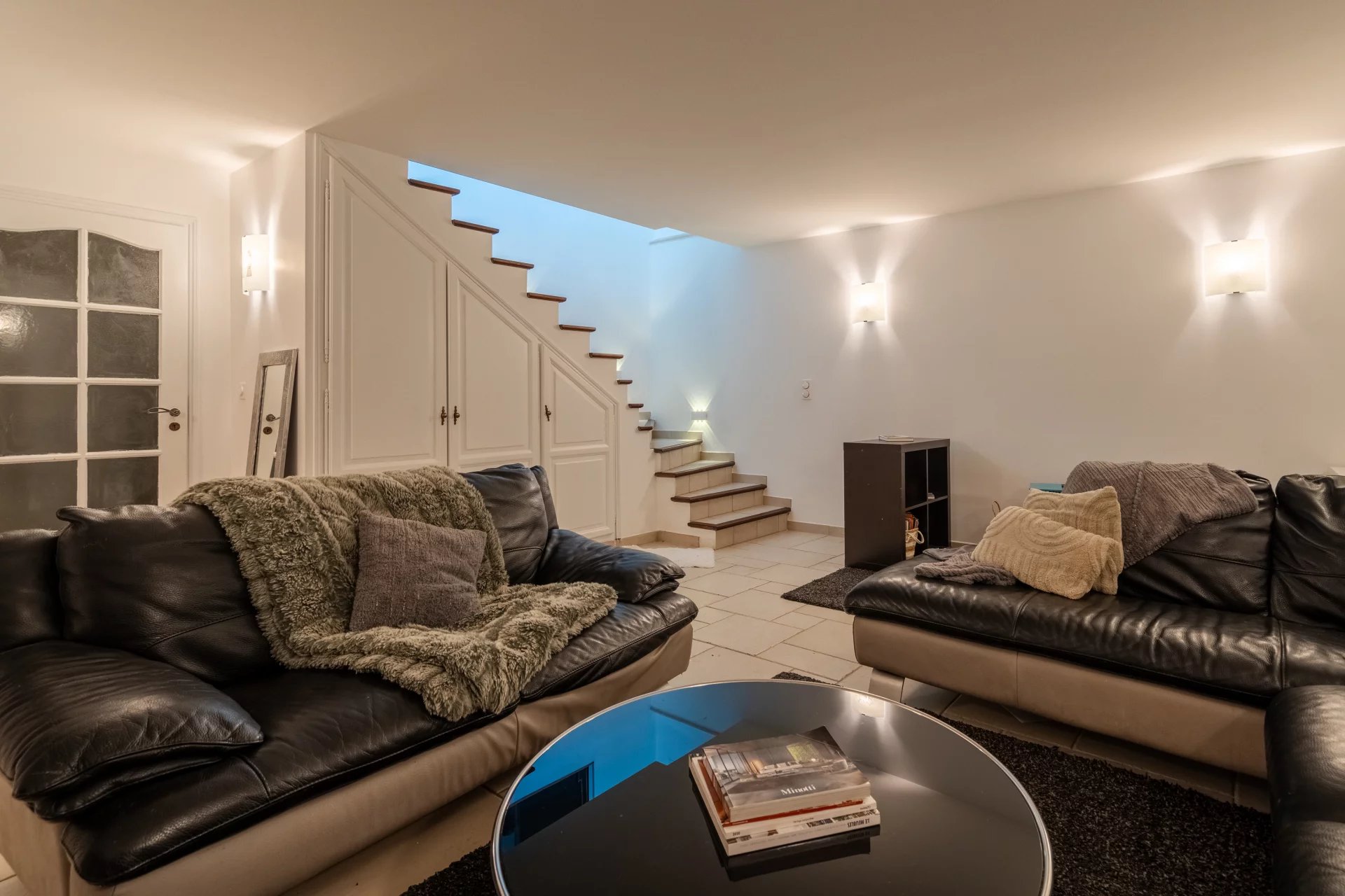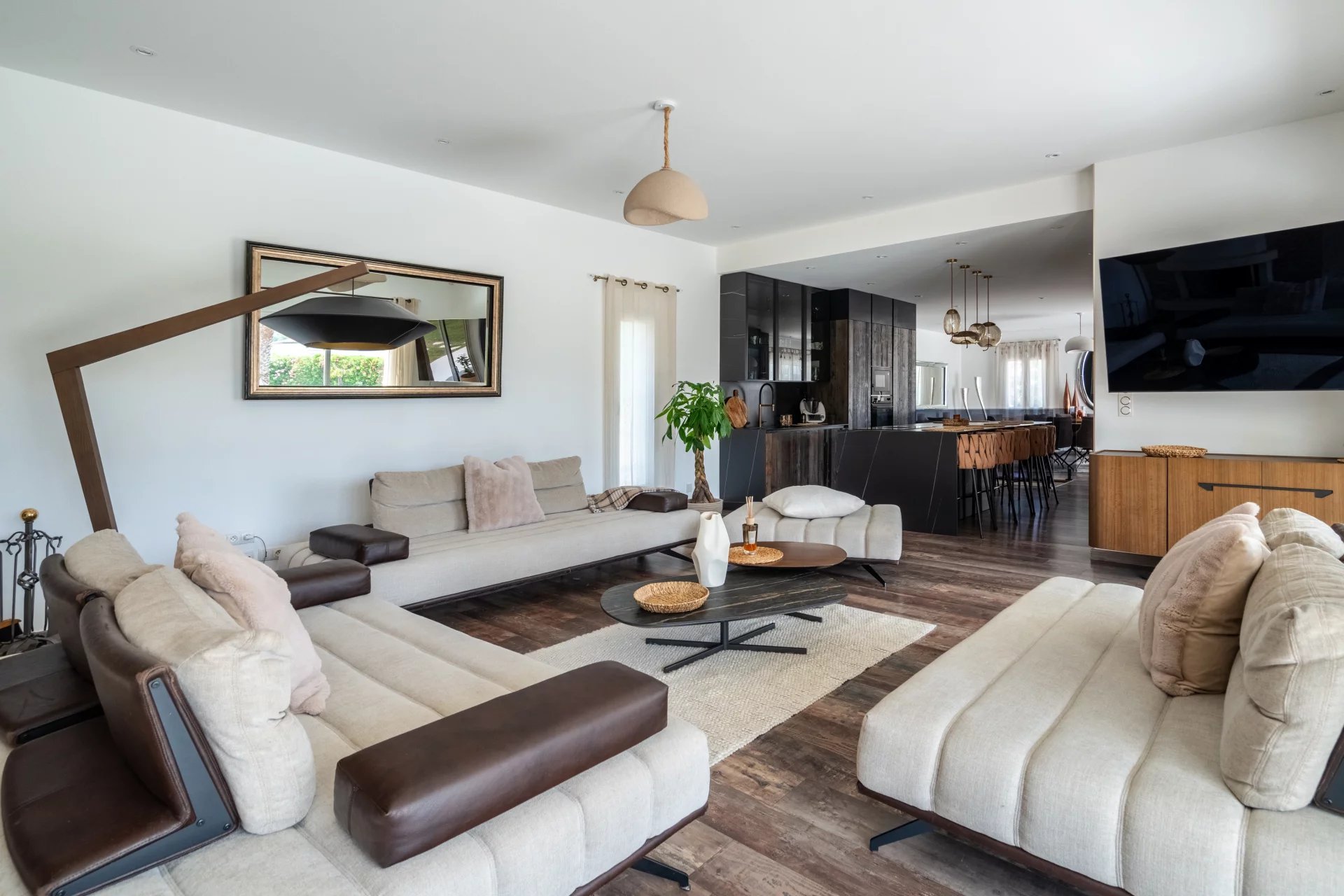 The entrance opens onto a bright living room with fireplace, seamlessly flowing into a contemporary kitchen and dining area, crafted with noble materials and bathed in natural light. A home office in souplex completes the living spaces, offering functionality and discretion.