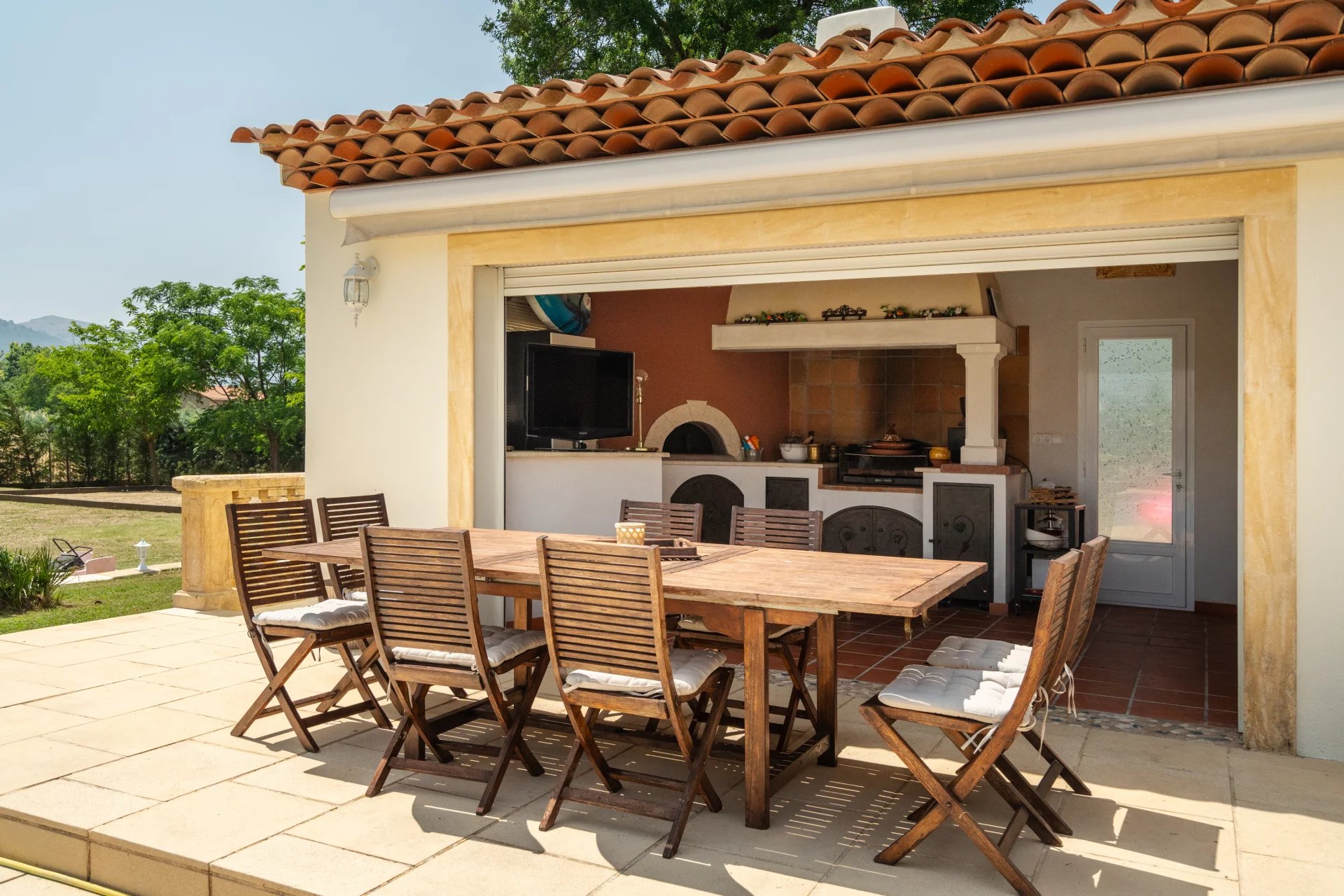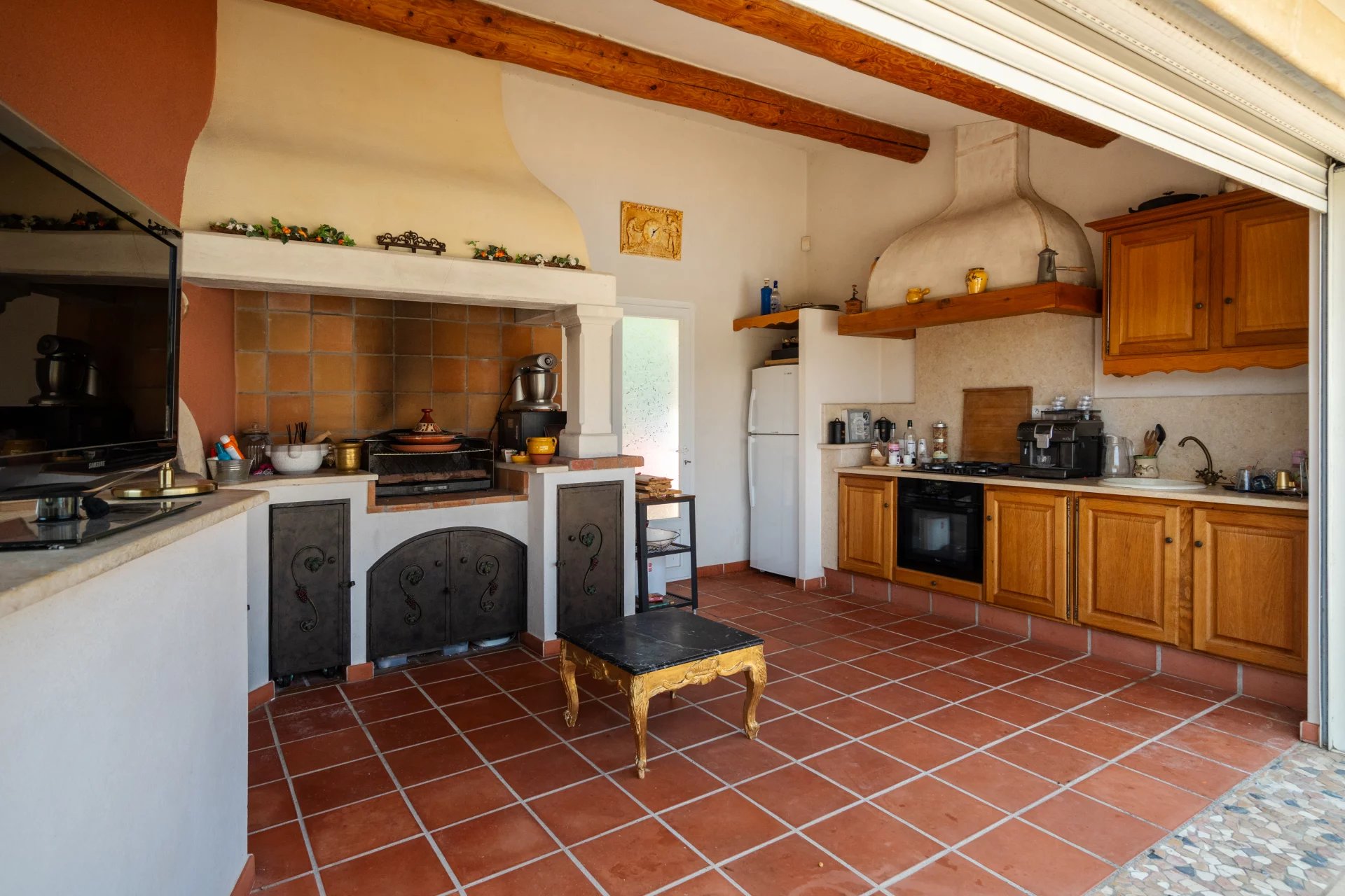 The landscaped garden reveals a 14 x 7 m heated swimming pool, complemented by a pool house designed as a true summer living room, complete with outdoor kitchen, pizza oven, barbecue, and a shower room with WC. A boulodrome invites convivial Provencal evenings. Carefully selected Mediterranean and rare species enhance the grounds, offering open views of the surrounding hills.