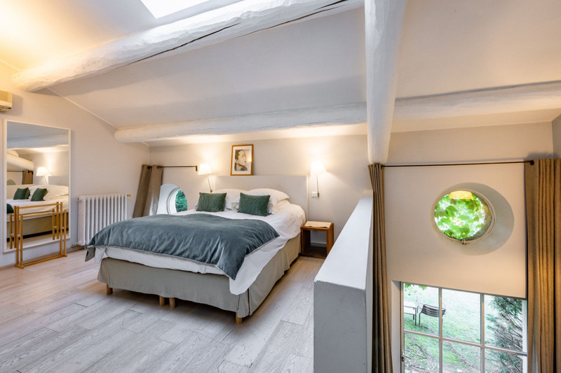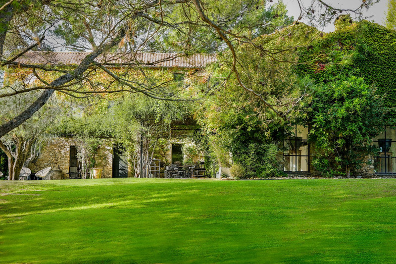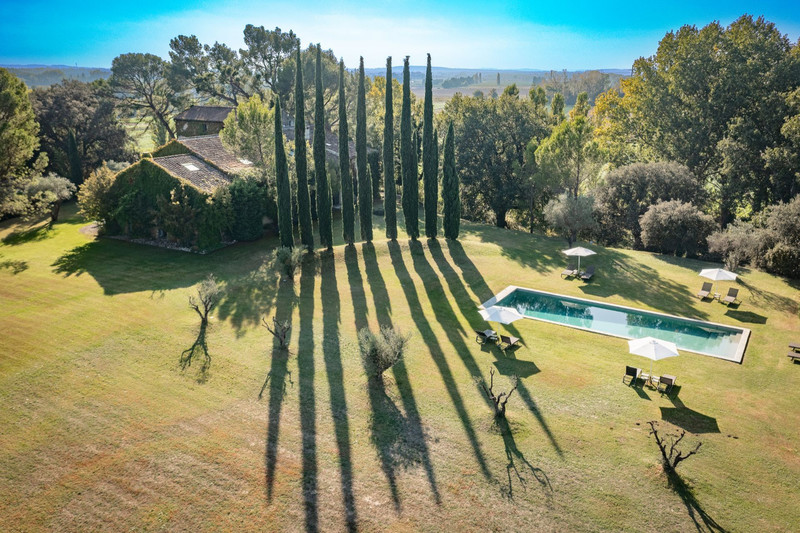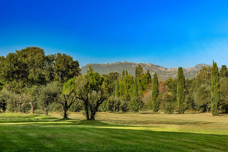 Authentic, 800 m2 farmhouse in an unobstructed position with exceptional views of the Dentelles de Montmirail and Mont Ventoux, set in 4.5 hectares of wooded parkland with pine and oak trees, an orchard and olive groves.