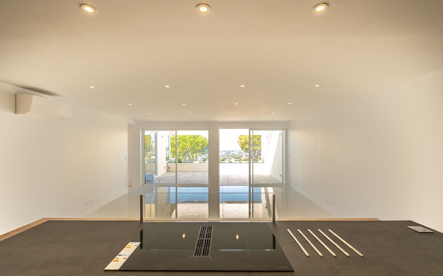 The living room opens onto a vast open-air terrace with breathtaking panoramic sea views, extending the reception space and creating an inviting setting for relaxation.