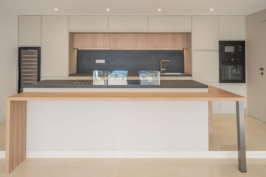 It offers an entrance hall with built-in cupboards, a spacious living area with a high-end fitted kitchen, a master bedroom with walk-in dressing room and shower room with WC, two additional bedrooms, a shower room, and a guest WC.