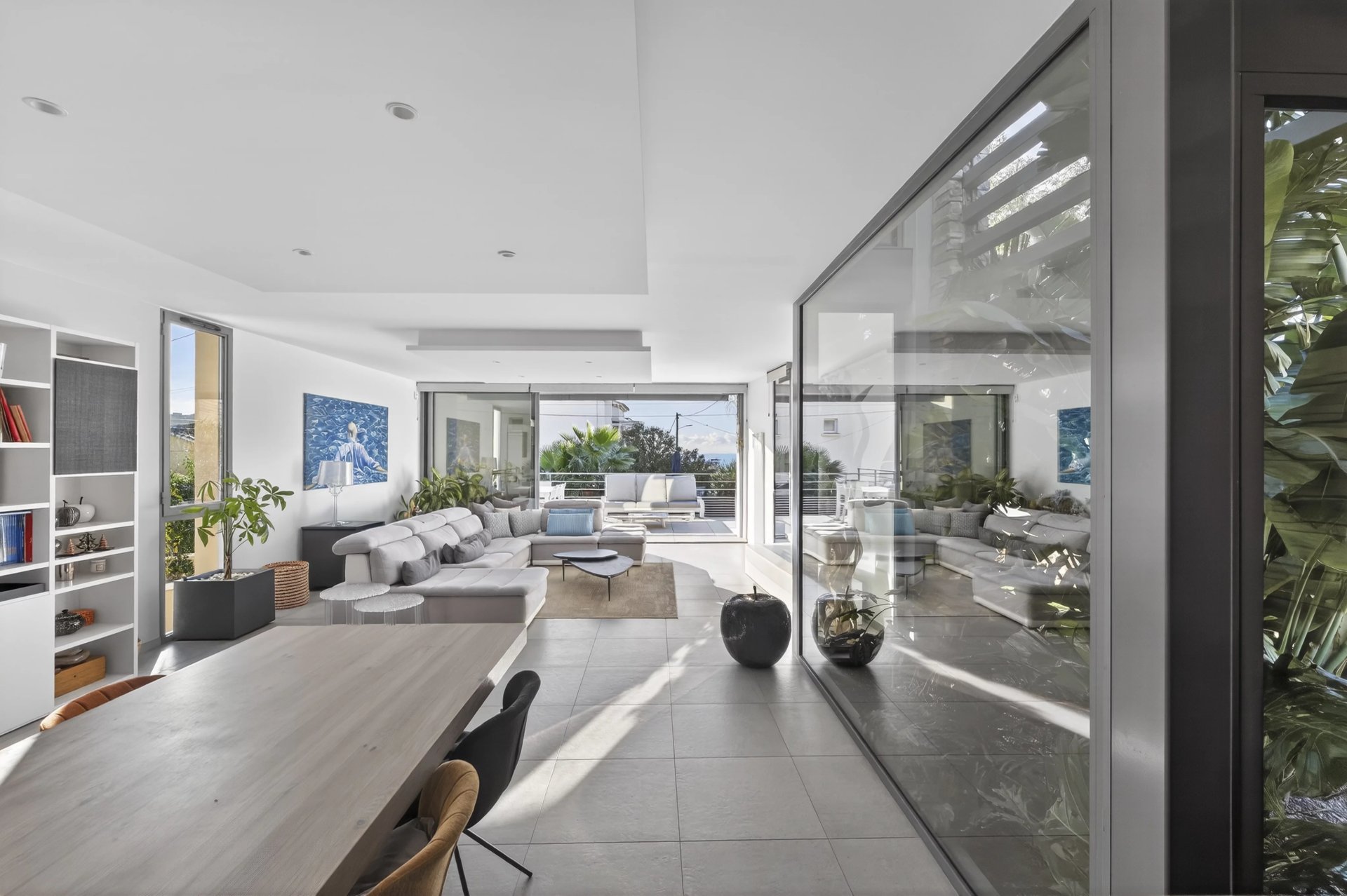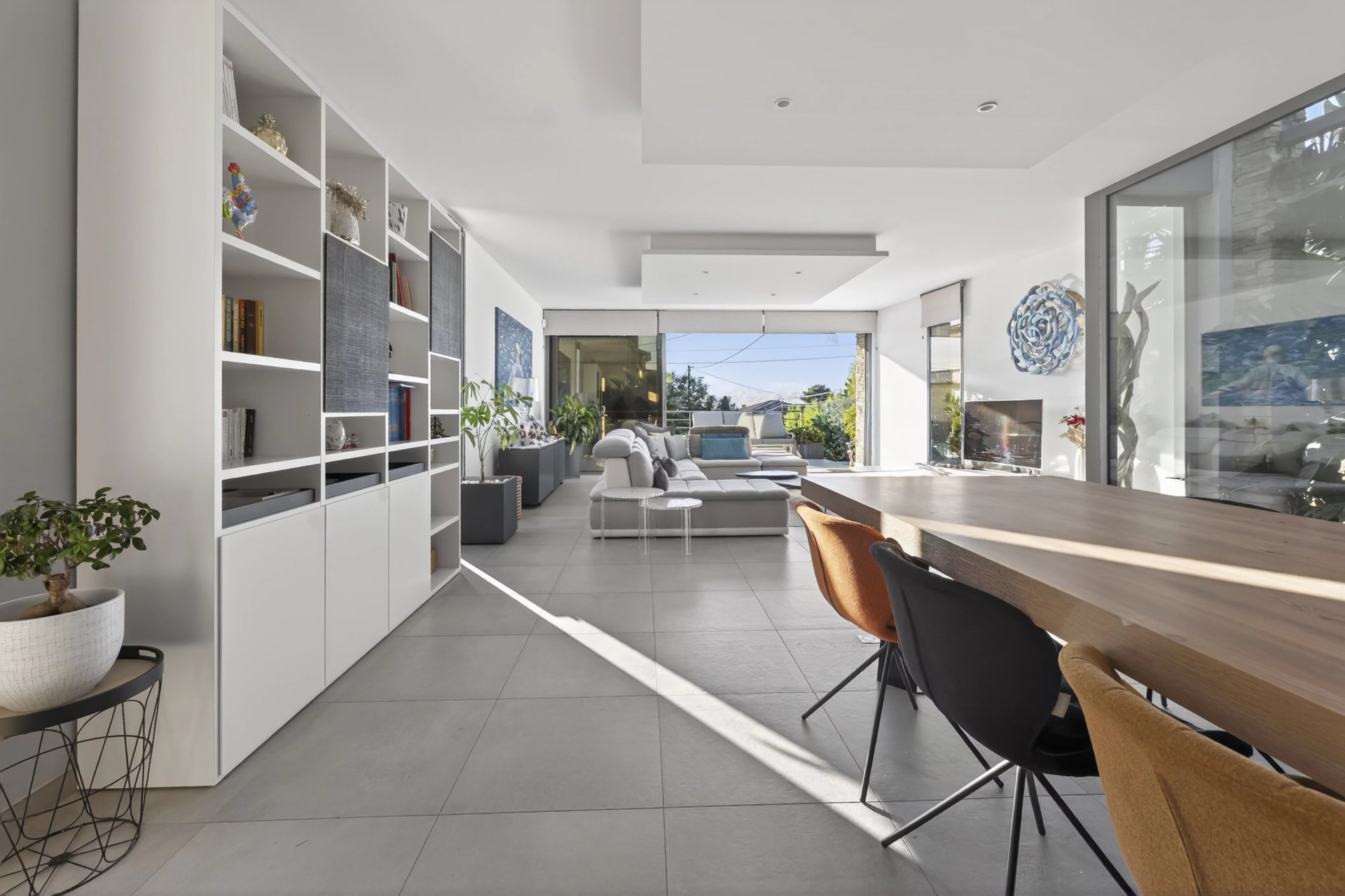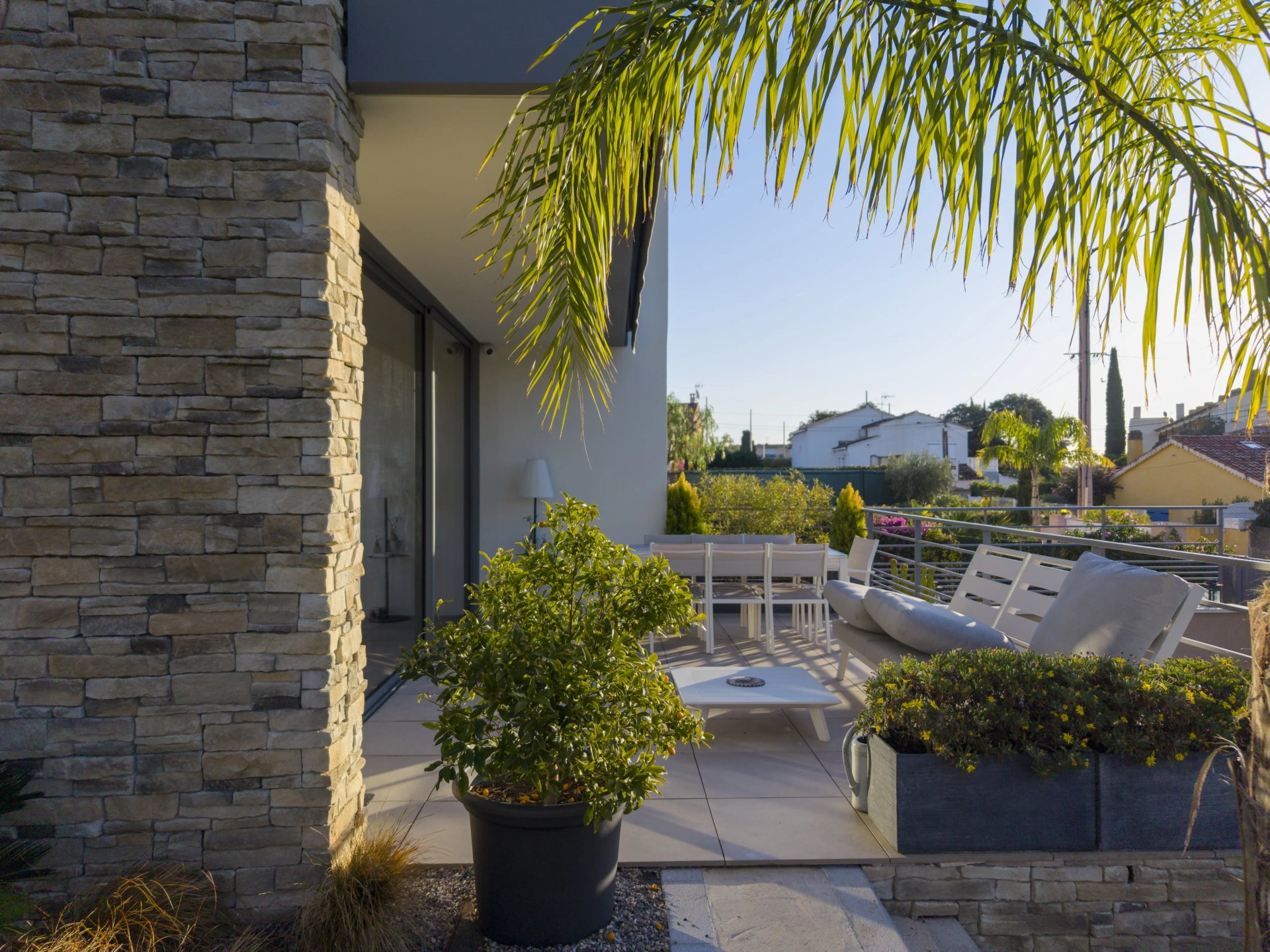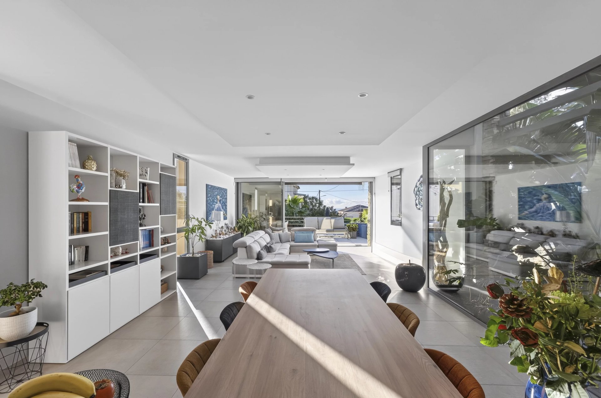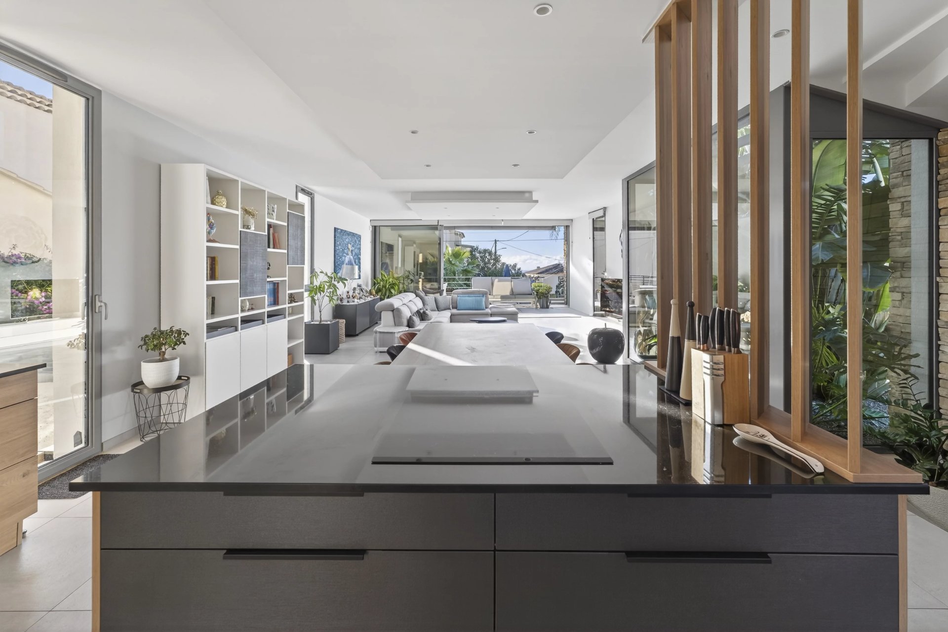 Offering approximately 157 m2 of living space over two levels, the property features bright, well-balanced volumes. The living area, open to a modern kitchen, extends generously onto a landscaped garden with exotic-inspired design, creating a natural flow between indoor and outdoor spaces.