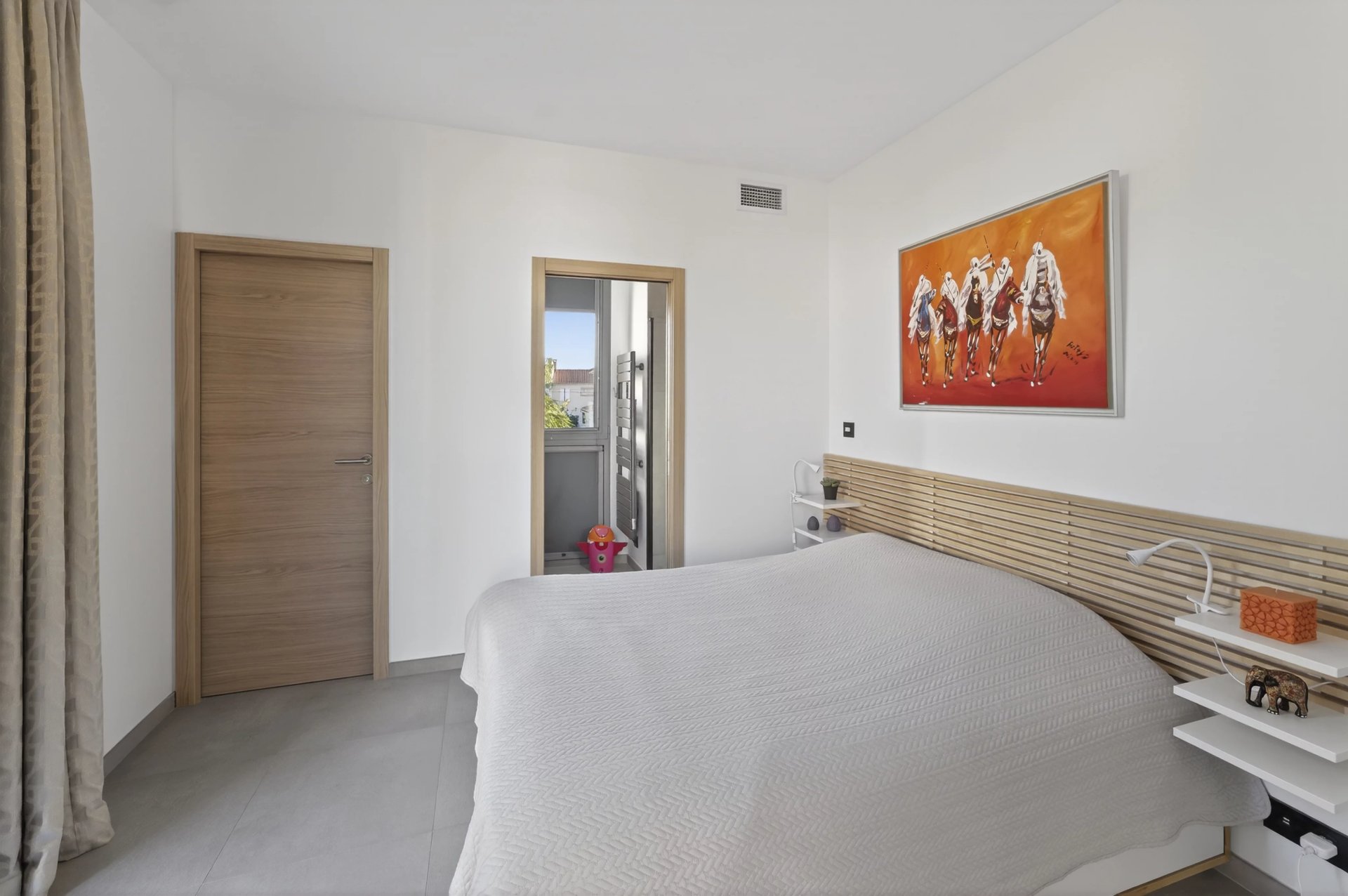 The sleeping area comprises three en-suite bedrooms, each with its own shower room, including a principal suite that enjoys a pleasant sea view.