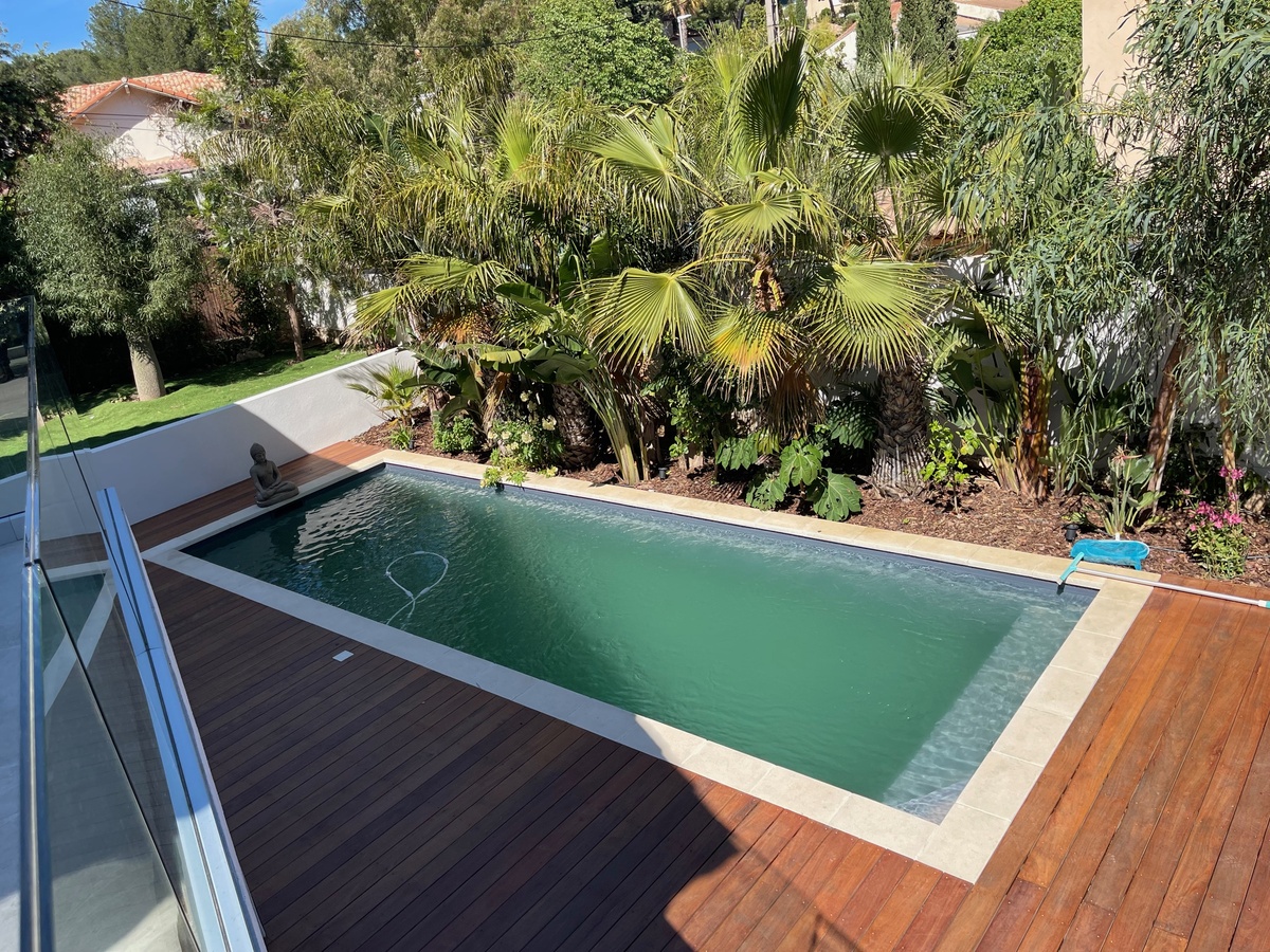 It features all the hallmarks of a contemporary villa: aluminium sliding patio doors, new semi-open, fully-equipped kitchen, reversible air conditioning, electric roller shutters, new 9 x 3 m swimming pool with large Cumaru terrace, top-quality fixtures and fittings.