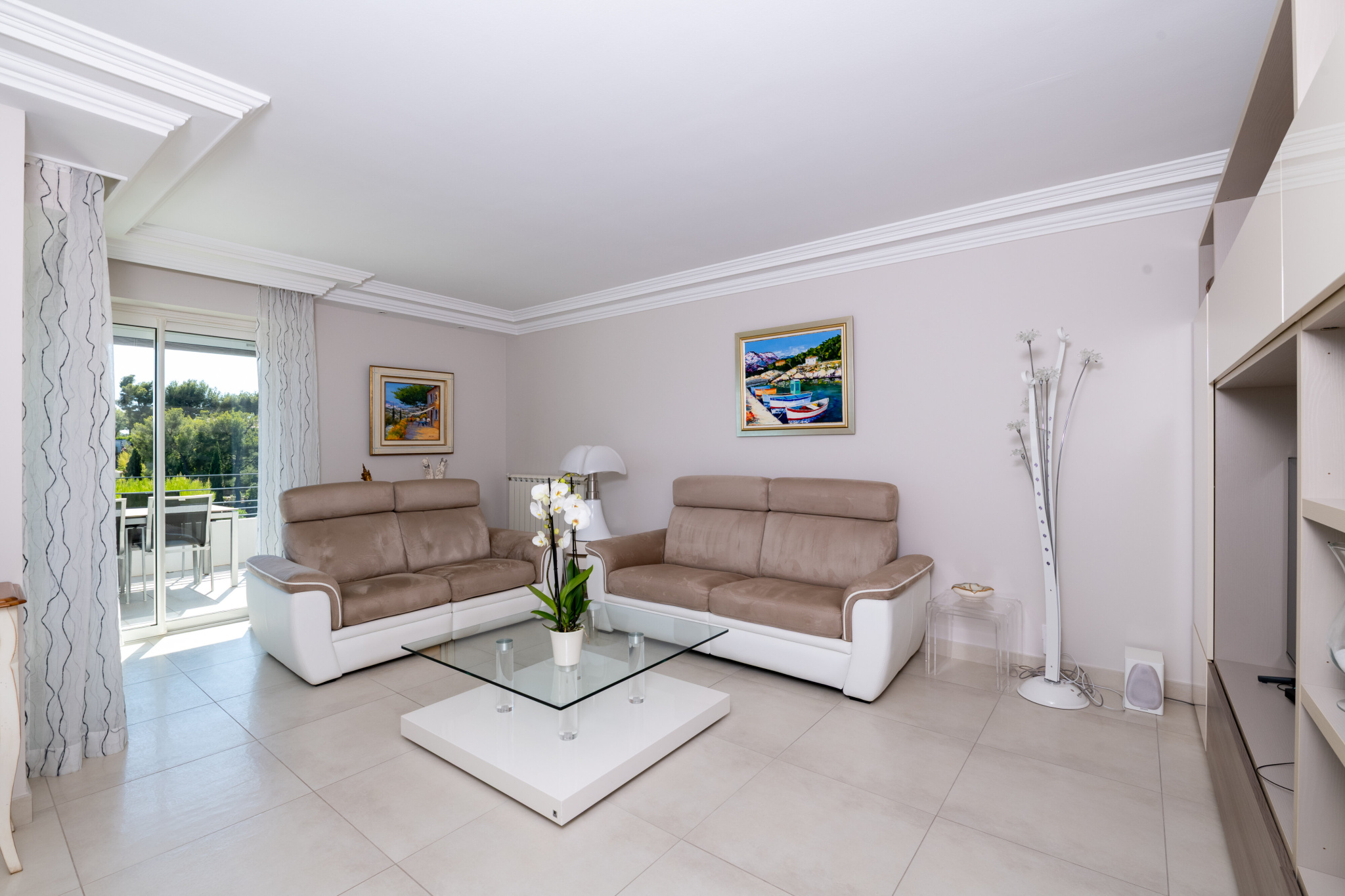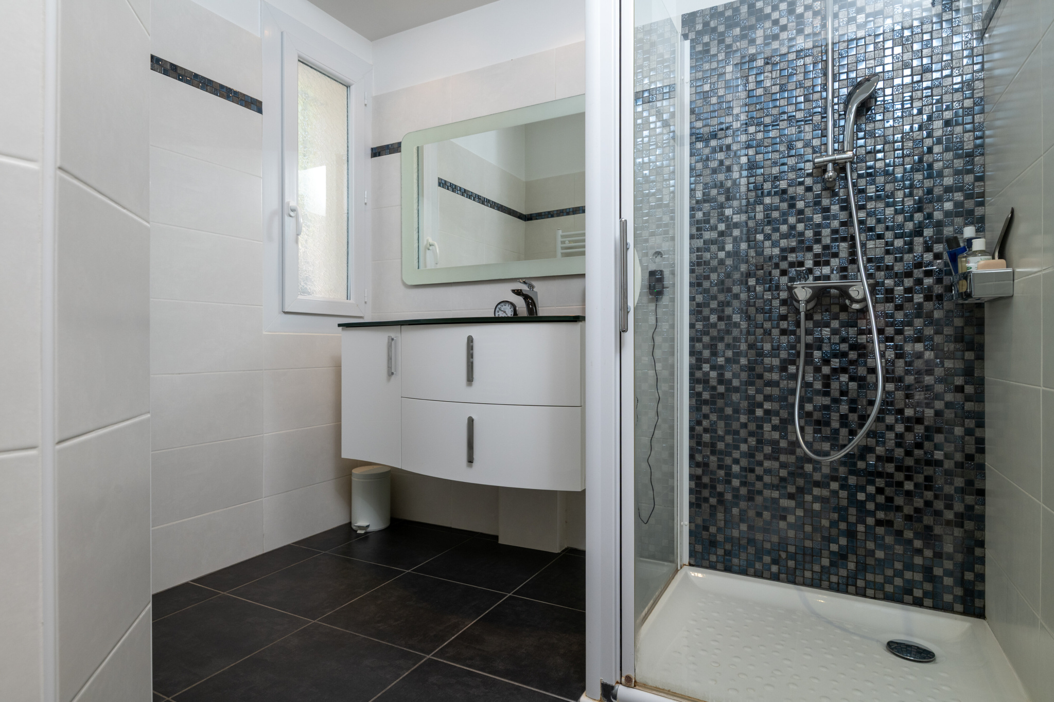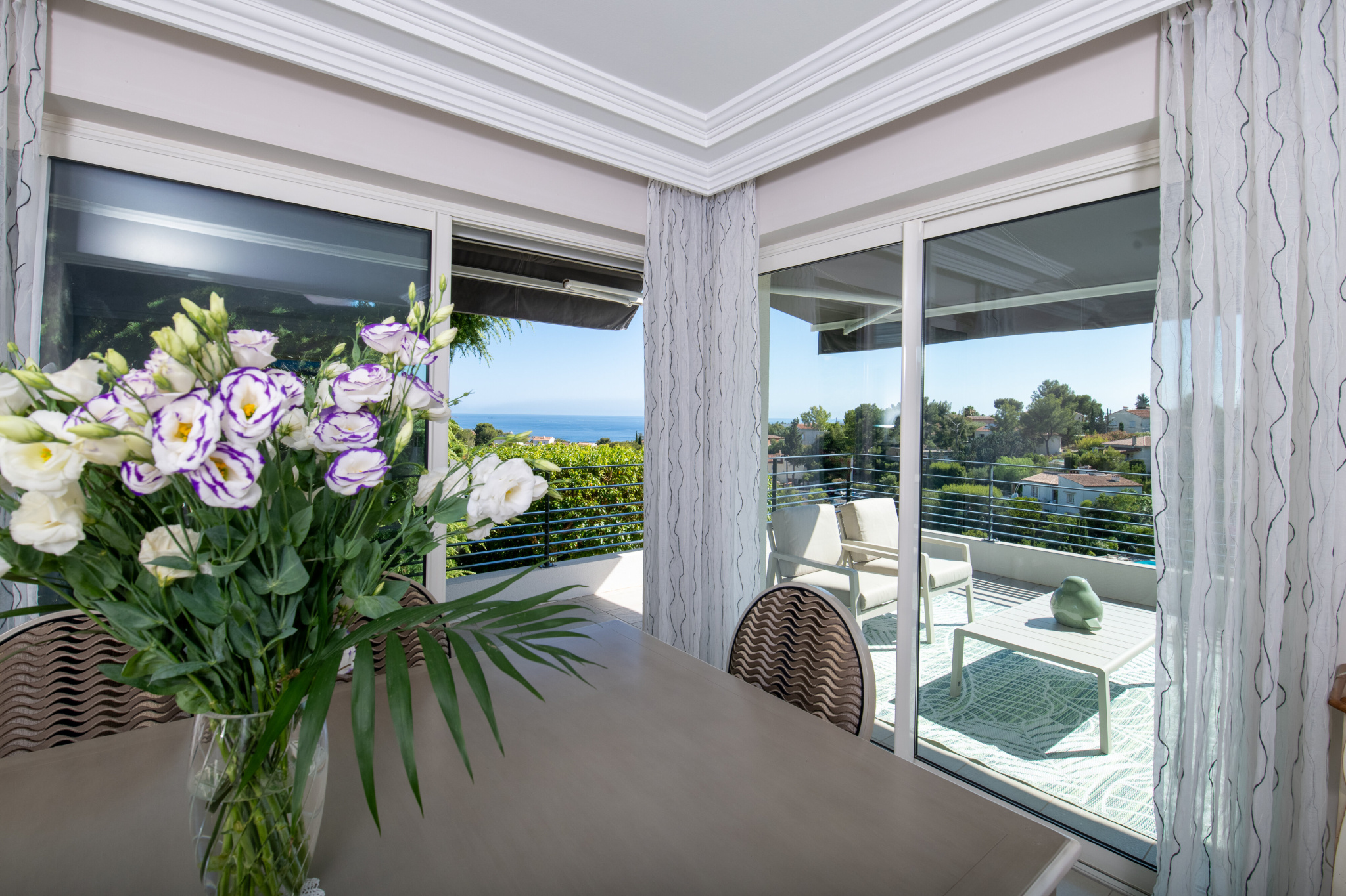 Access is effortlessly smooth via a wide driveway leading to a generous parking area, from which you enter the main level entirely on the flat. Here, an entrance hall opens onto a light-filled living room, an independent fully-equipped kitchen, and guest cloakroom. The night space features three bedrooms, a bathroom, a shower room and two separate WCs. Every room opens directly onto a large south-facing terrace, framing spectacular sea views and creating an elegant extension of the interiors into the outdoors.