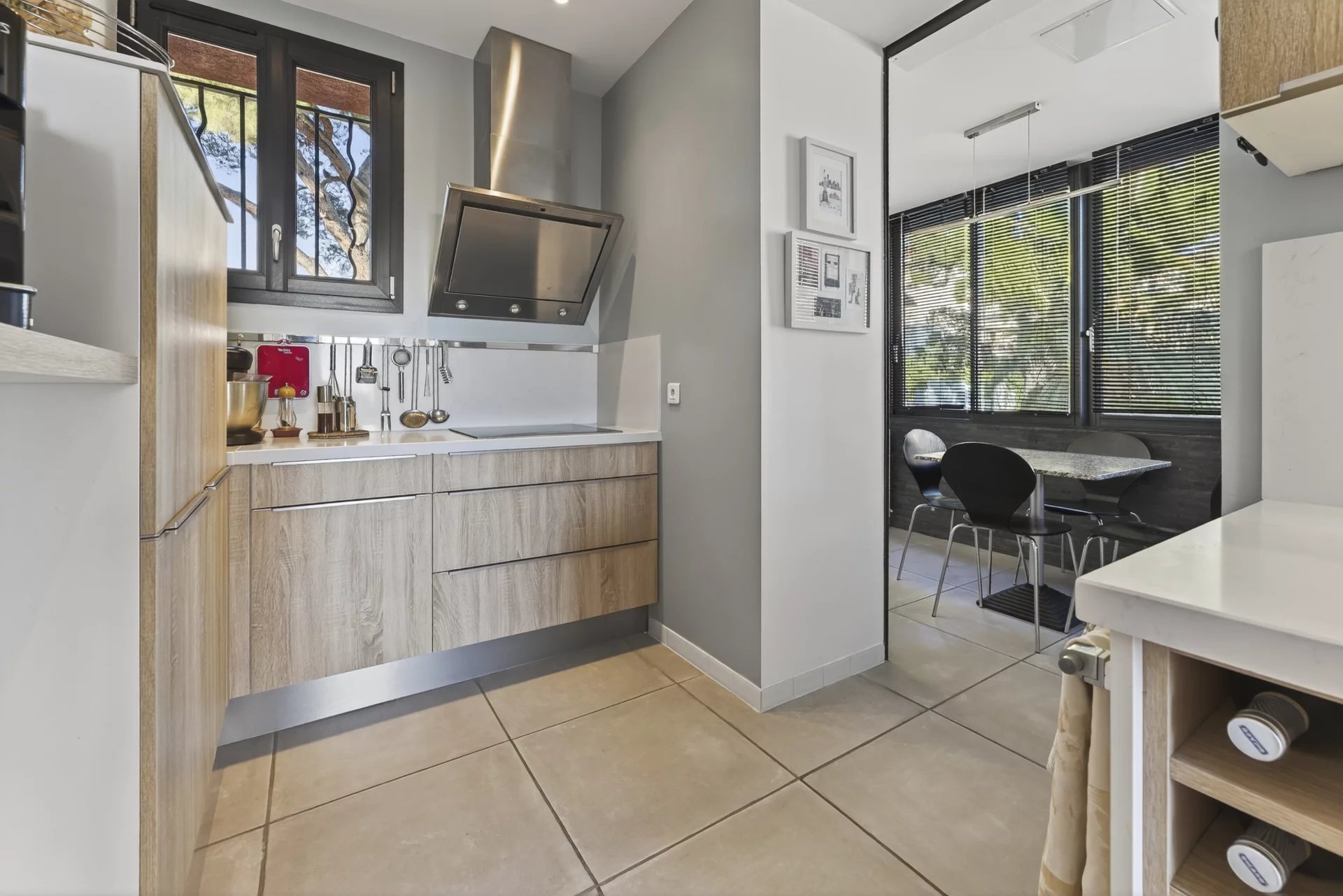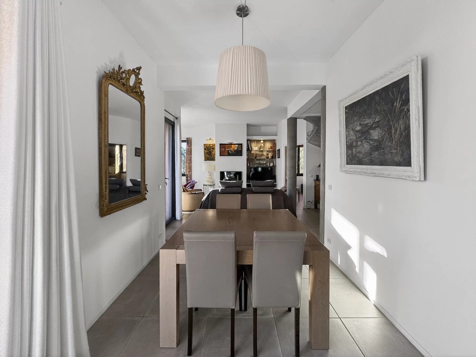Outside, the 4 x 8.5 m swimming pool, equipped with a rolling cover, blends seamlessly into the beautifully landscaped garden enhanced with cypress trees, olive trees, mimosas, and Phoenix palm trees. The property also benefits from an automatic gate and several parking spaces.