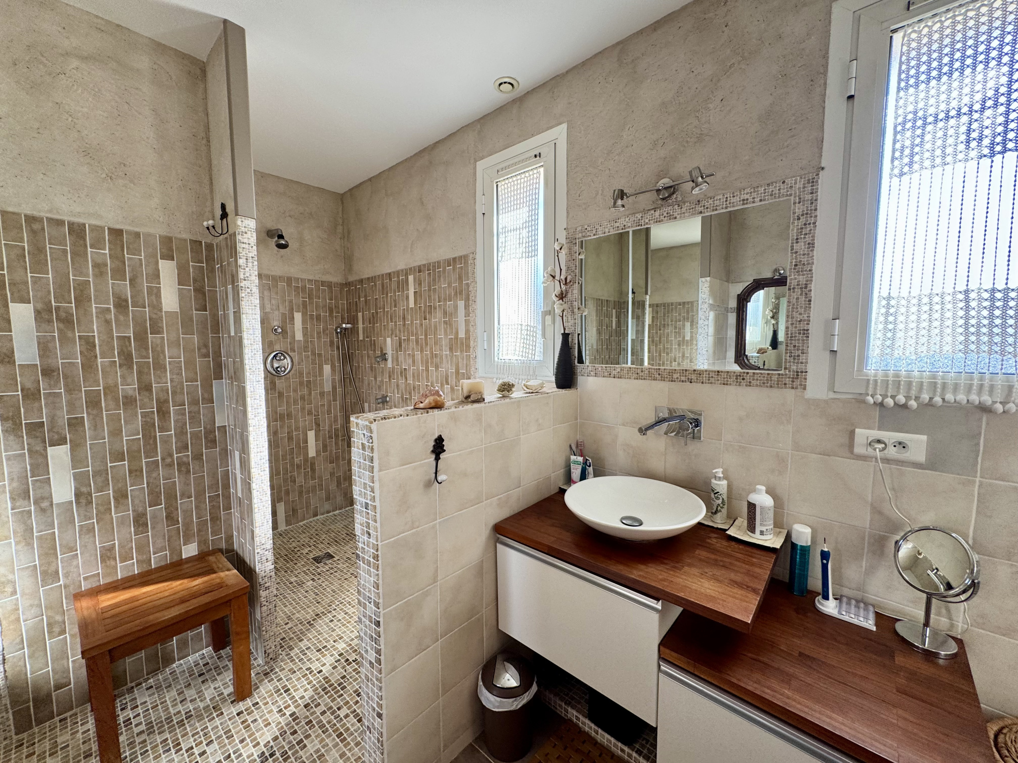 Set on 1,120 m2of flat, enclosed grounds, the villa provides a total of 227 m2 of living space divided into two independent residences, each with private entrances and well-appointed interiors.