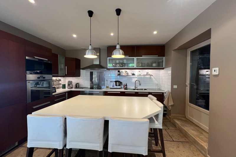 Located within walking distance of the town square, shops, and restaurants, the house offers 190 m2 of living space on three floors. The ground floor features a spacious and bright living room with a fireplace and direct access. to the terrace and pool area. The open, fully equipped kitchen has access to a practical storage room.