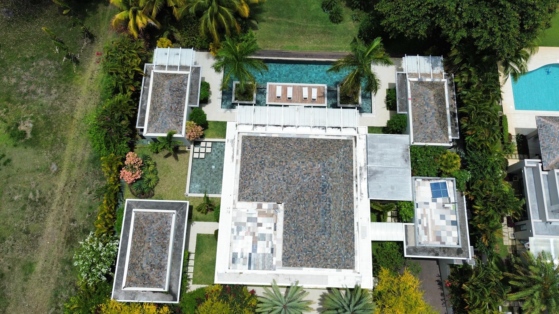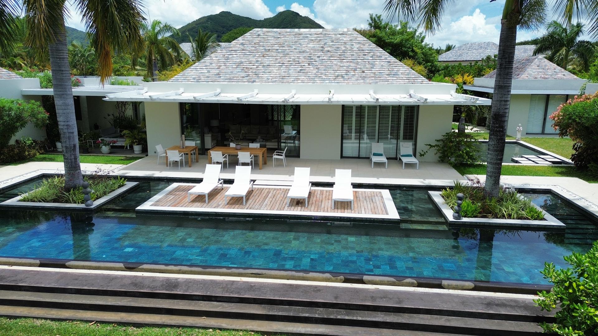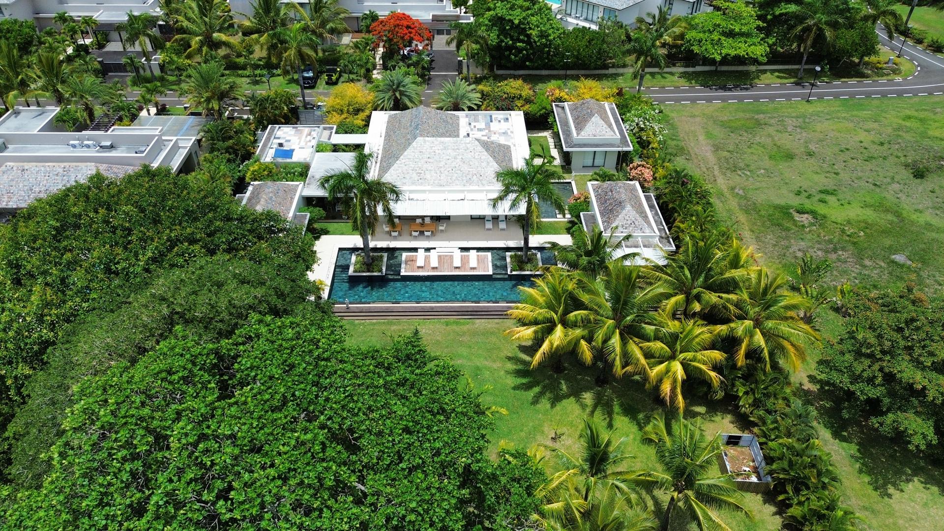 Upon arrival, this 5-bedroom villa reveals itself as a refined private retreat, where architectural balance and landscaped serenity immediately set the tone. Located within the prestigious Anahita Estate, you will enjoy both indoor and outdoor space and intimacy. The villa opens onto a striking living space defined by a pitched ceiling and a generous space, where natural light filters in from all sides and draws the eye toward the elegant swimming pool and the uninterrupted greenery of the golf course beyond.To the left, the master suite enjoys a discreet and privileged position, offering a true sanctuary with dual en-suite bathrooms and 2 expansive dressing rooms for Mr and Mrs, thoughtfully designed to provide comfort, privacy, and effortless daily living. From the central living area, the home unfolds into 4 distinct pavilions, each accessed independently from the exterior, enhancing both privacy and functionality; 2 host beautifully appointed guest suites, ideal for hosting family and friends, while another serves as a quiet study, and the 4th accommodates the main kitchen along with the laundry and storage areas, all designed to combine practicality with understated elegance. Adjacent to the kitchen, a shaded veranda wrapped in lush tropical planting and the stunning swimming pool offers an inviting outdoor living space, perfectly suited for relaxed mornings or chic evening gatherings.Completing the property, you will also find a spacious underground garage,that houses technical installations, such as water pumps and storage tanks, while providing ample secure parking and storage.This property is a definite must-see.Contact us for a visit.