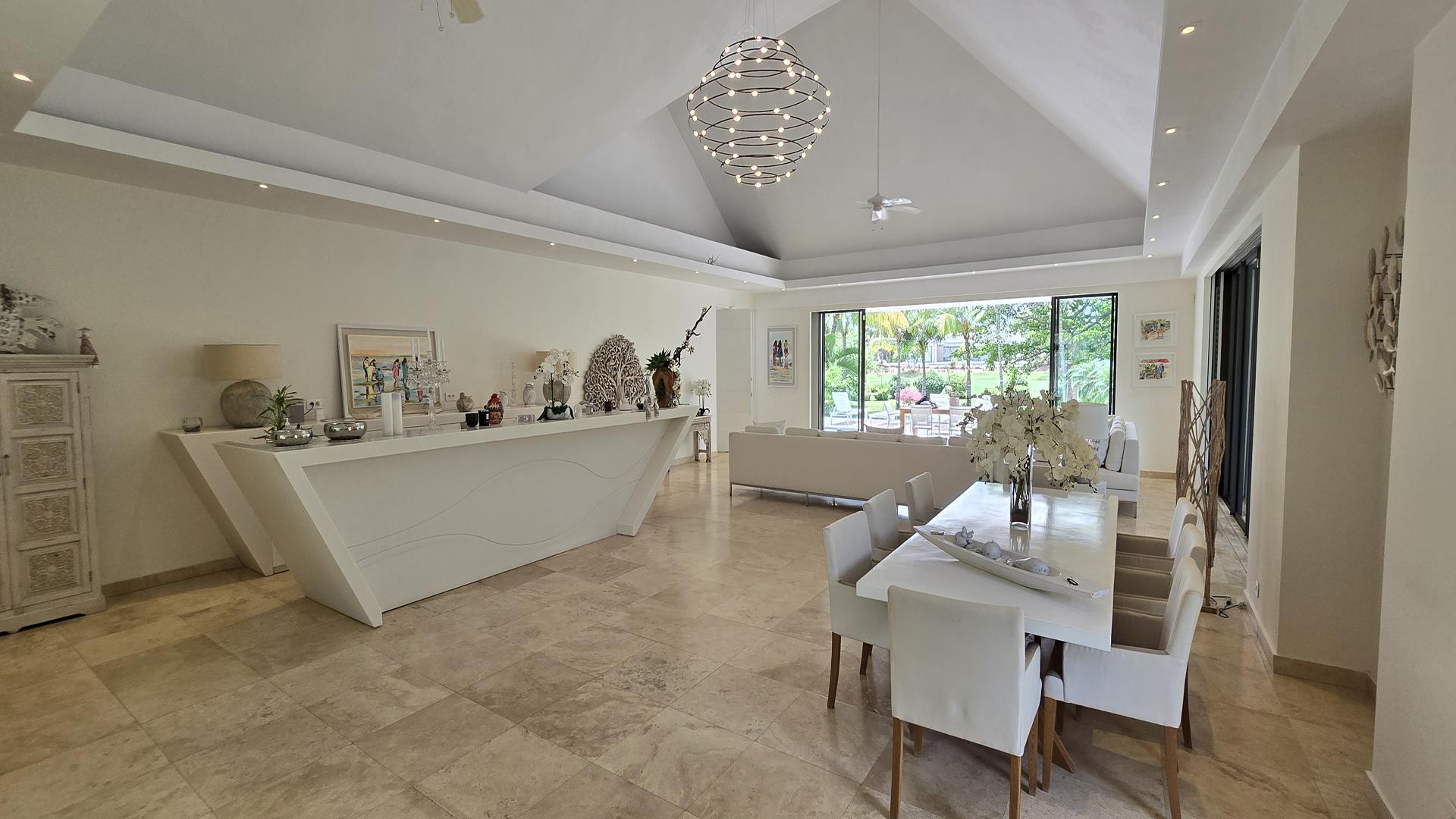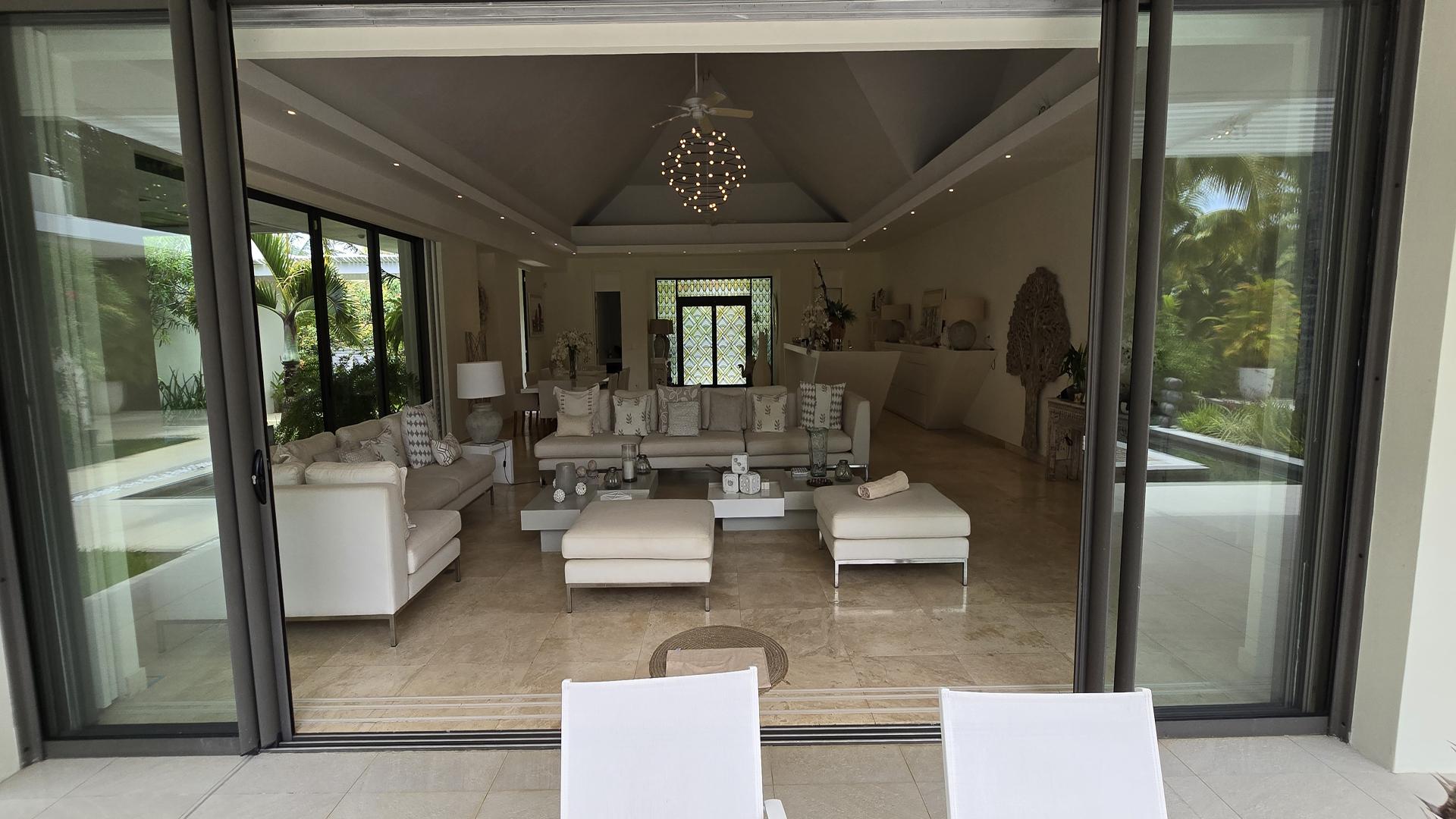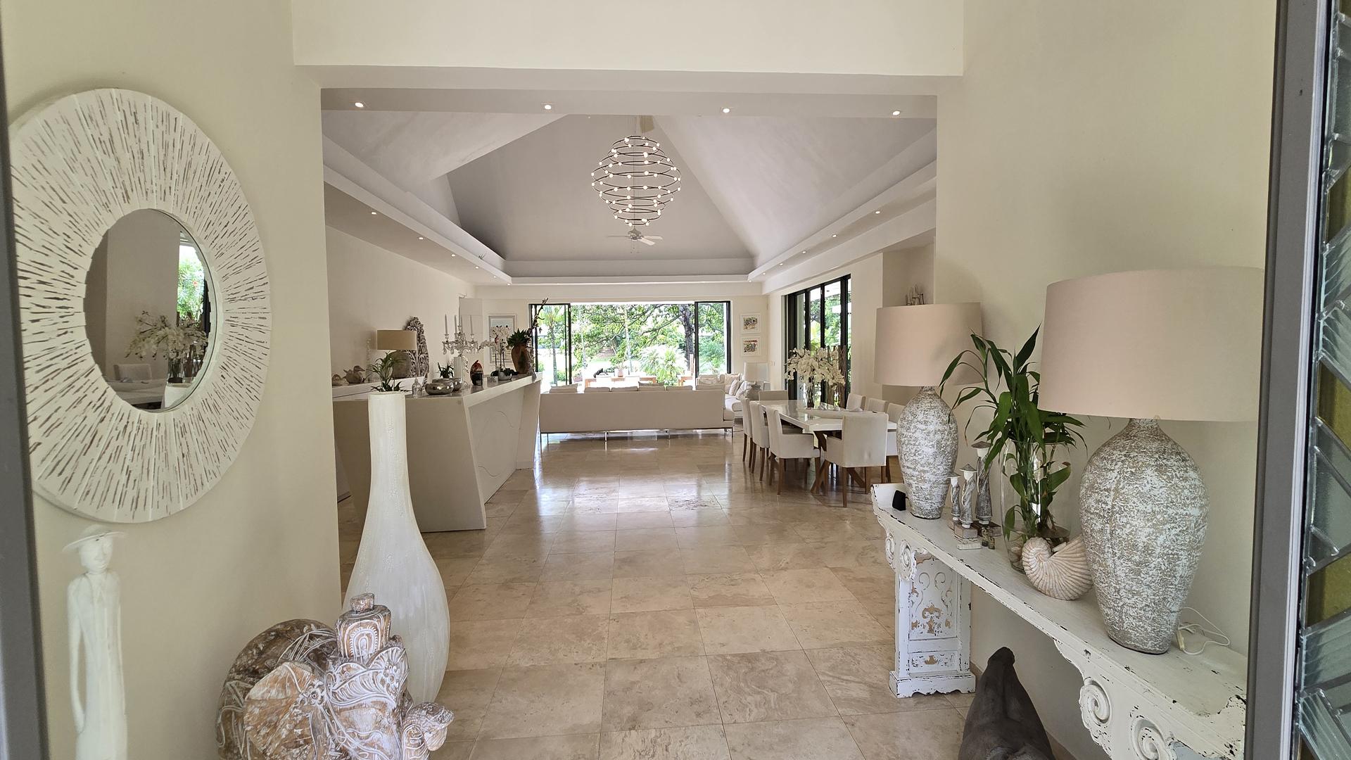 Upon arrival, this 5-bedroom villa reveals itself as a refined private retreat, where architectural balance and landscaped serenity immediately set the tone. Located within the prestigious Anahita Estate, you will enjoy both indoor and outdoor space and intimacy. The villa opens onto a striking living space defined by a pitched ceiling and a generous space, where natural light filters in from all sides and draws the eye toward the elegant swimming pool and the uninterrupted greenery of the golf course beyond.To the left, the master suite enjoys a discreet and privileged position, offering a true sanctuary with dual en-suite bathrooms and 2 expansive dressing rooms for Mr and Mrs, thoughtfully designed to provide comfort, privacy, and effortless daily living. From the central living area, the home unfolds into 4 distinct pavilions, each accessed independently from the exterior, enhancing both privacy and functionality; 2 host beautifully appointed guest suites, ideal for hosting family and friends, while another serves as a quiet study, and the 4th accommodates the main kitchen along with the laundry and storage areas, all designed to combine practicality with understated elegance. Adjacent to the kitchen, a shaded veranda wrapped in lush tropical planting and the stunning swimming pool offers an inviting outdoor living space, perfectly suited for relaxed mornings or chic evening gatherings.Completing the property, you will also find a spacious underground garage,that houses technical installations, such as water pumps and storage tanks, while providing ample secure parking and storage.This property is a definite must-see.Contact us for a visit.