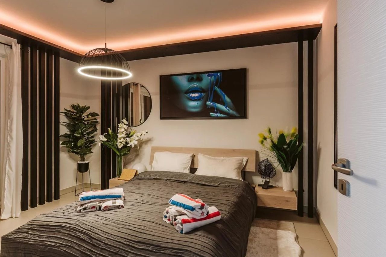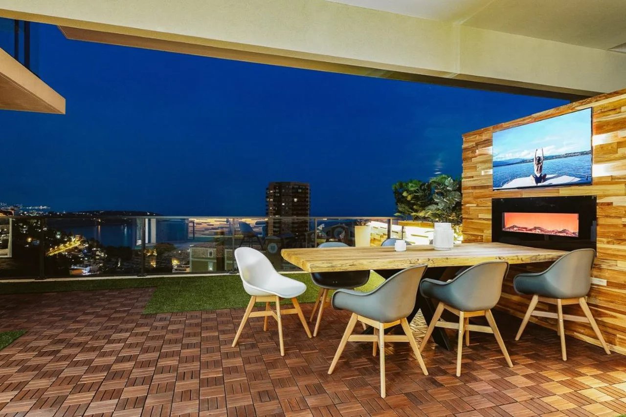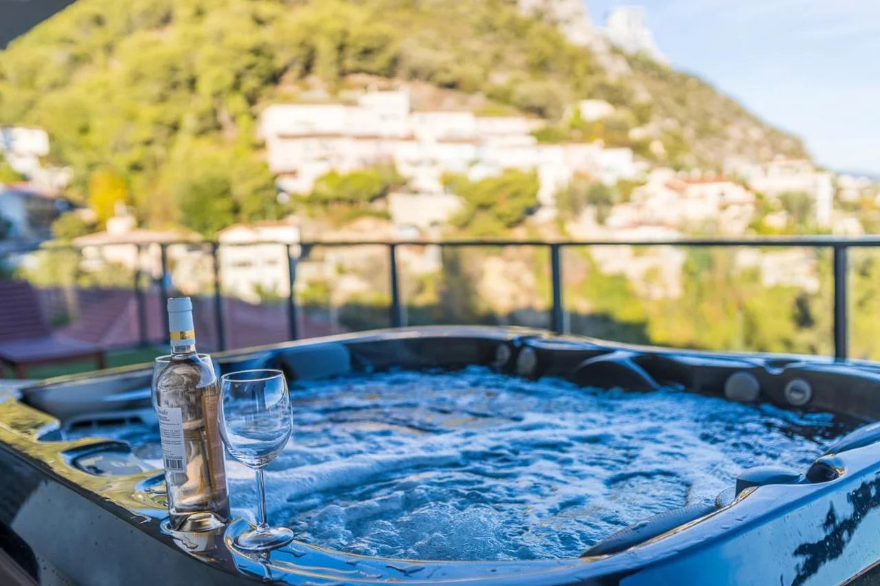 This property features a spacious terrace of 96 m2 with panoramic views, complemented by a private Jacuzzi, an outdoor dining area with heating, and a television.