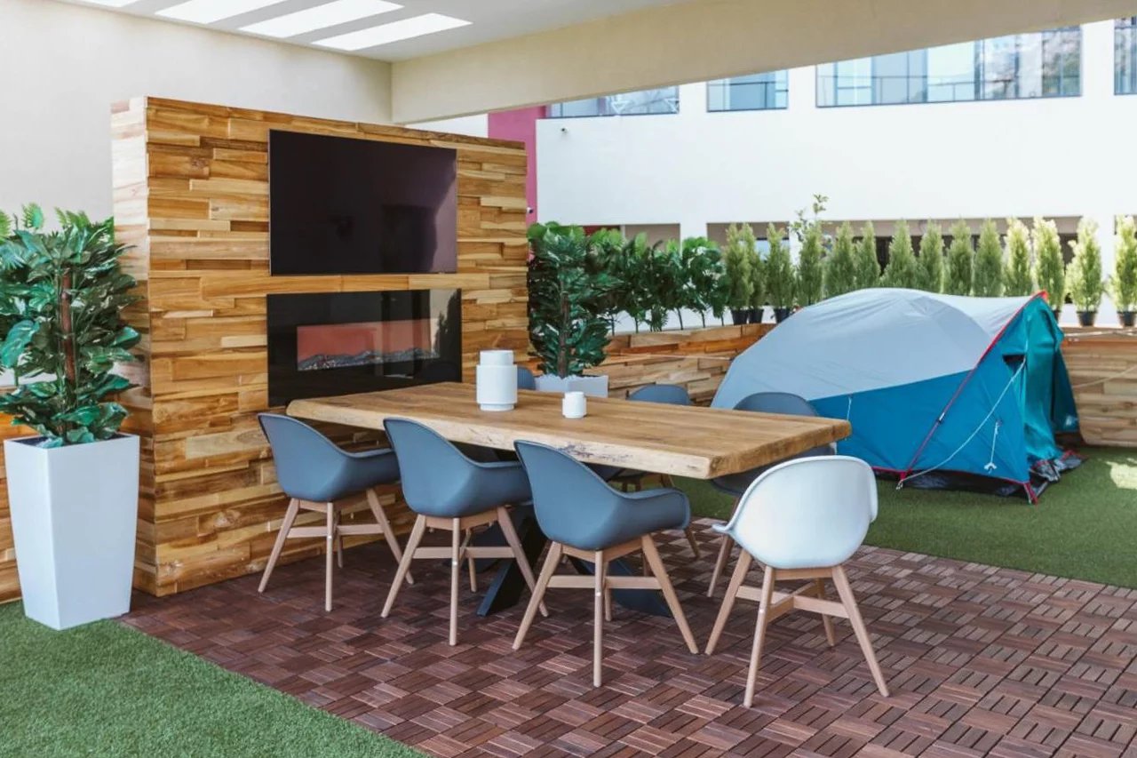 Inside is an electronic entry door with a keypad, a living room and dining area both opening onto the terrace, and a fully equipped American kitchen. Two bedrooms also open onto the terrace.