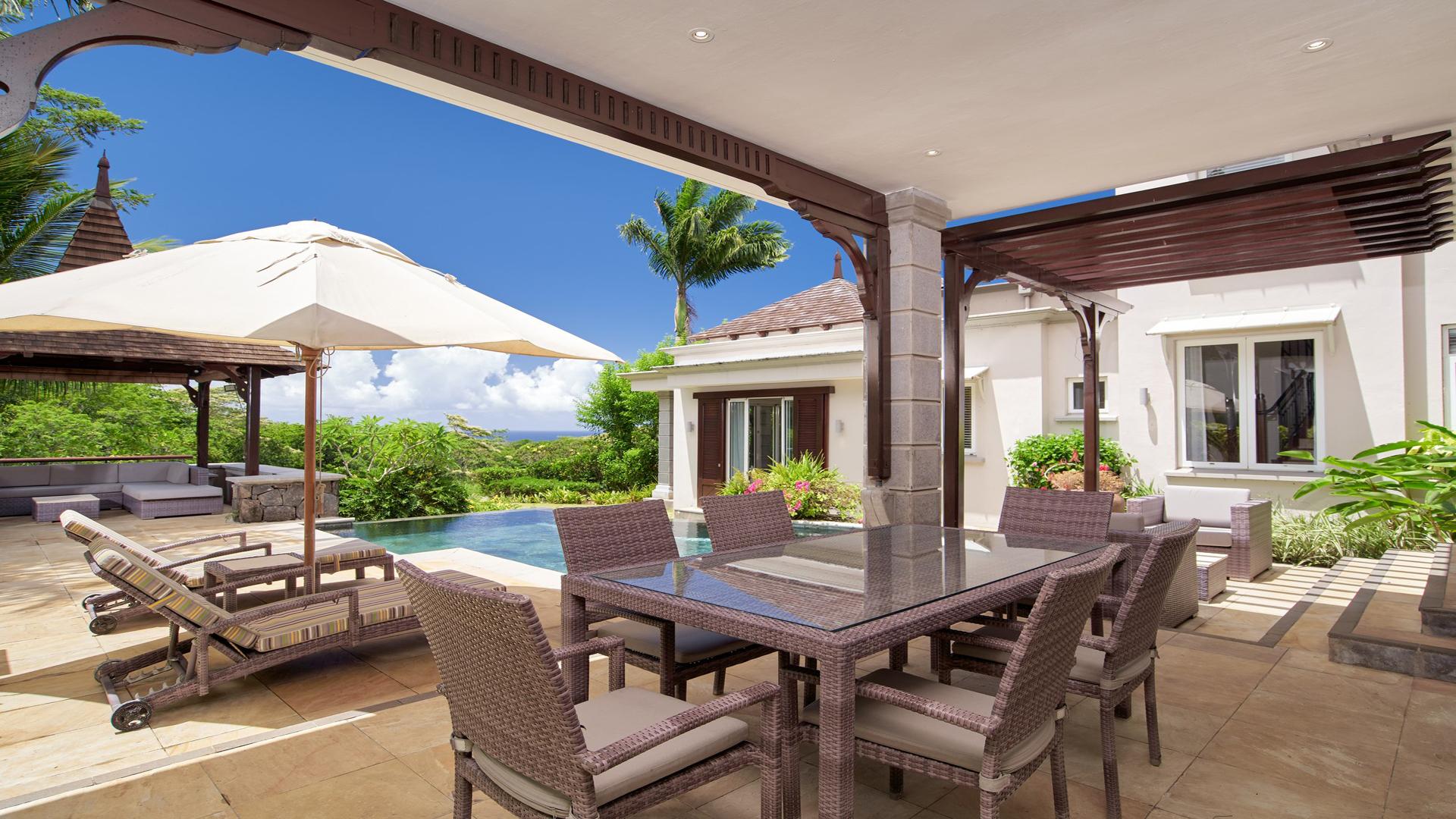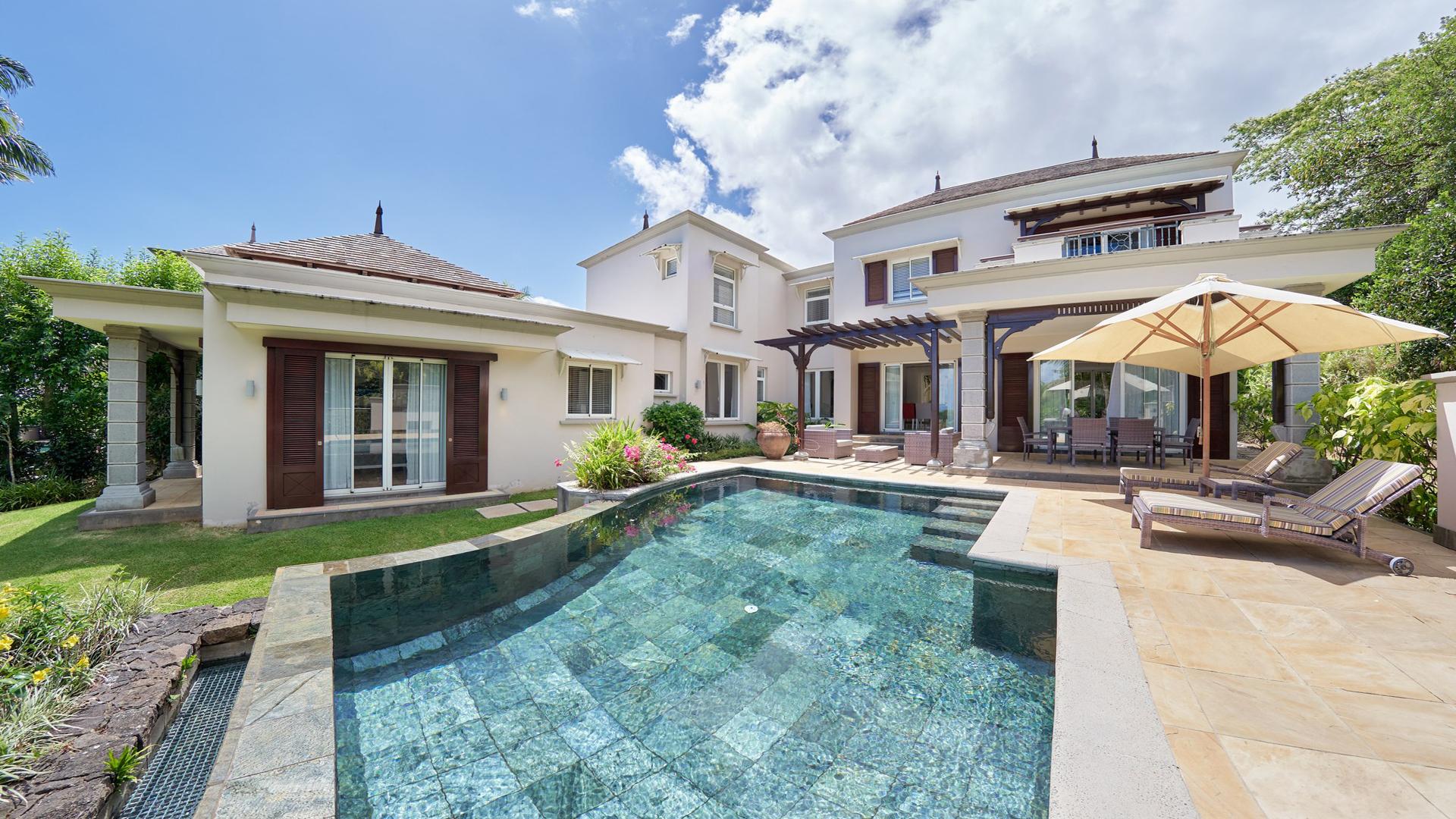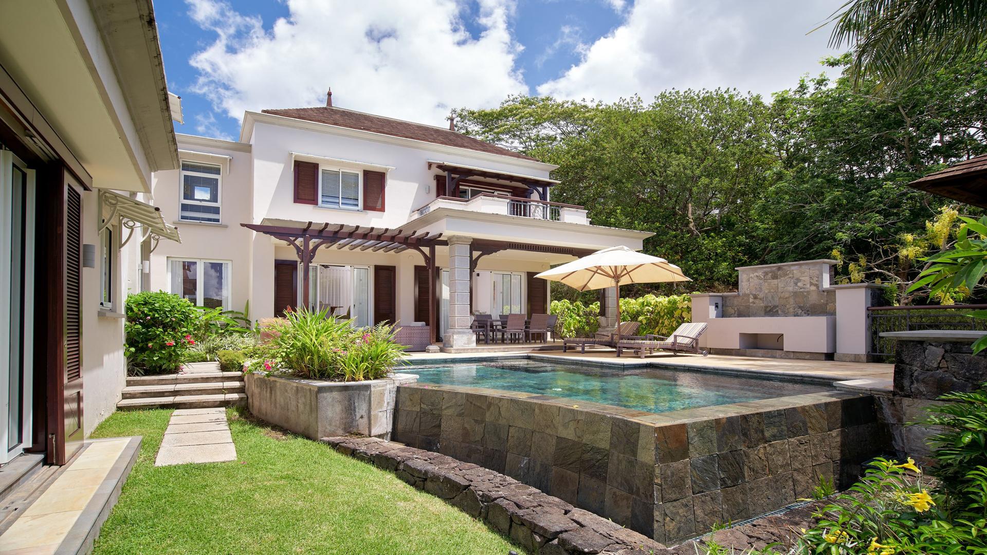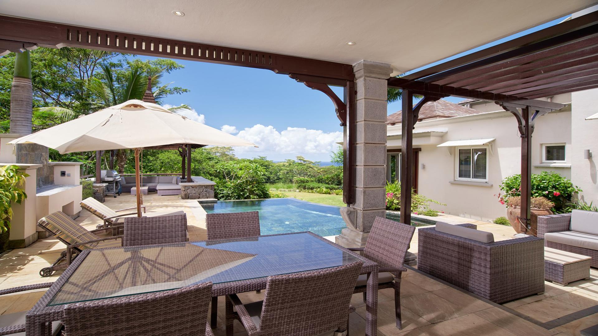 Live the lifestyle in this expansive 3-bedroom villa, and experience the quintessential ‘island paradise’ of the scenic South-West Coast of Mauritius. This luxurious 293 m² villa in the exclusive Domaine de Bel Ombre Golf & Beach Estate definitely offers an unsurpassed lifestyle. Allow us to walk you in. Inside, a grandiose open-plan living area, a fully-equipped, modern kitchen with beautiful teak finishes extends to an expansive outdoor terrace with a pool and gazebo, offering panoramic landscape and sea views. Moving to the first floor, you will have large bedrooms with balconies and well-appointed bathrooms. Practical, a separate guest suite is also on offer. For leisure, there is a 4-seater golf cart at your disposal for your round of golf on the 18-hole championship golf course, and those who enjoy outdoor activities can make use of the tennis courts, riding stables, and scenic running/cycling paths, as well as the array of hotel facilities and restaurants on your doorstep. The property is available furnished and immediately. Contact us for a visit.