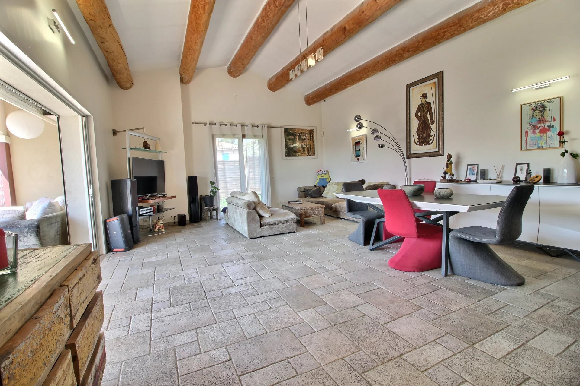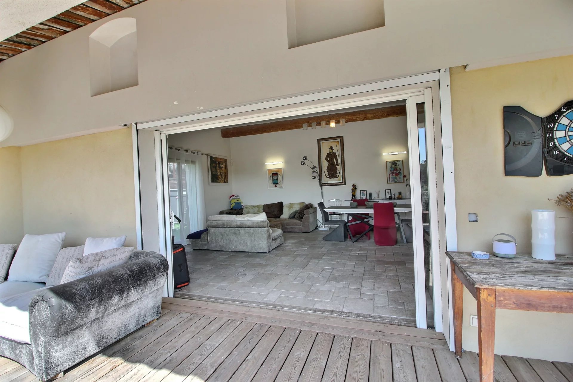 Spacious and bright, it comprises a large living room with open-plan kitchen, 3 bedrooms including a master suite with terrace overlooking the hills, a double garage with a 40 m2 converted space perfect for teenagers or an office.