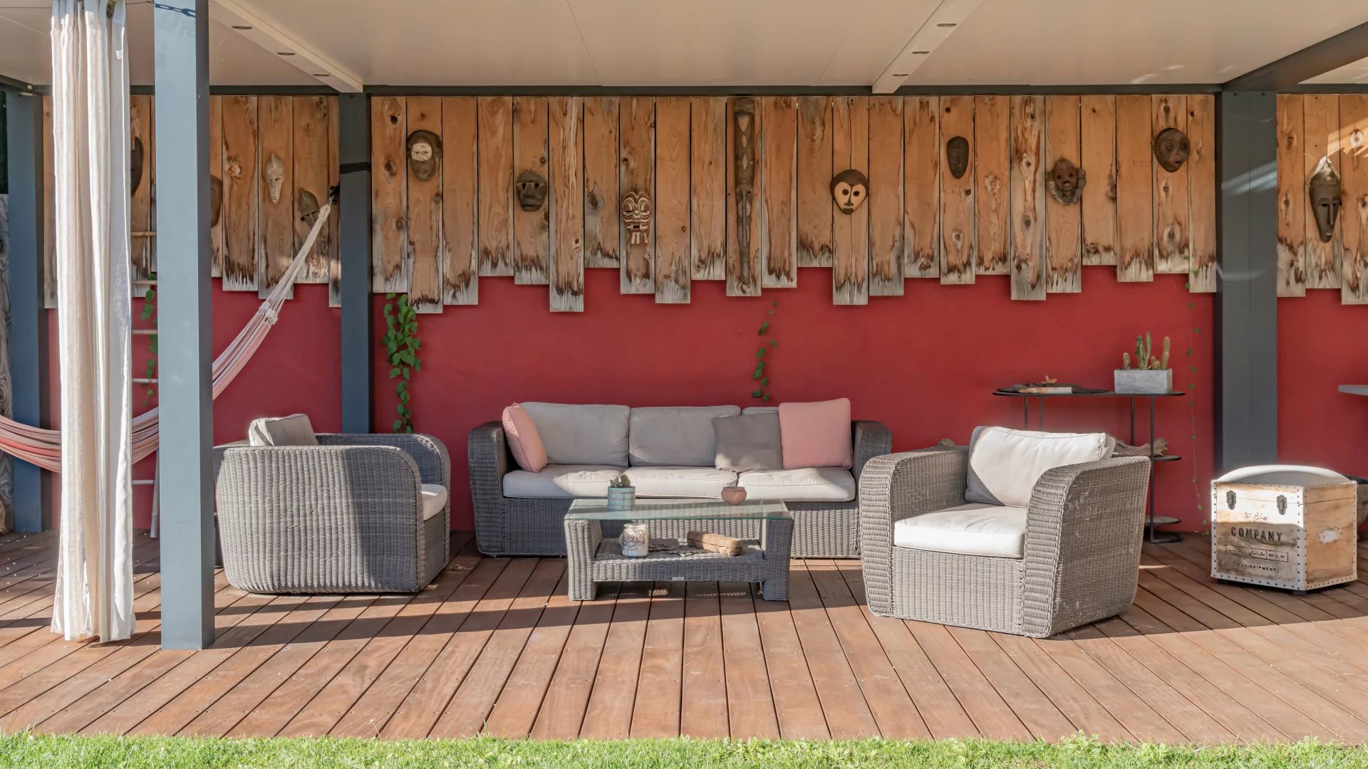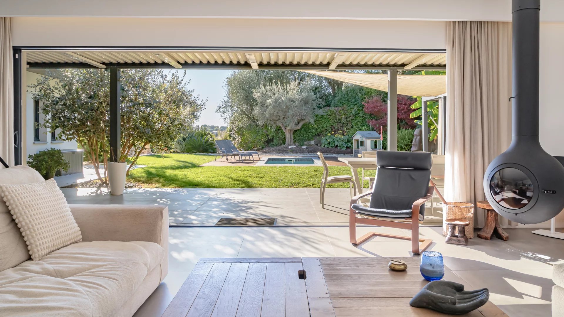 The spacious open-plan living area, featuring a modern suspended wood burner, offers lovely views and direct access to the outdoor entertaining spaces and large covered terrace. The seamless flow continues into the fully equipped open-plan kitchen, ideal for both everyday living and hosting.