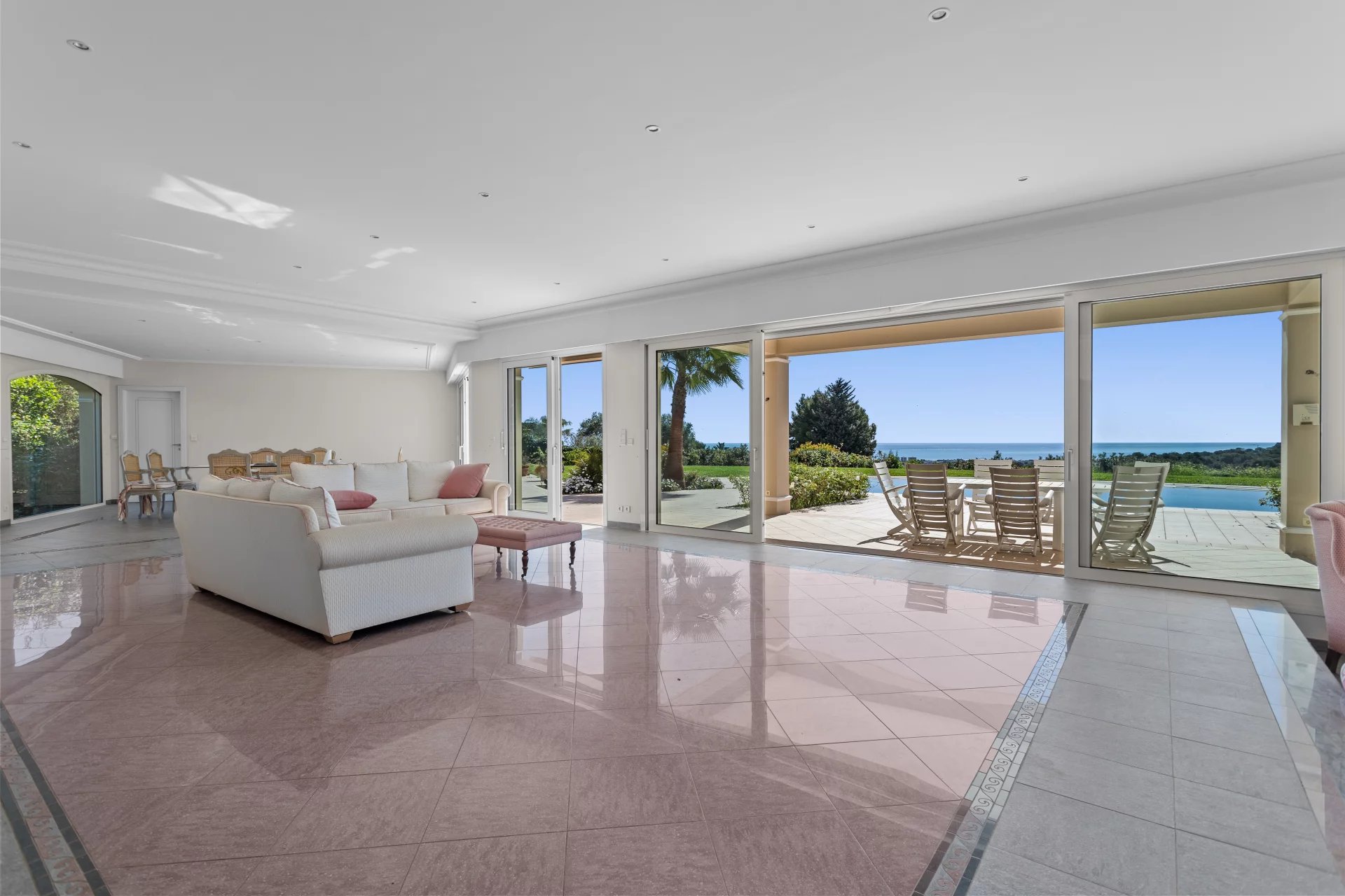 The superb 4,864 m2 flat fully enclosed garden features a heated infinity pool, providing an idyllic setting.